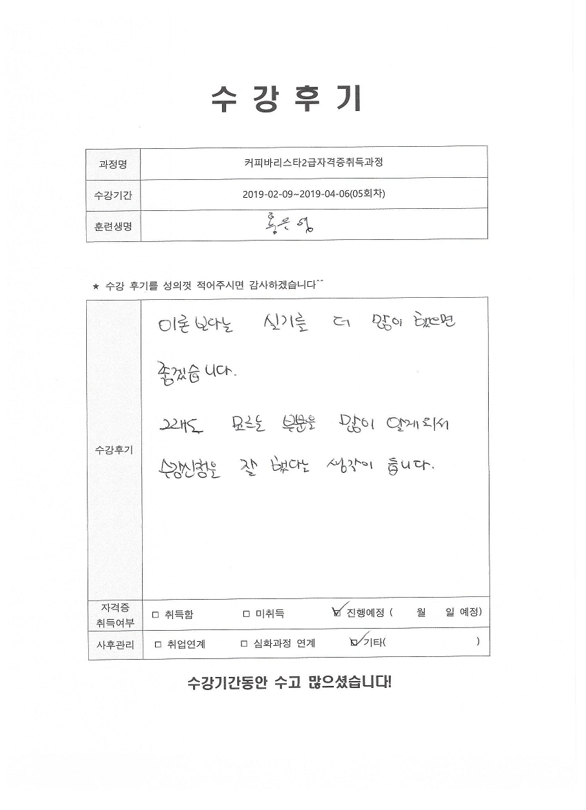 커피바리스타2급자격증취득과정 5회차 수강평