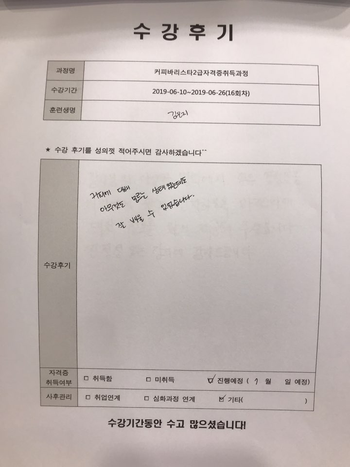 커피바리스타2급자격증취득과정(16회차)수강평