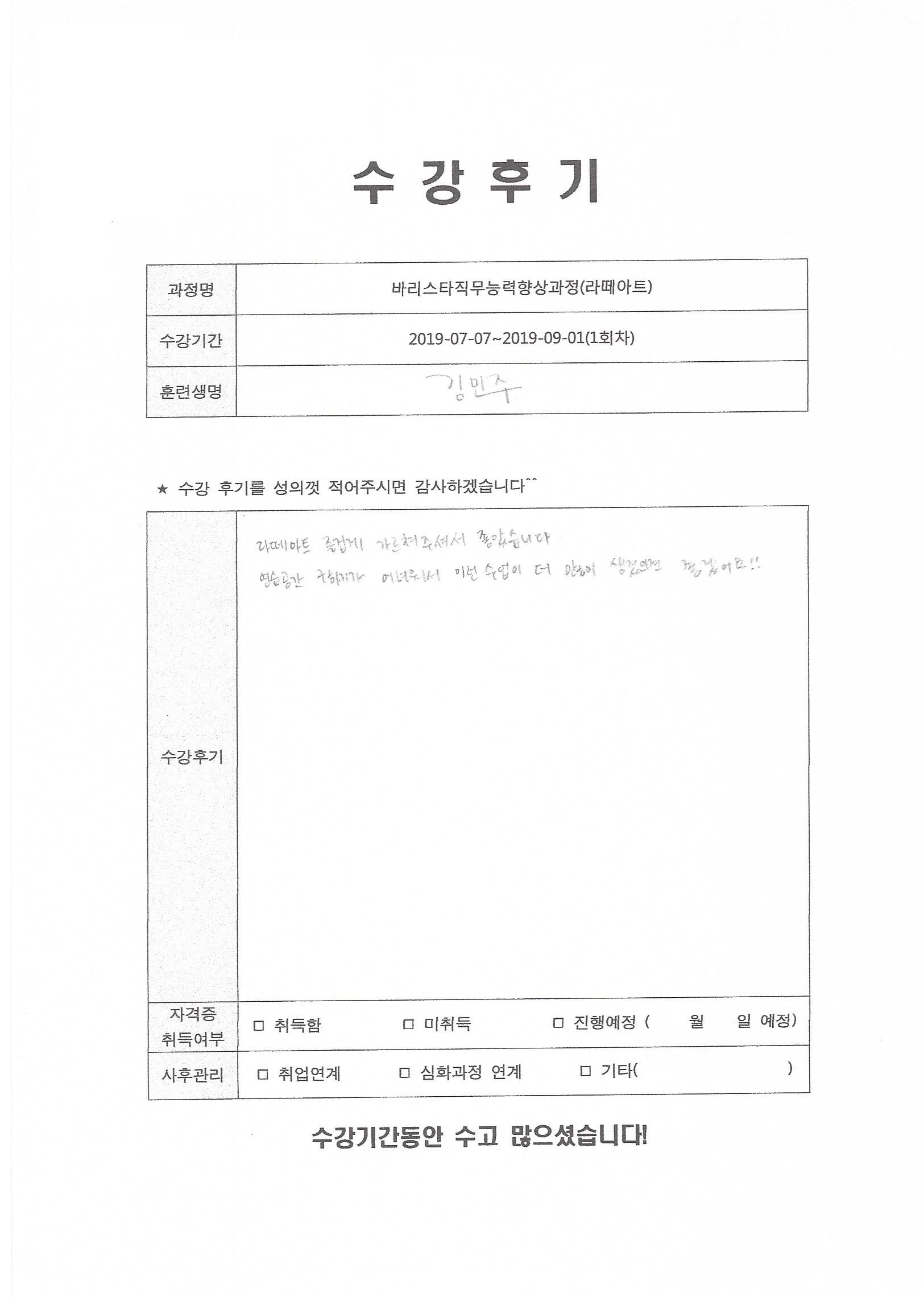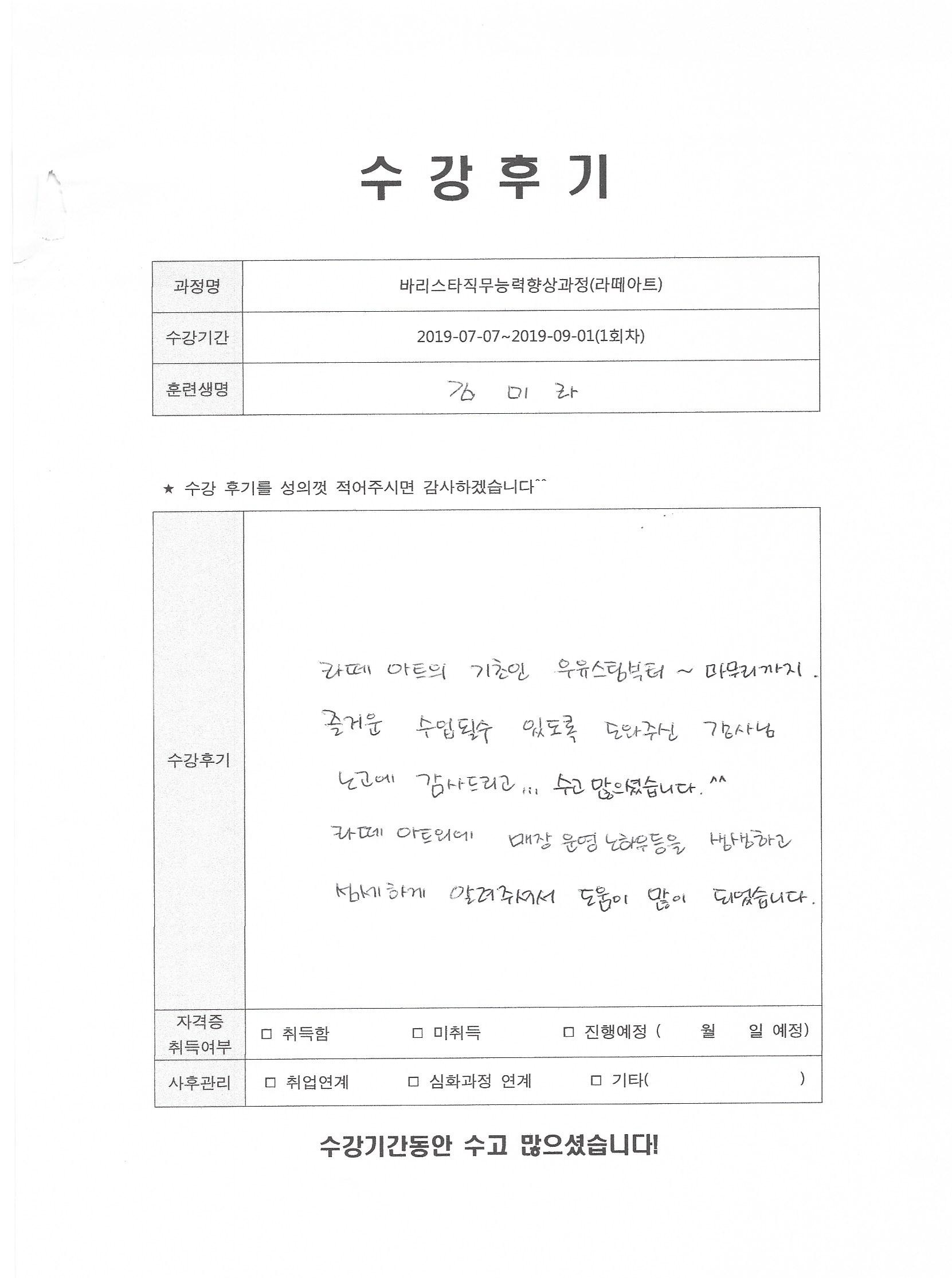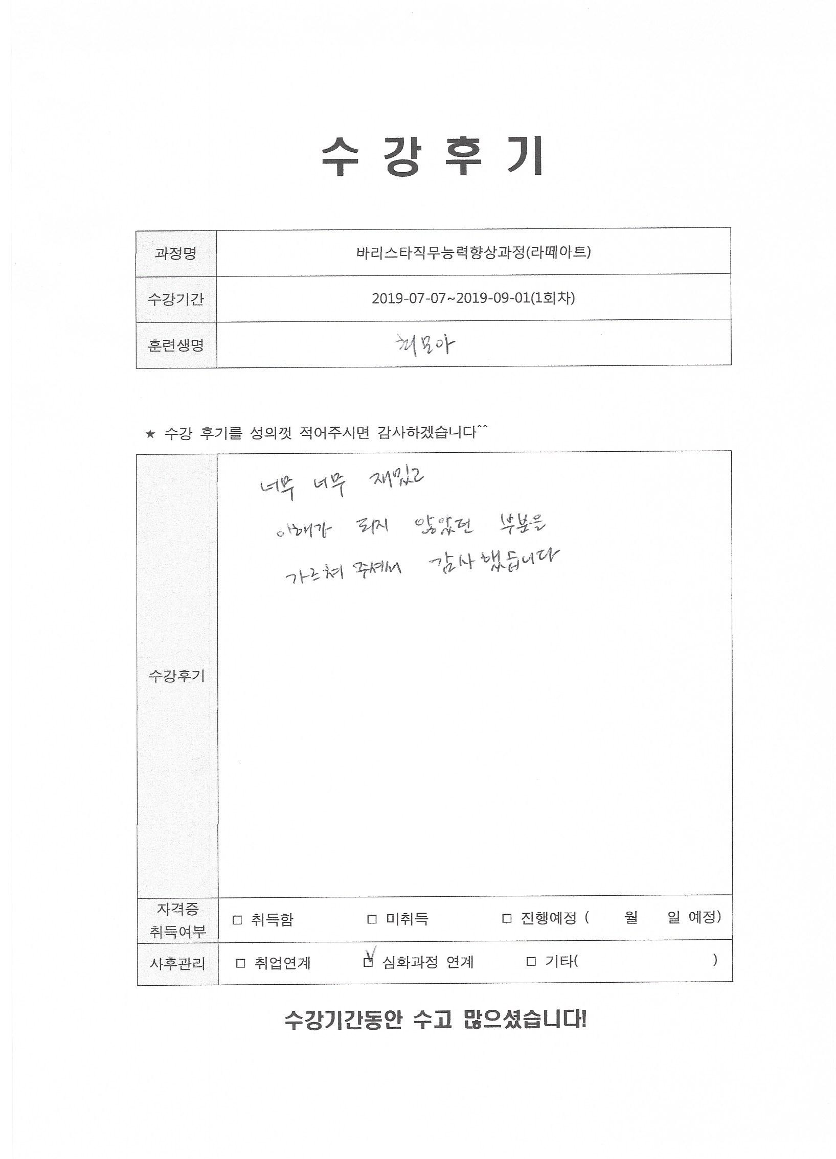 바리스타직무능력향상과정(라떼아트)(1회차)수강평