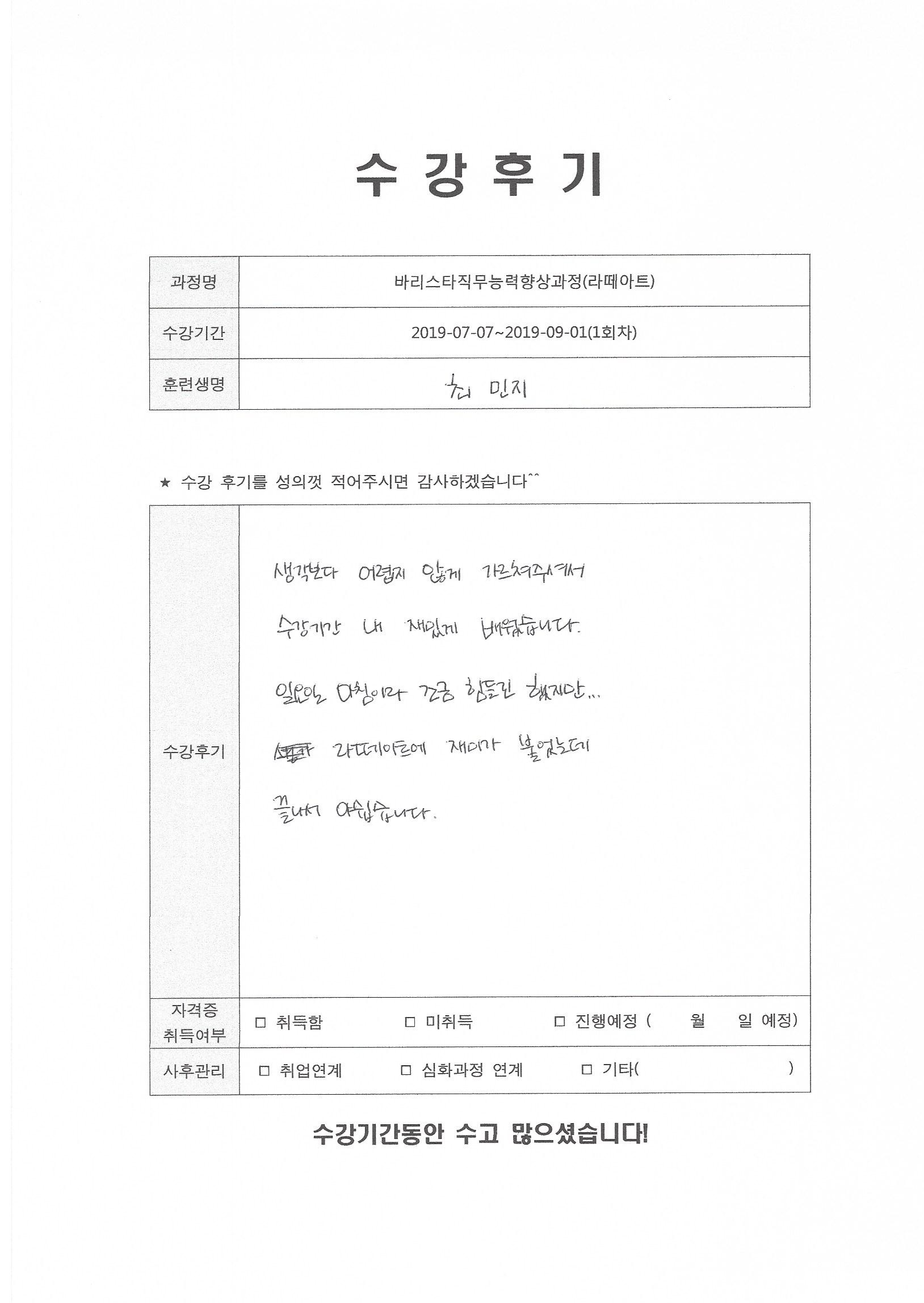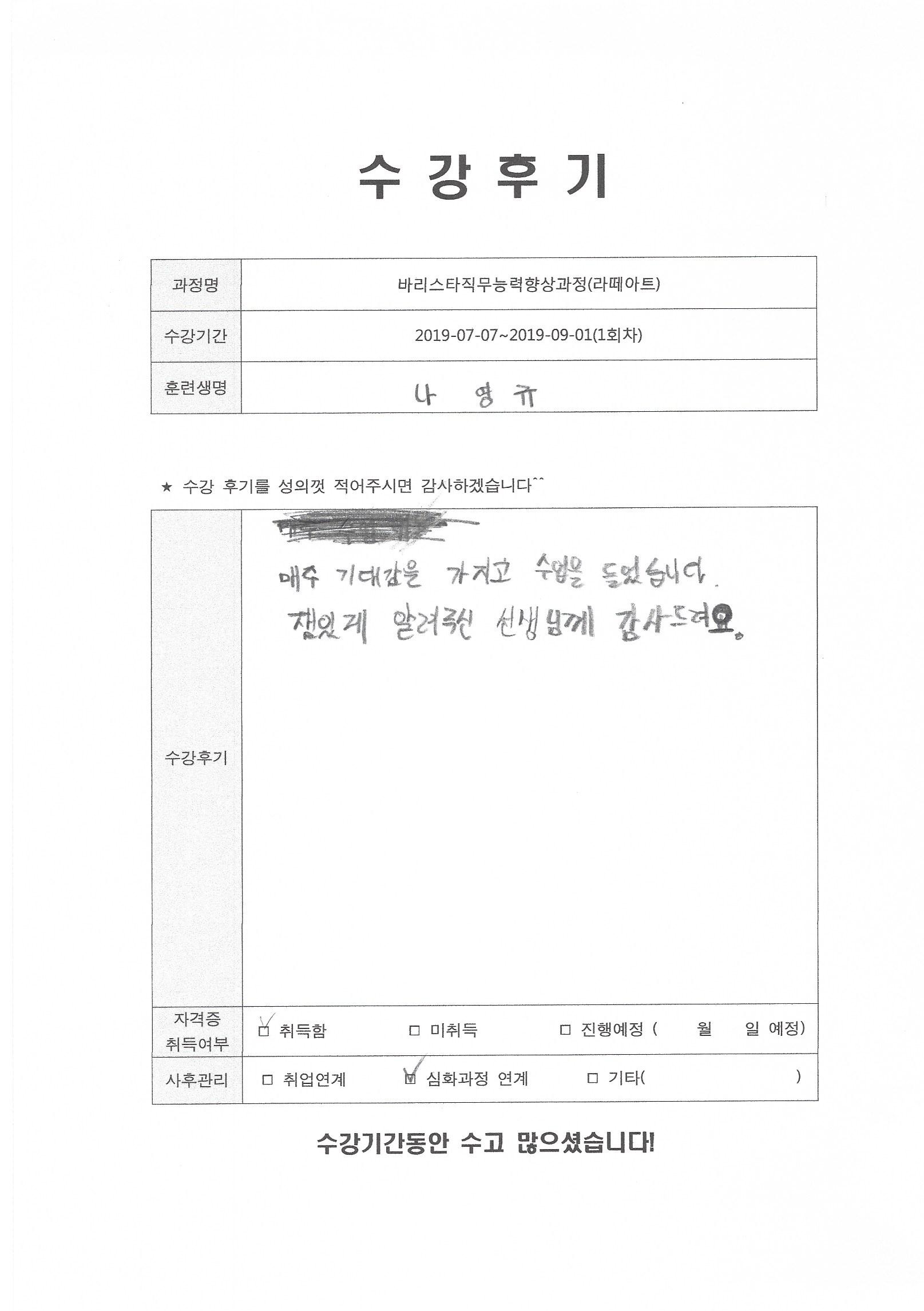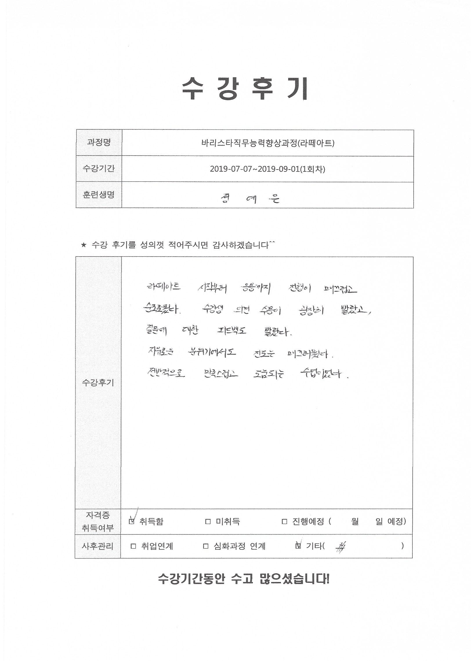 바리스타직무능력향상과정(라떼아트)(1회차)수강평