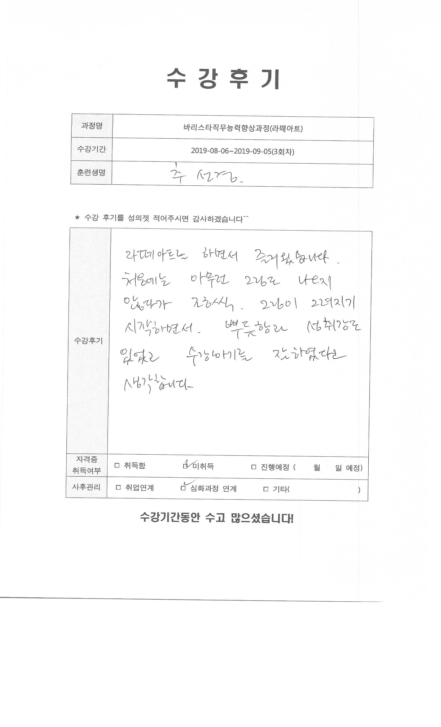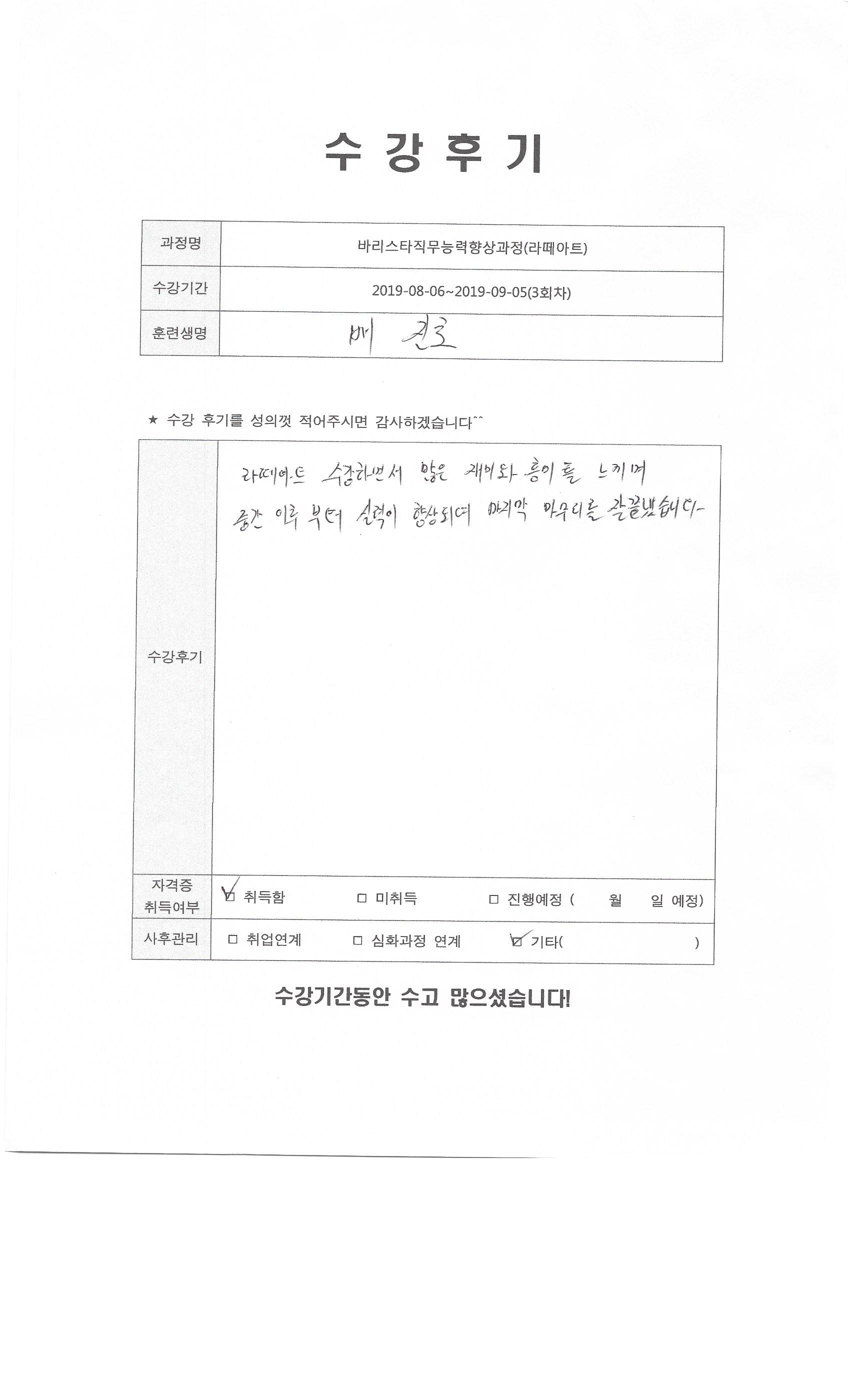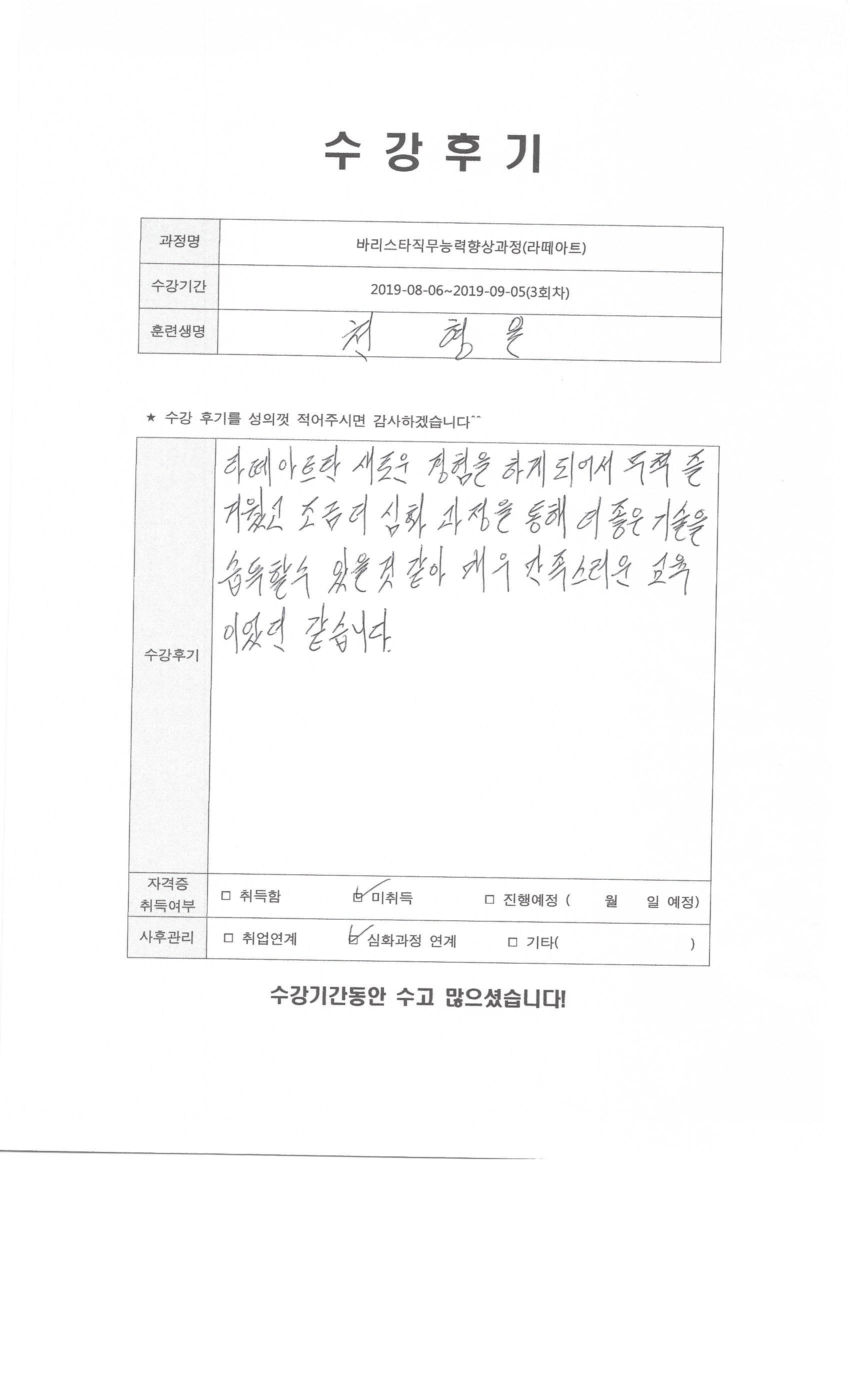바리스타직무능력향상과정(라떼아트)(3회차)수강평