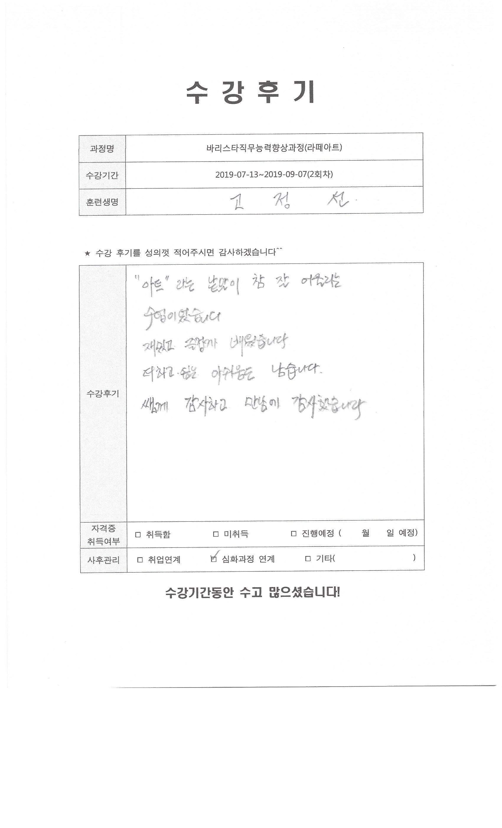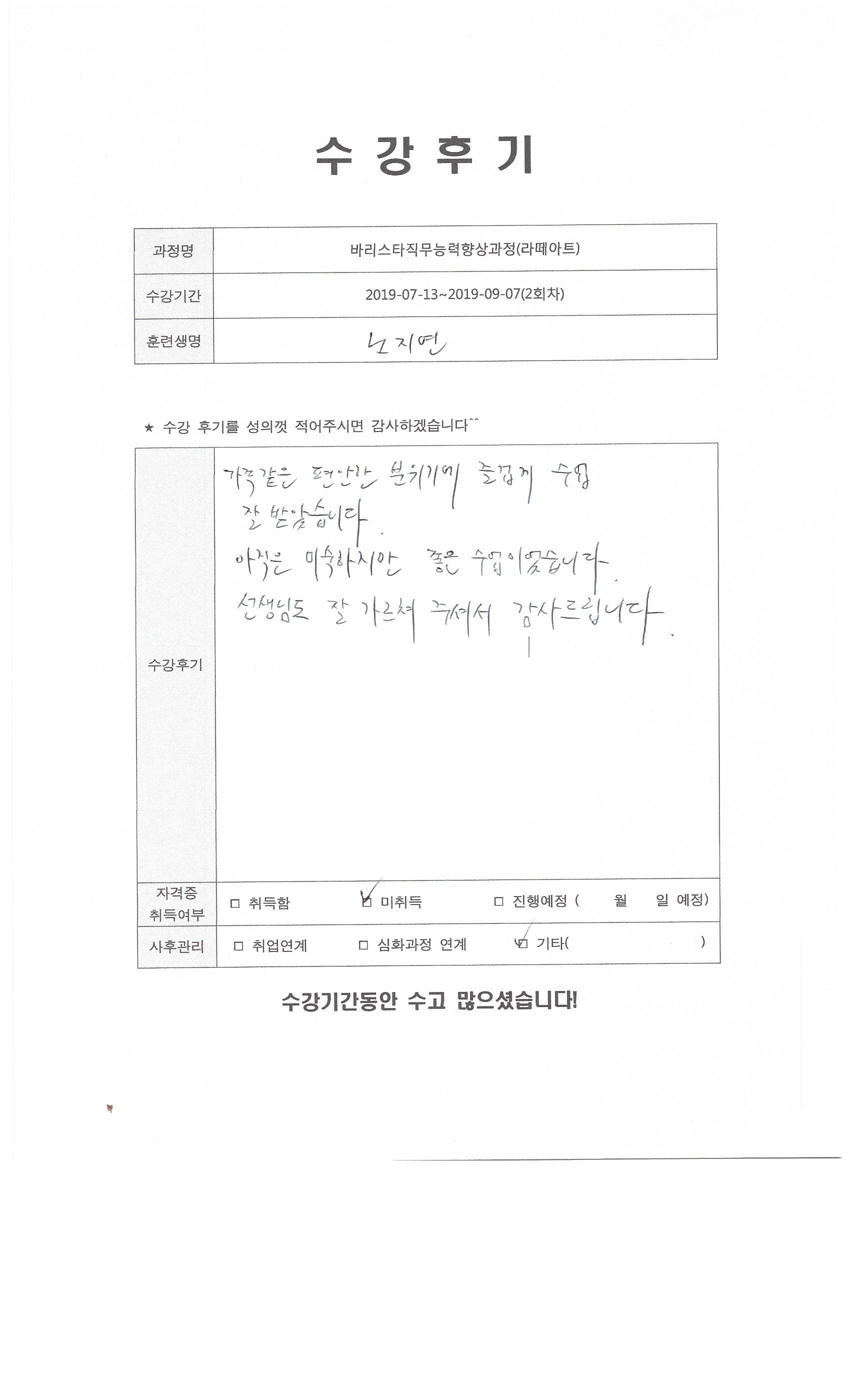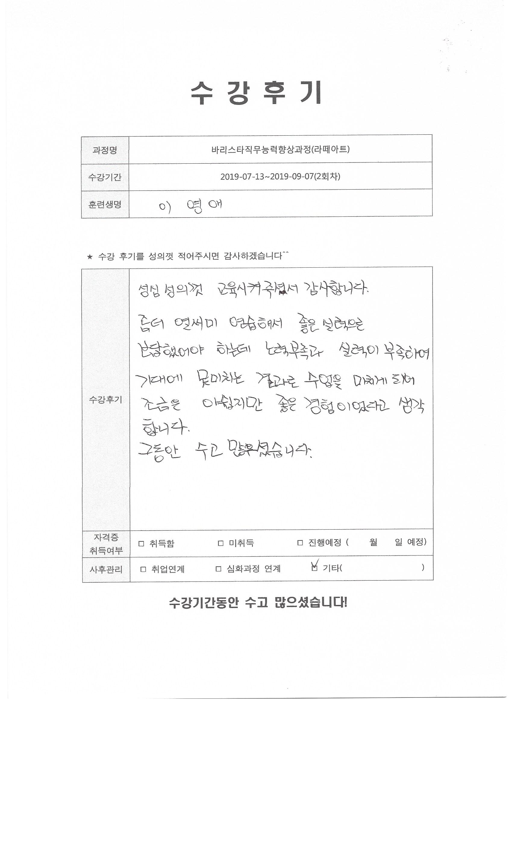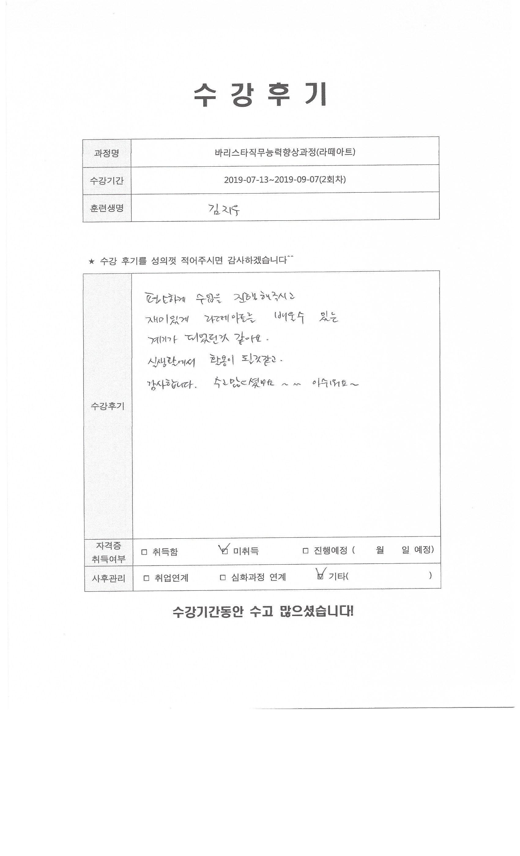 바리스타직무능력향상과정(라떼아트)(2회차)수강평