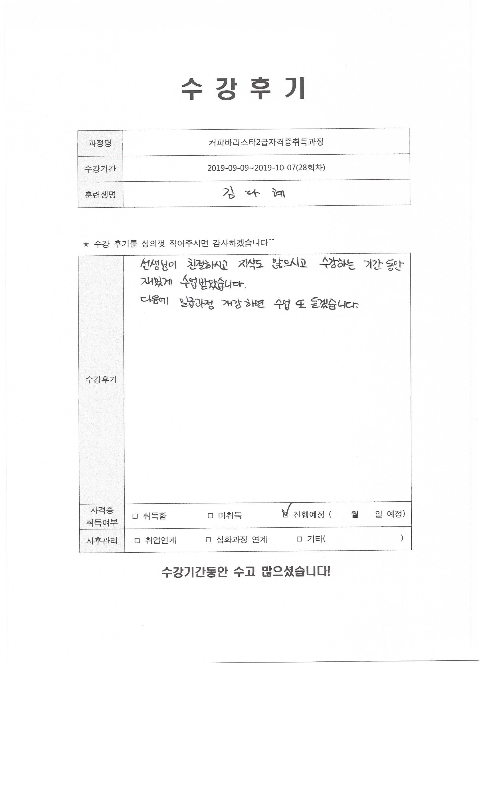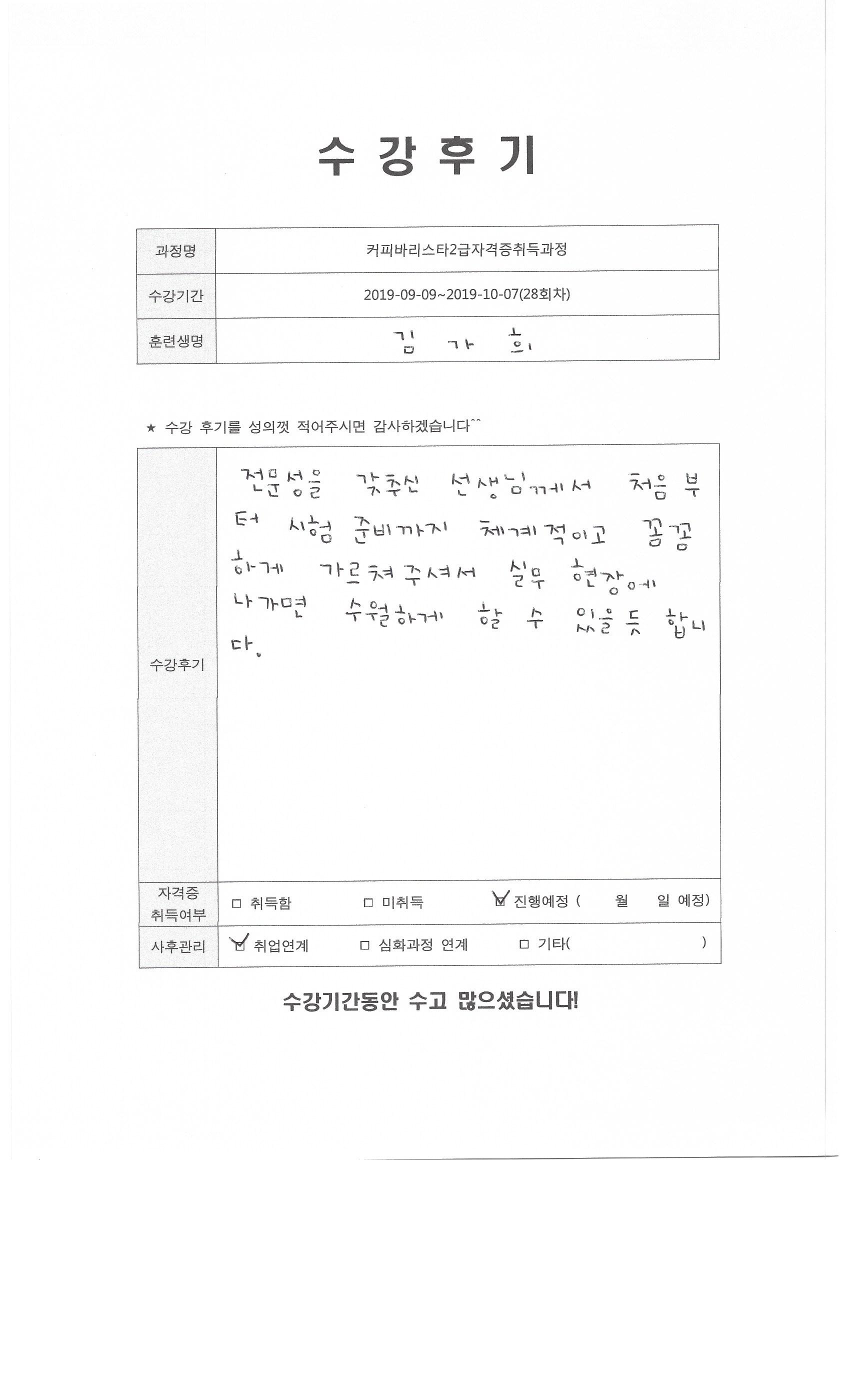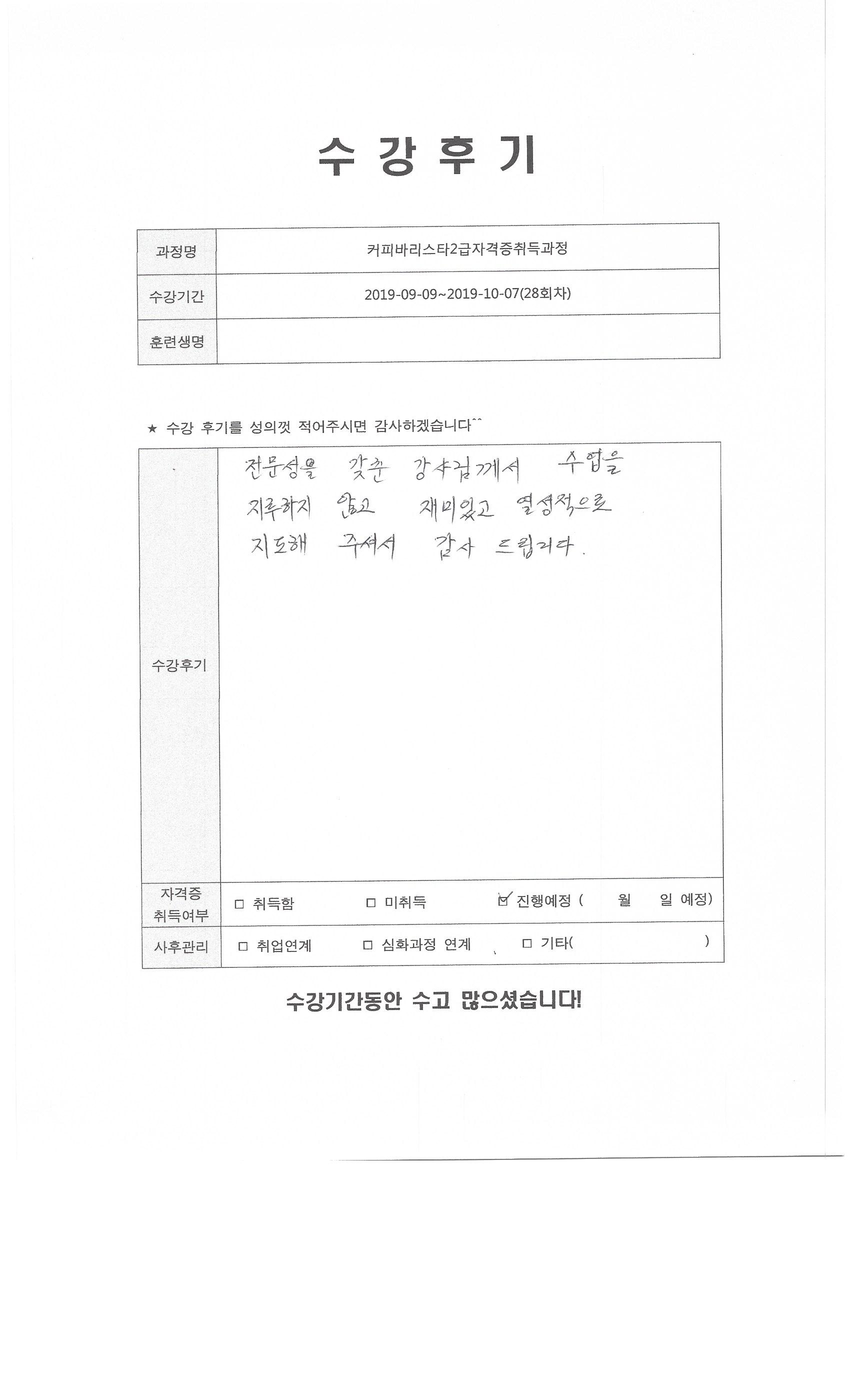 커피바리스타2급자격증취득과정(28회차)수강평
