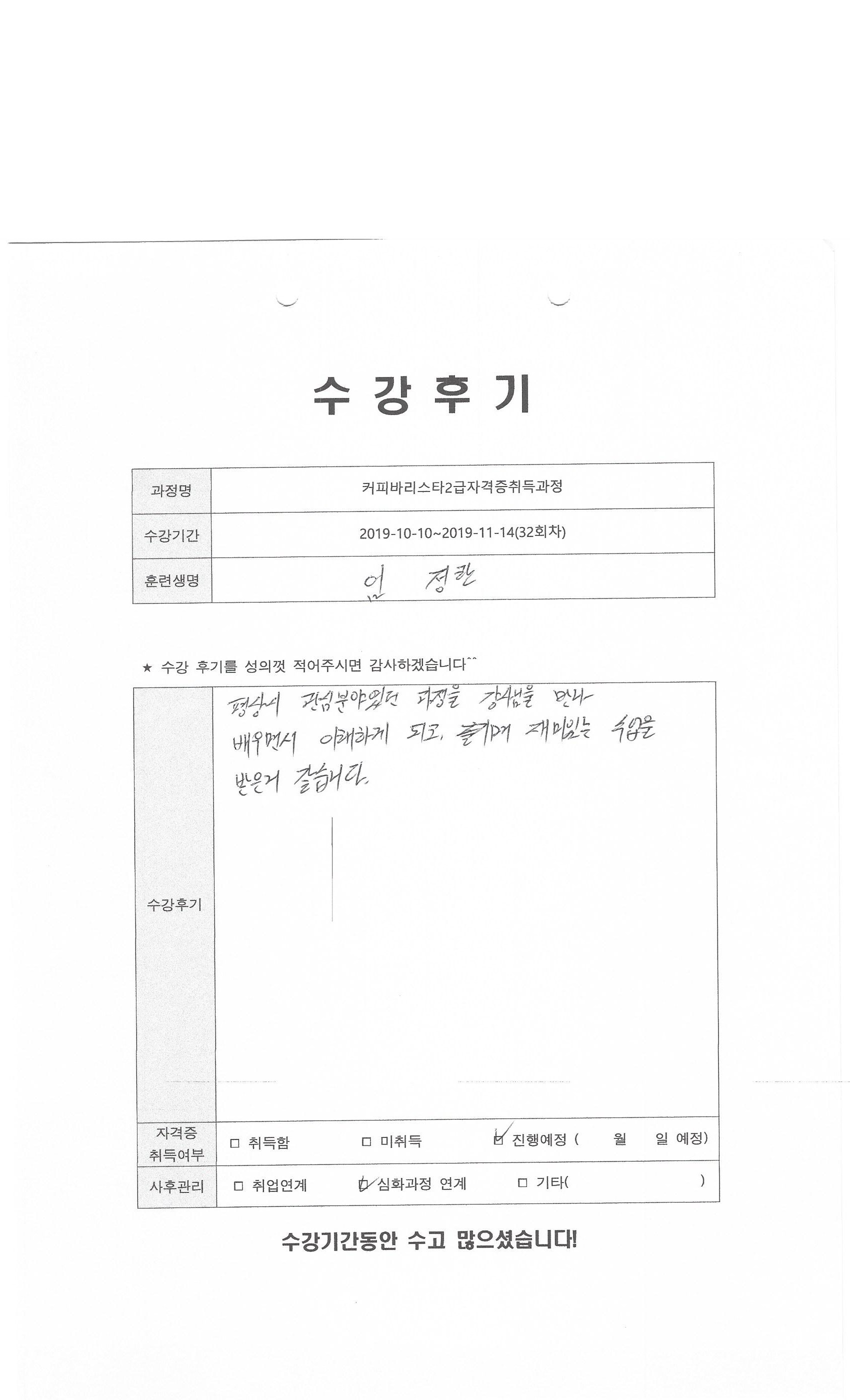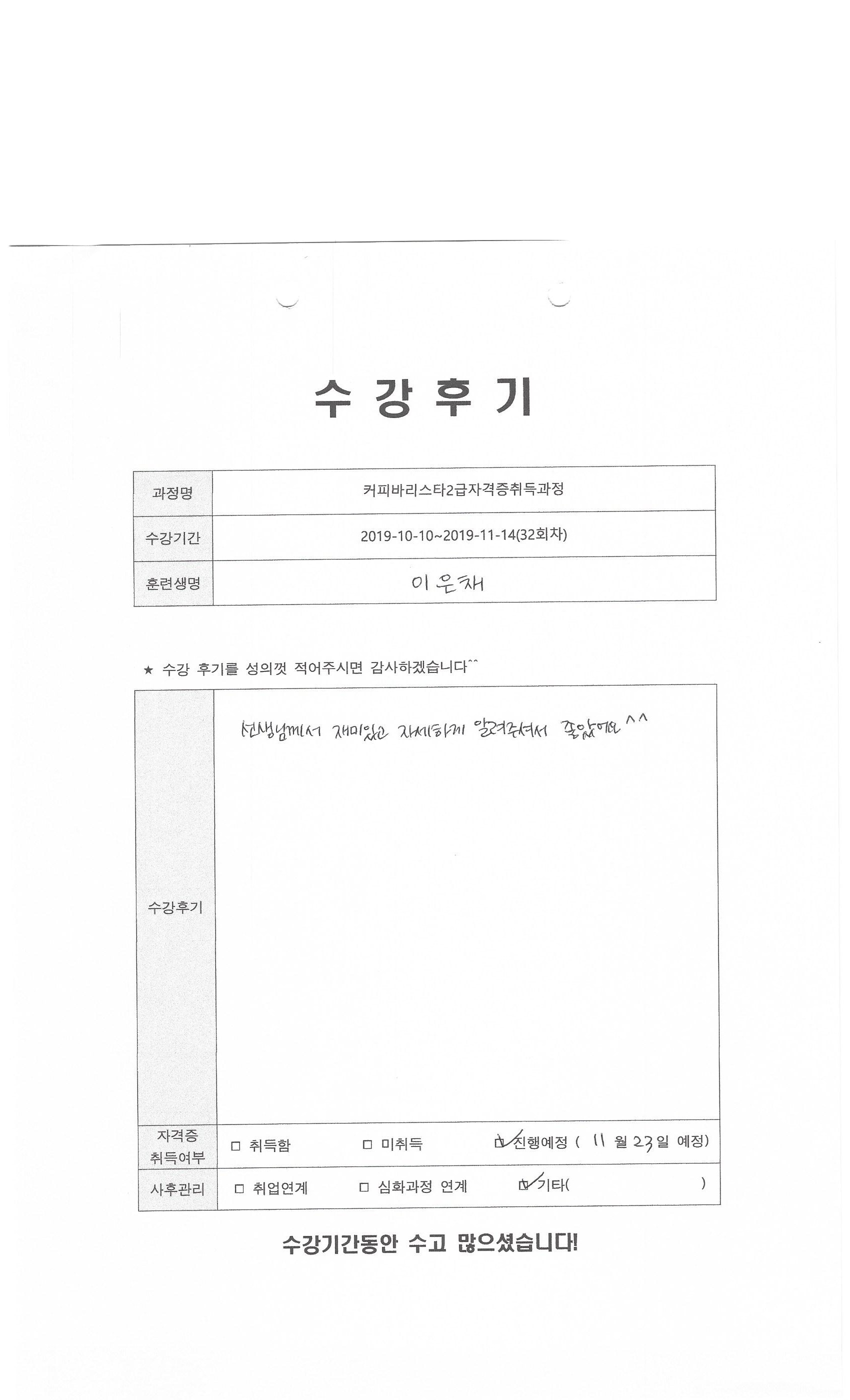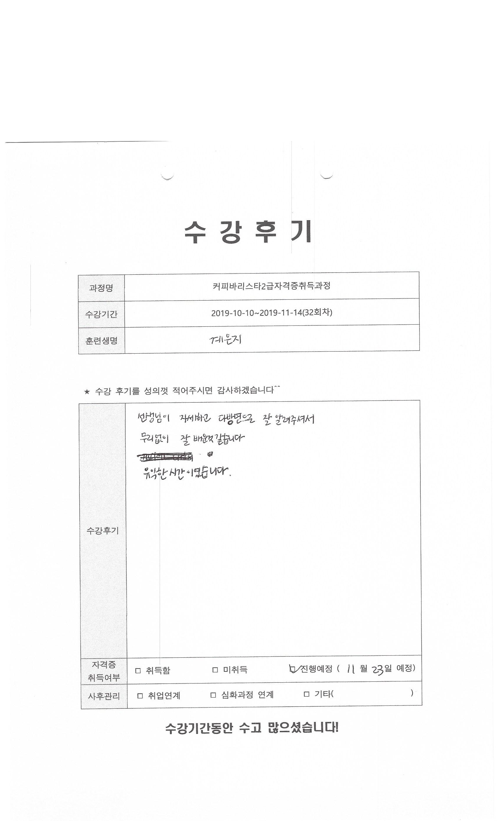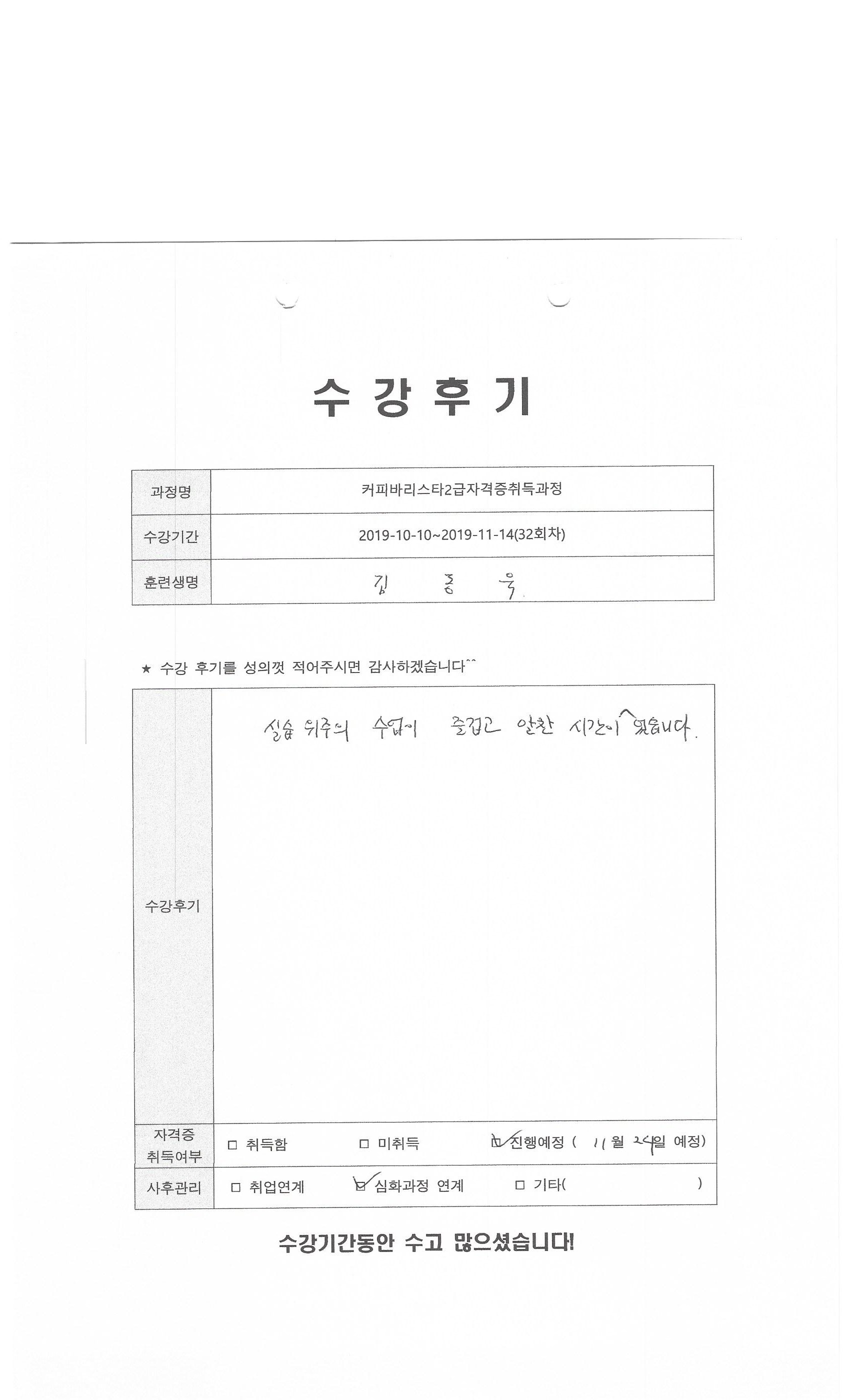 커피바리스타2급자격증취득과정(32회차)수강평