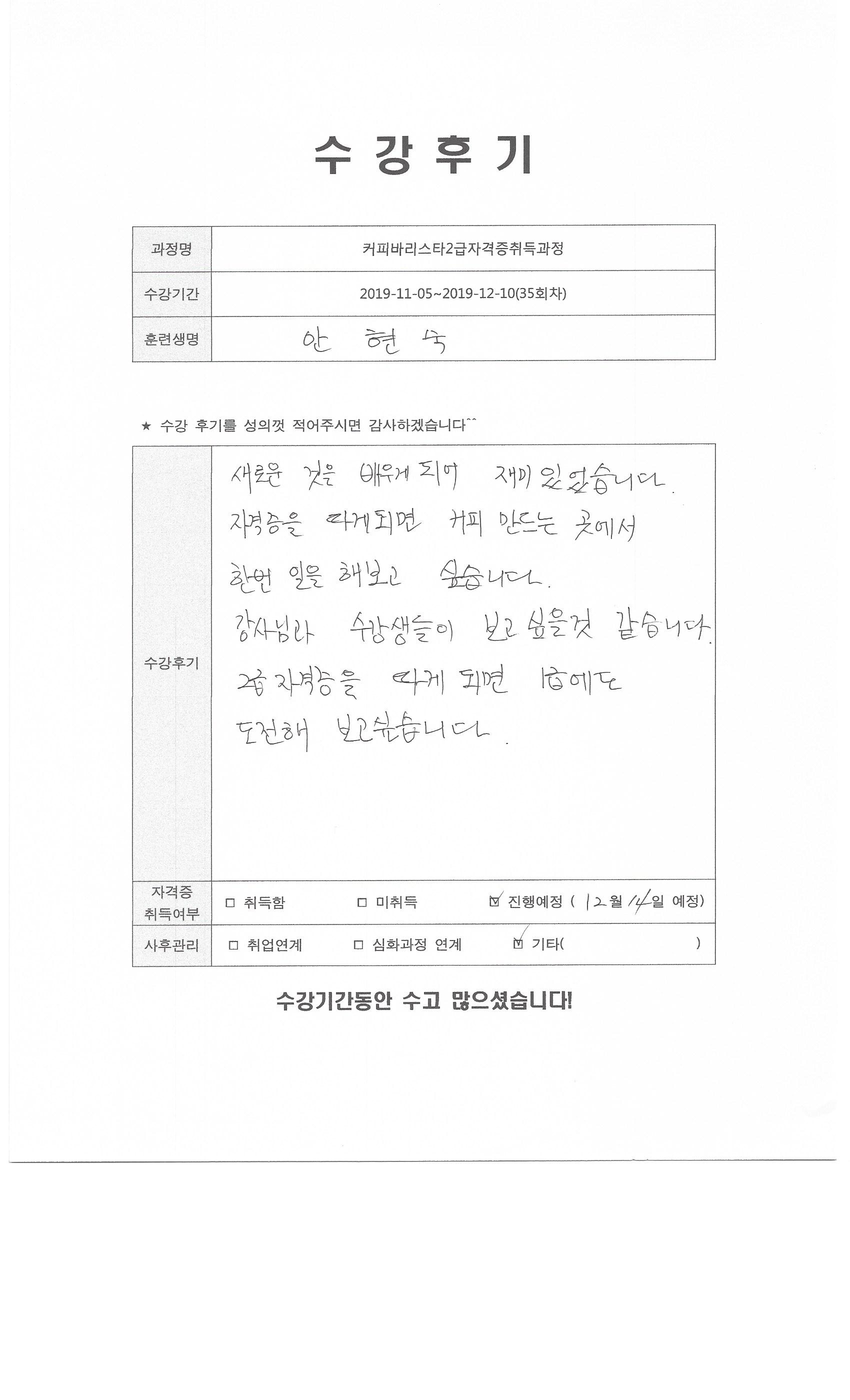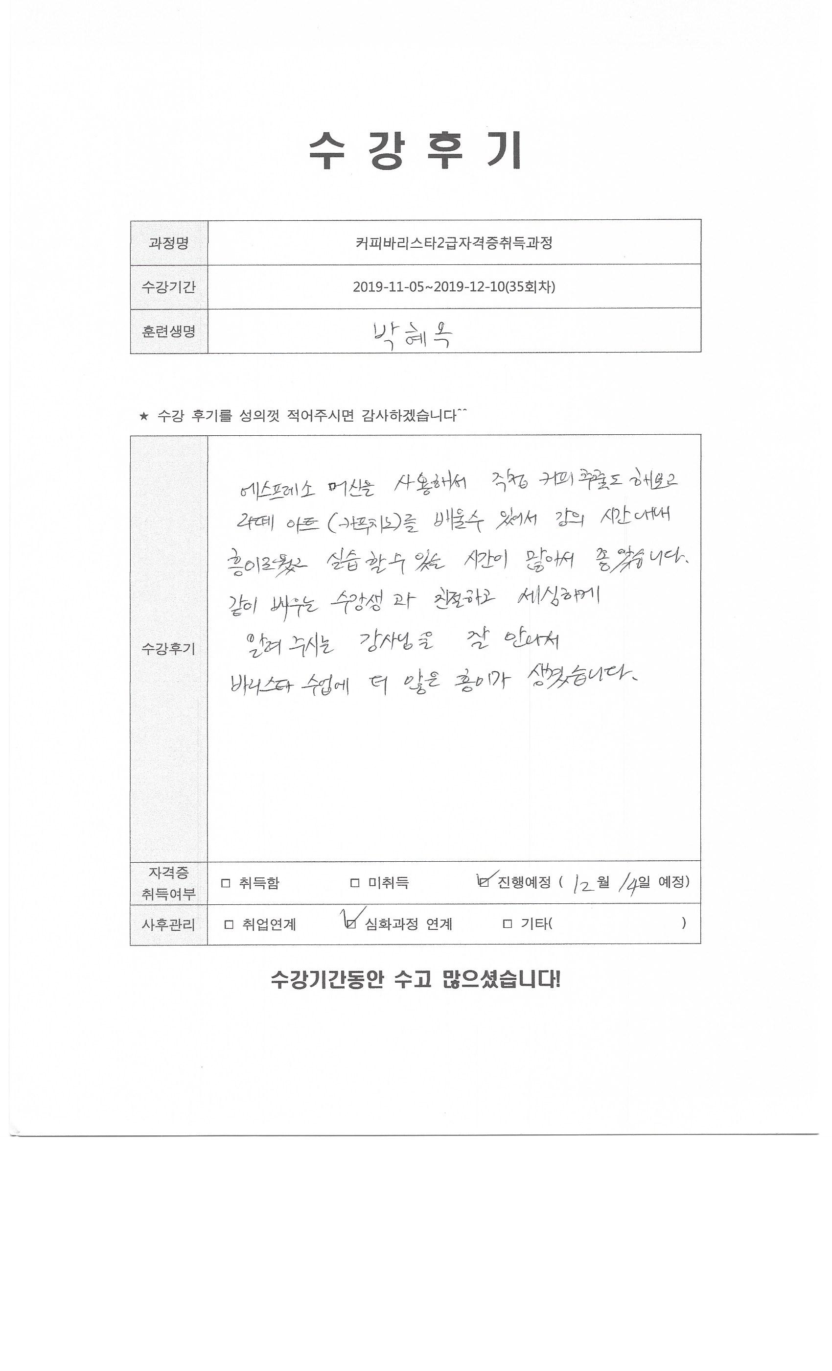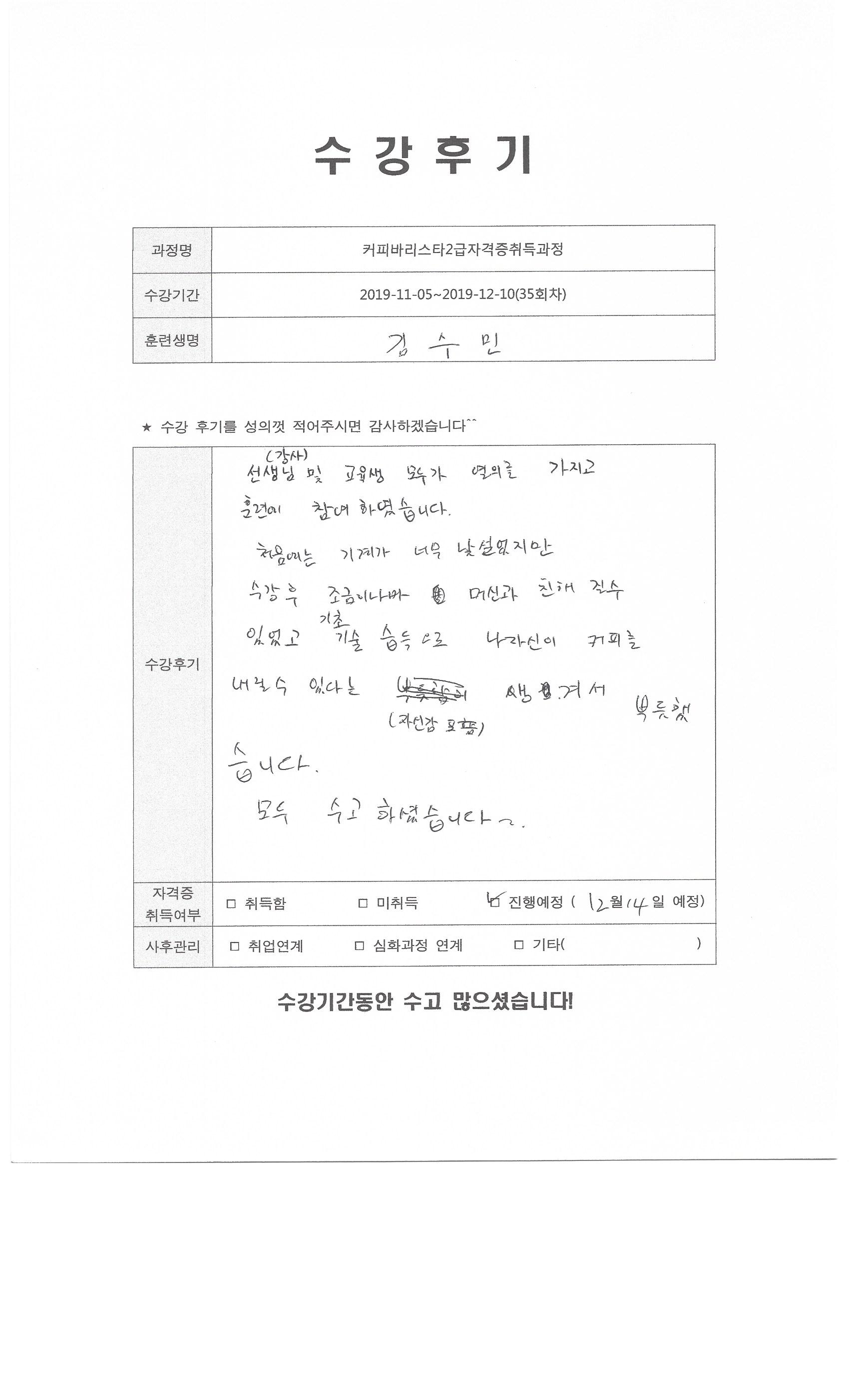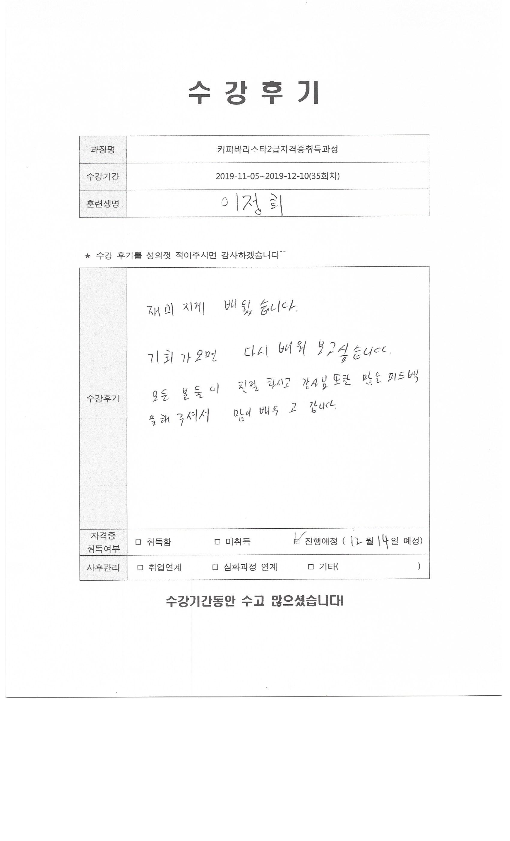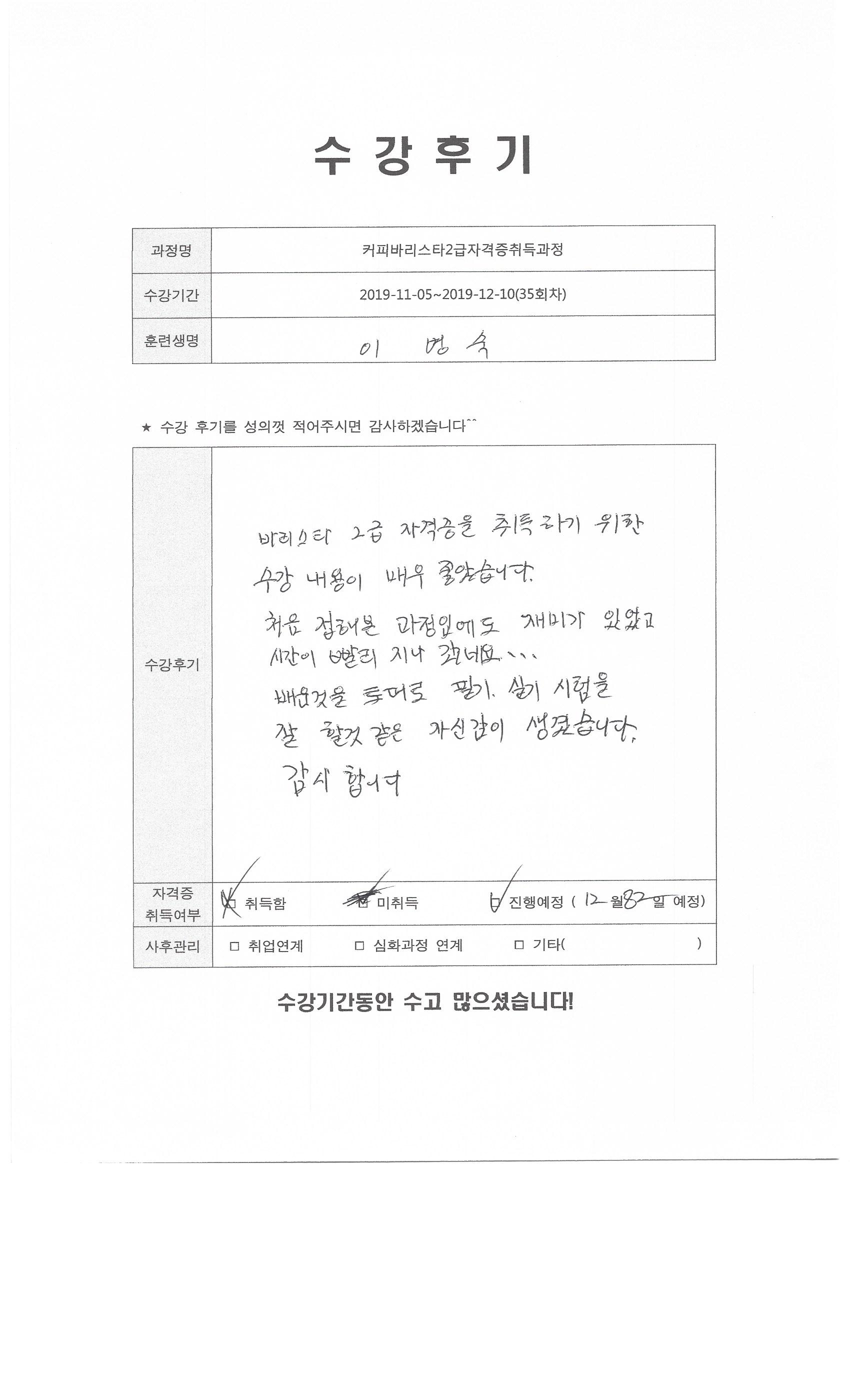커피바리스타2급자격증취득과정(35회차)수강평