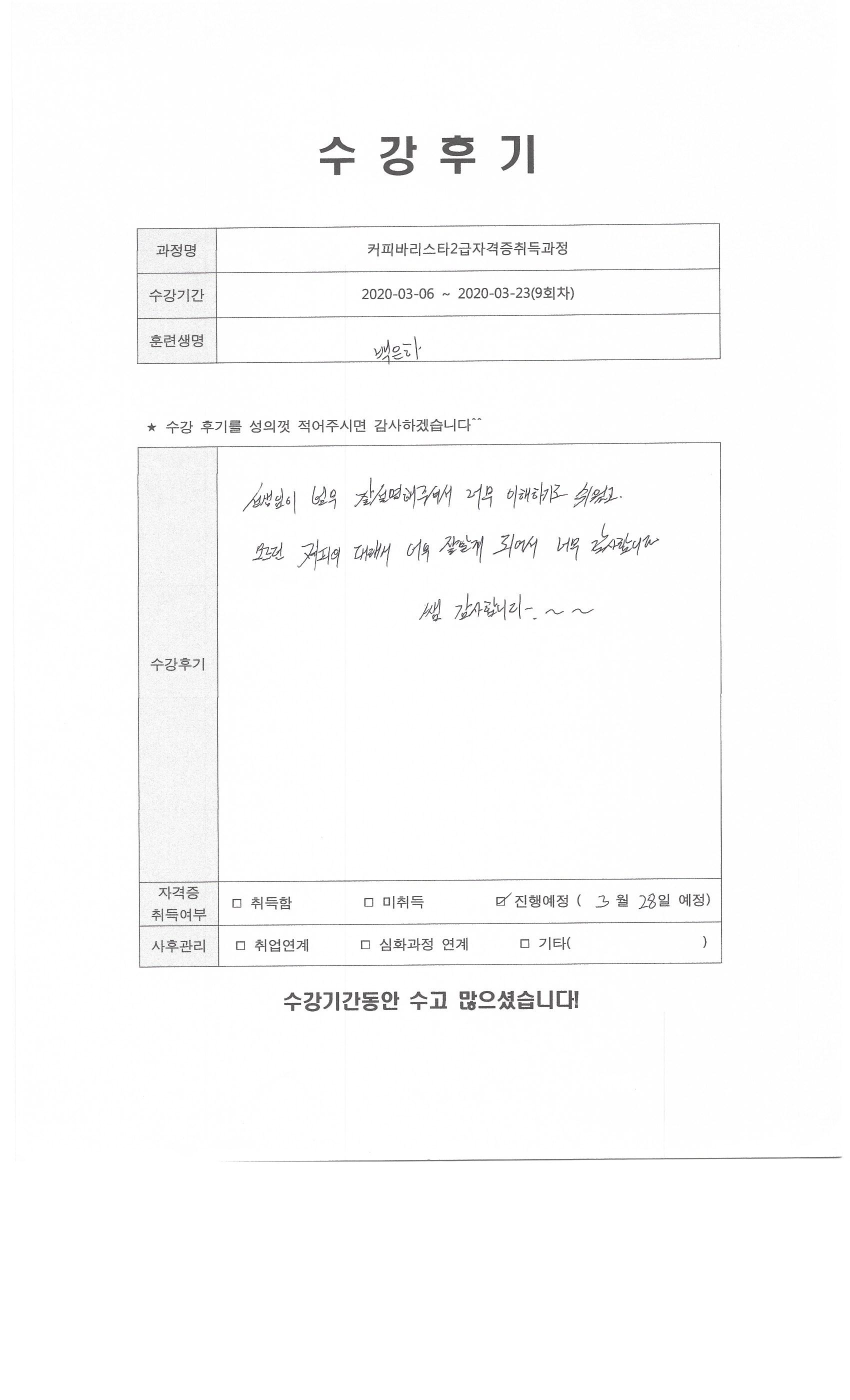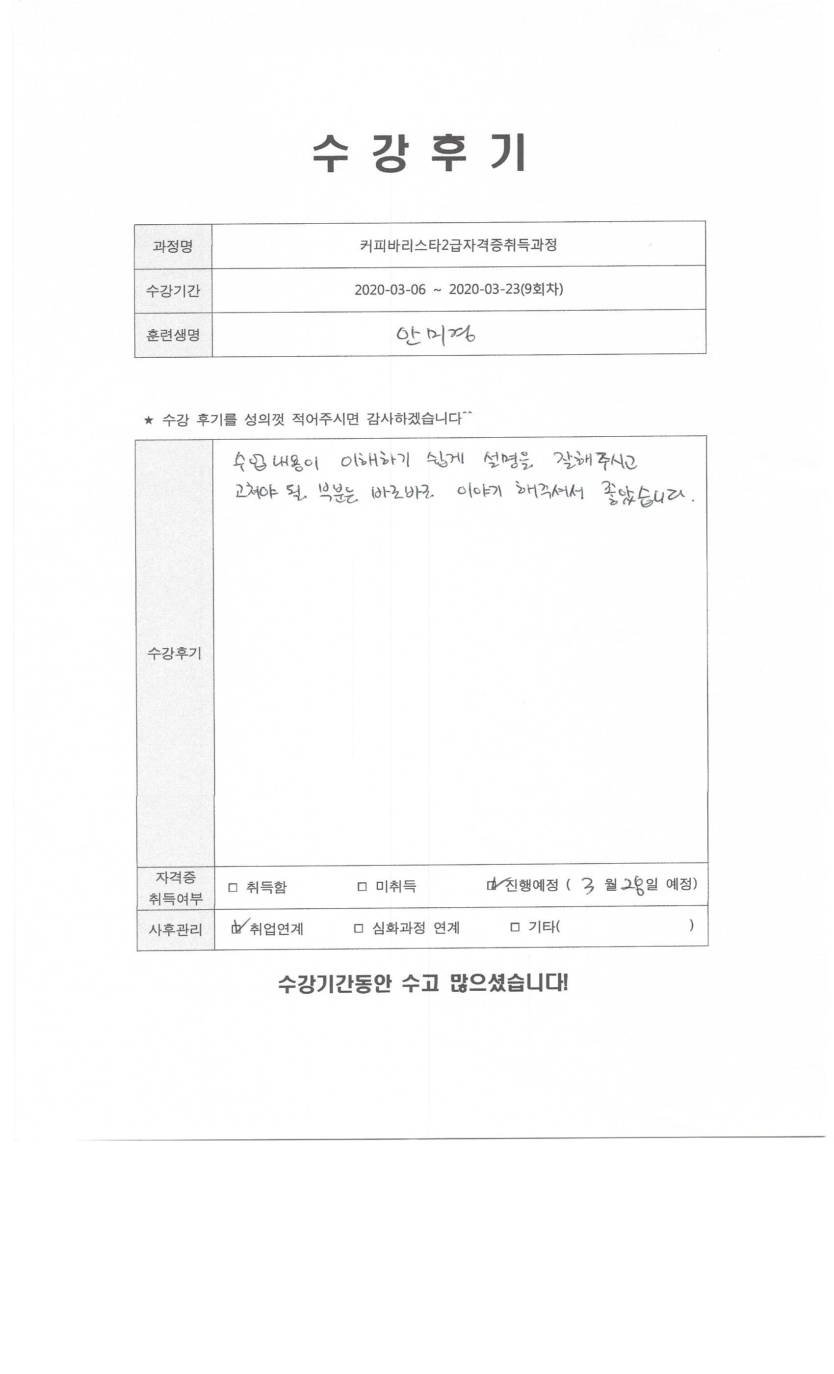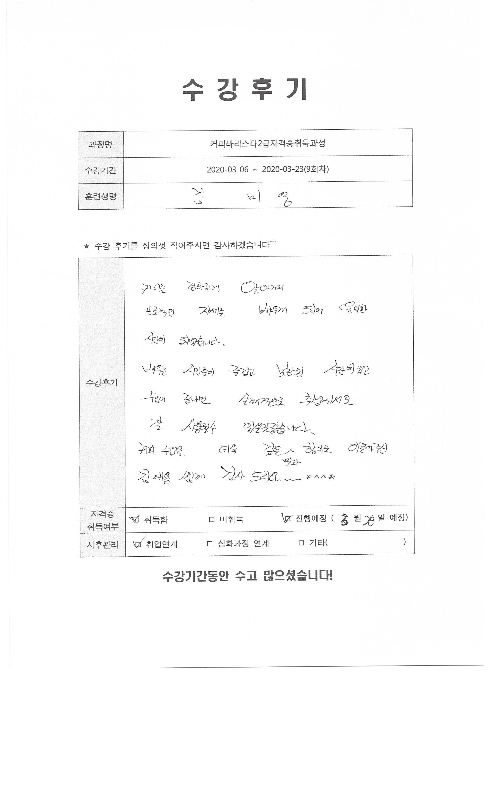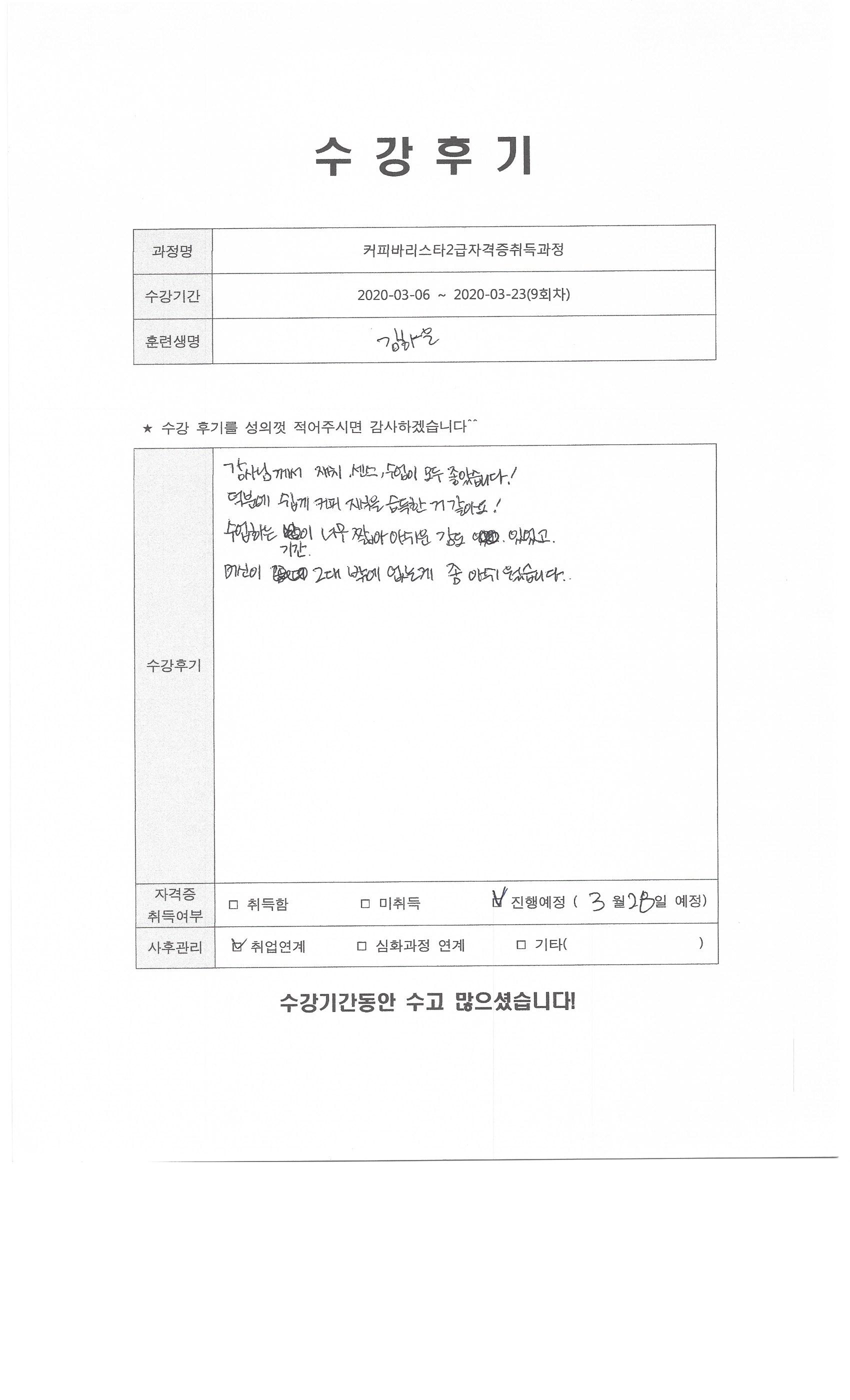 커피바리스타2급자격증취득과정(9회차)수강평