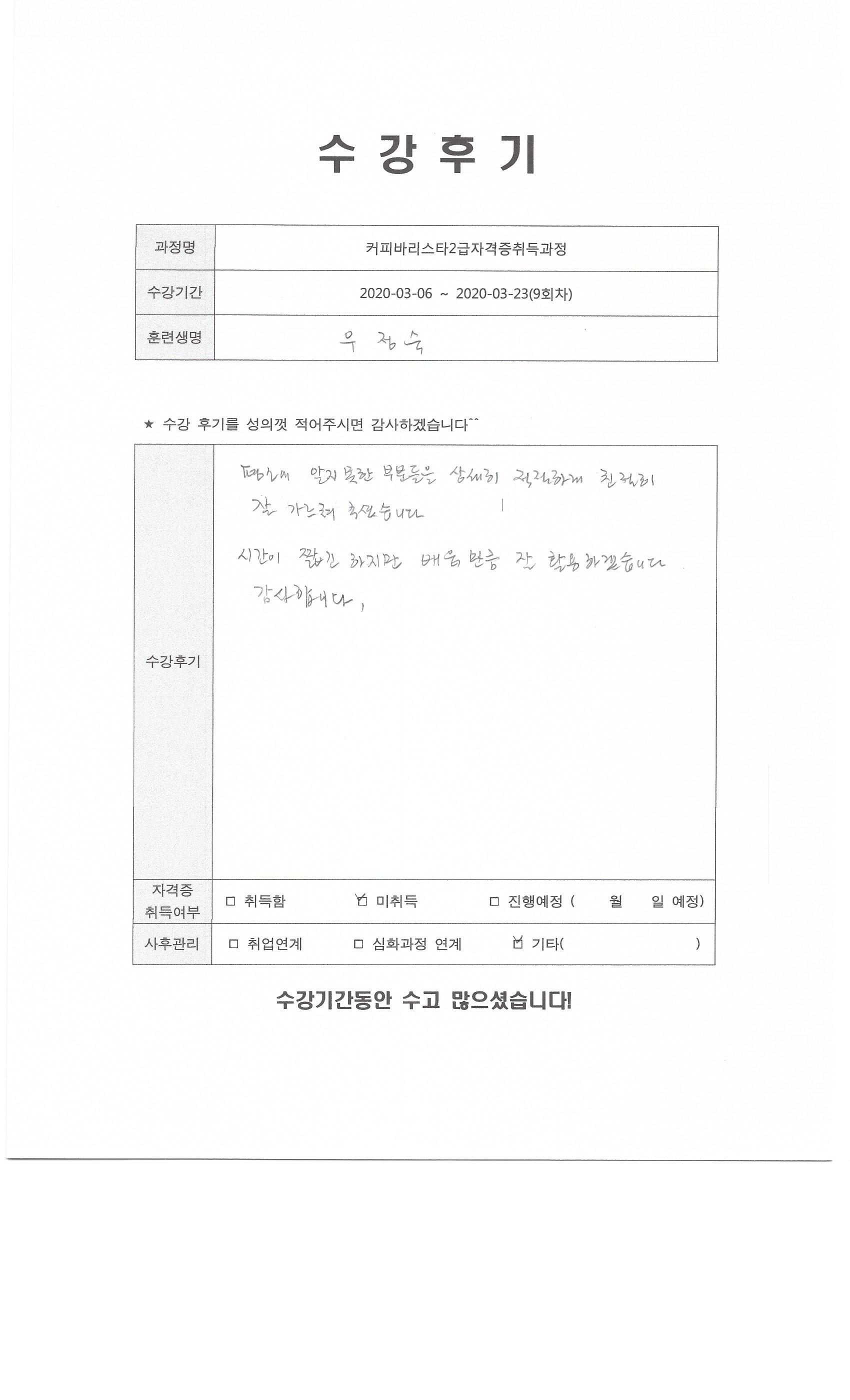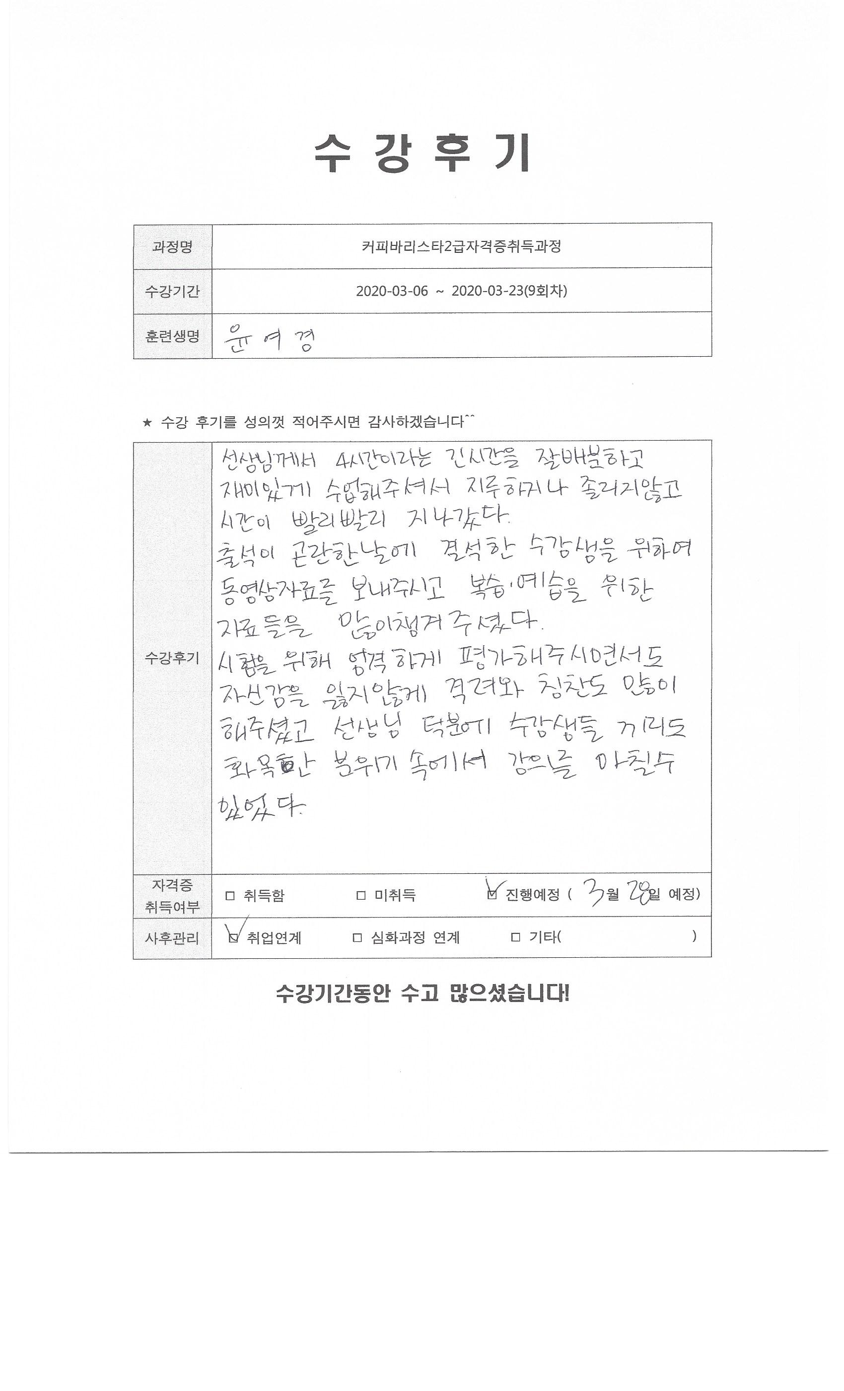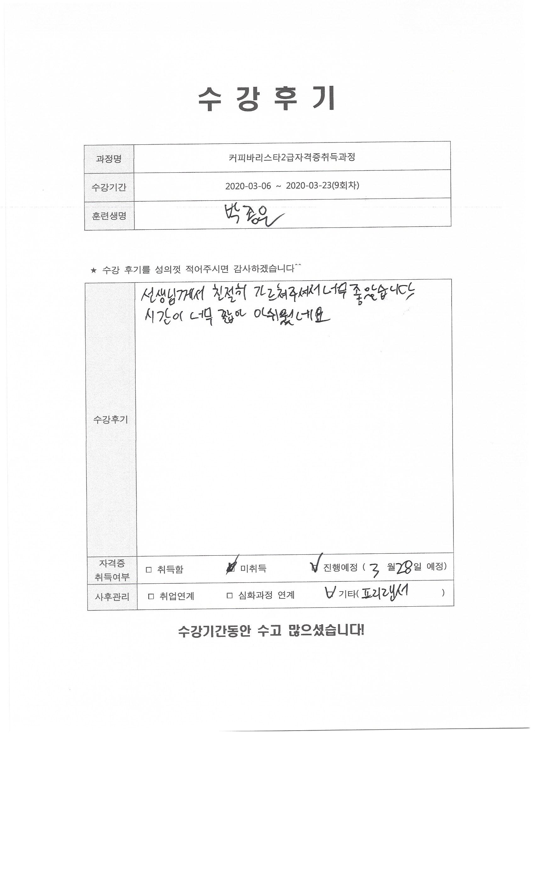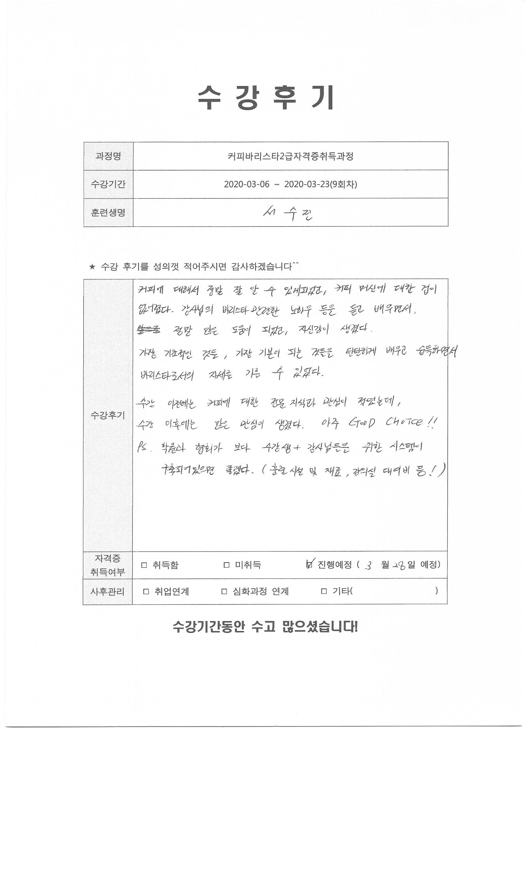 커피바리스타2급자격증취득과정(9회차)수강평