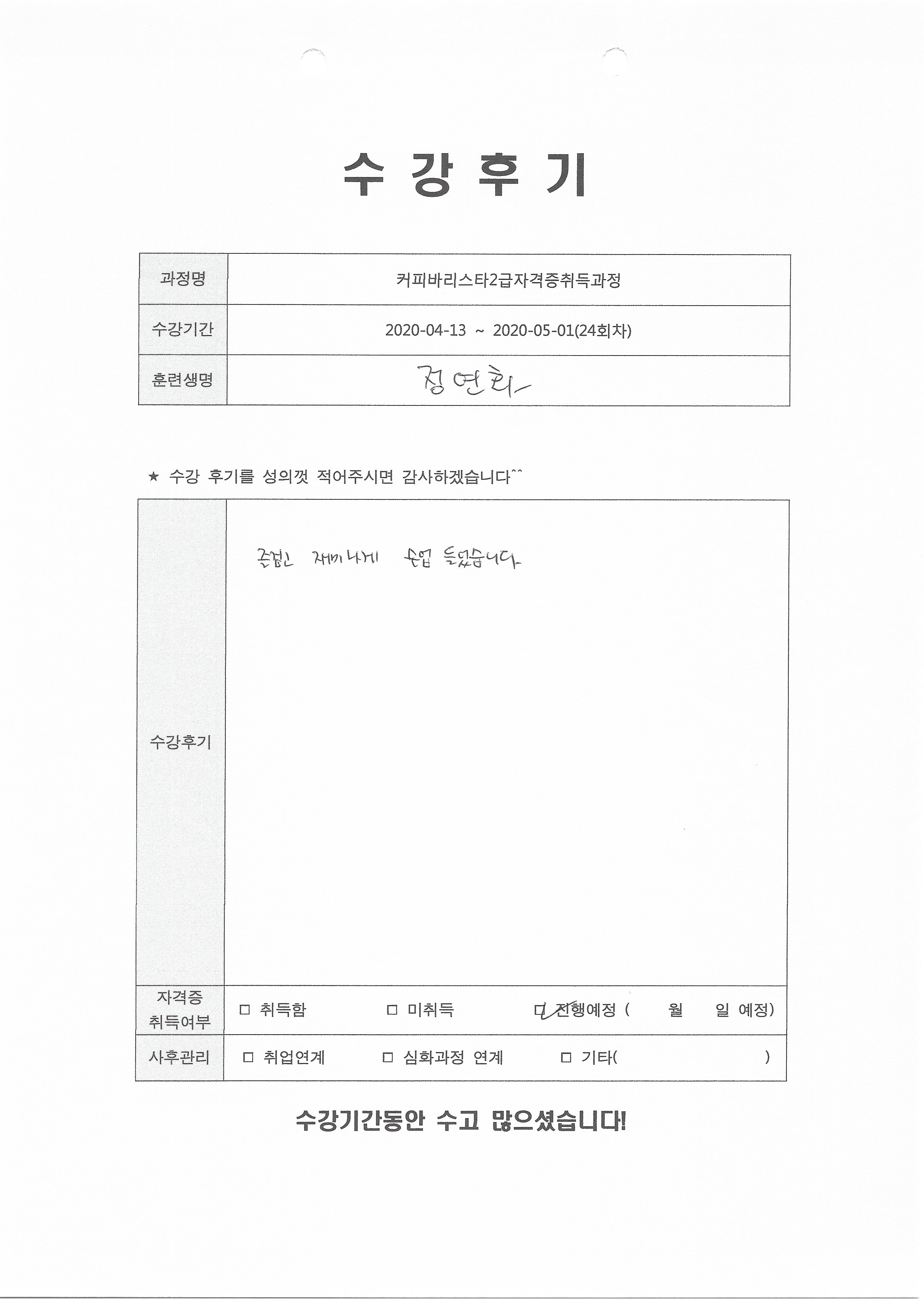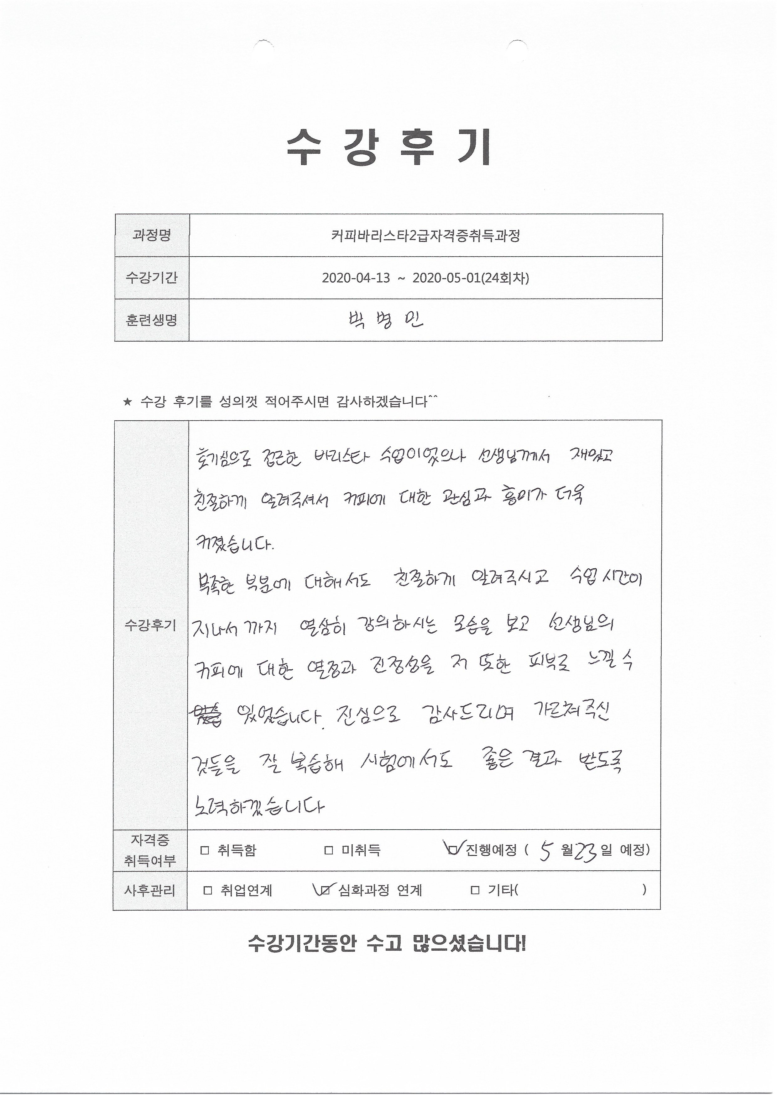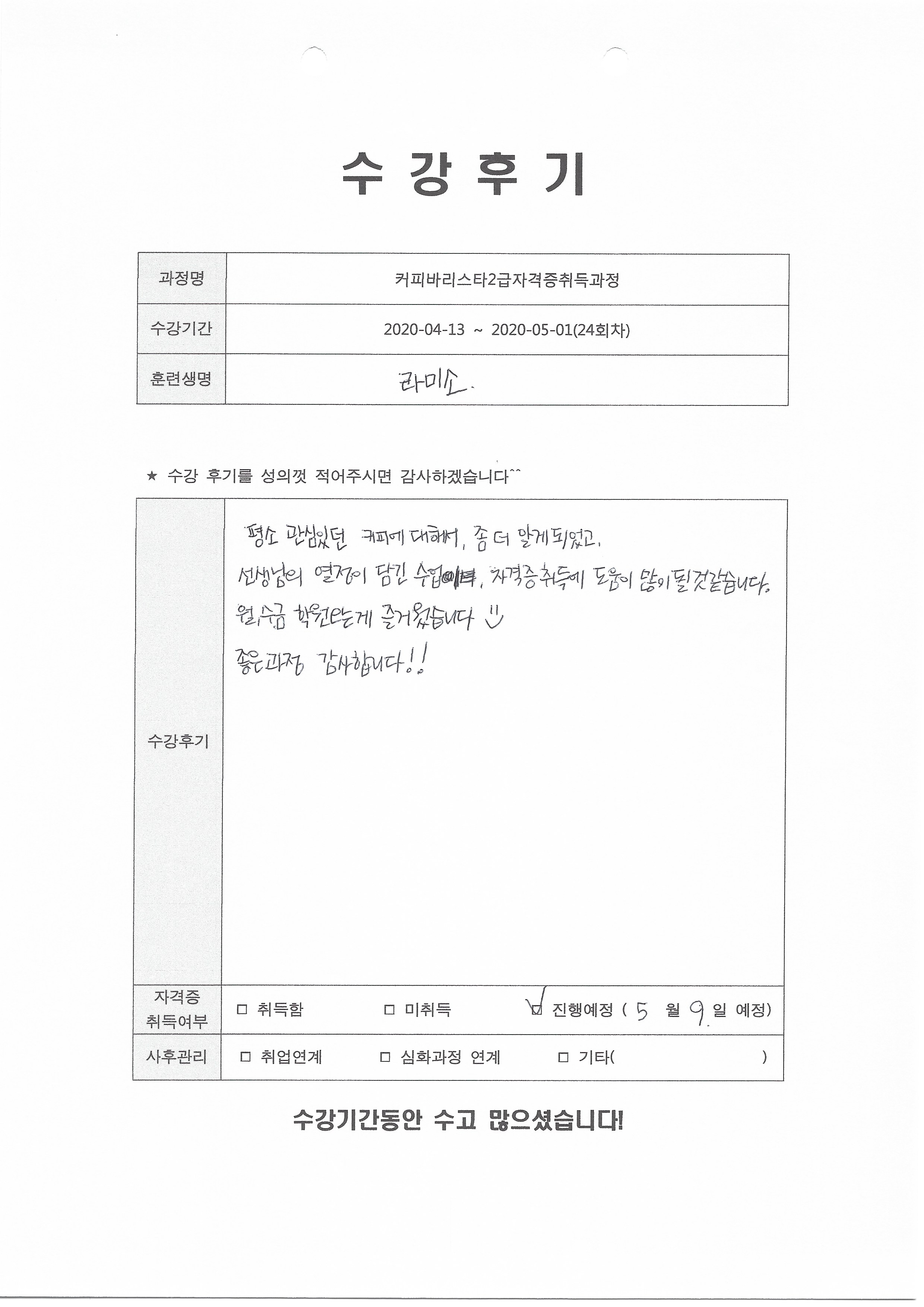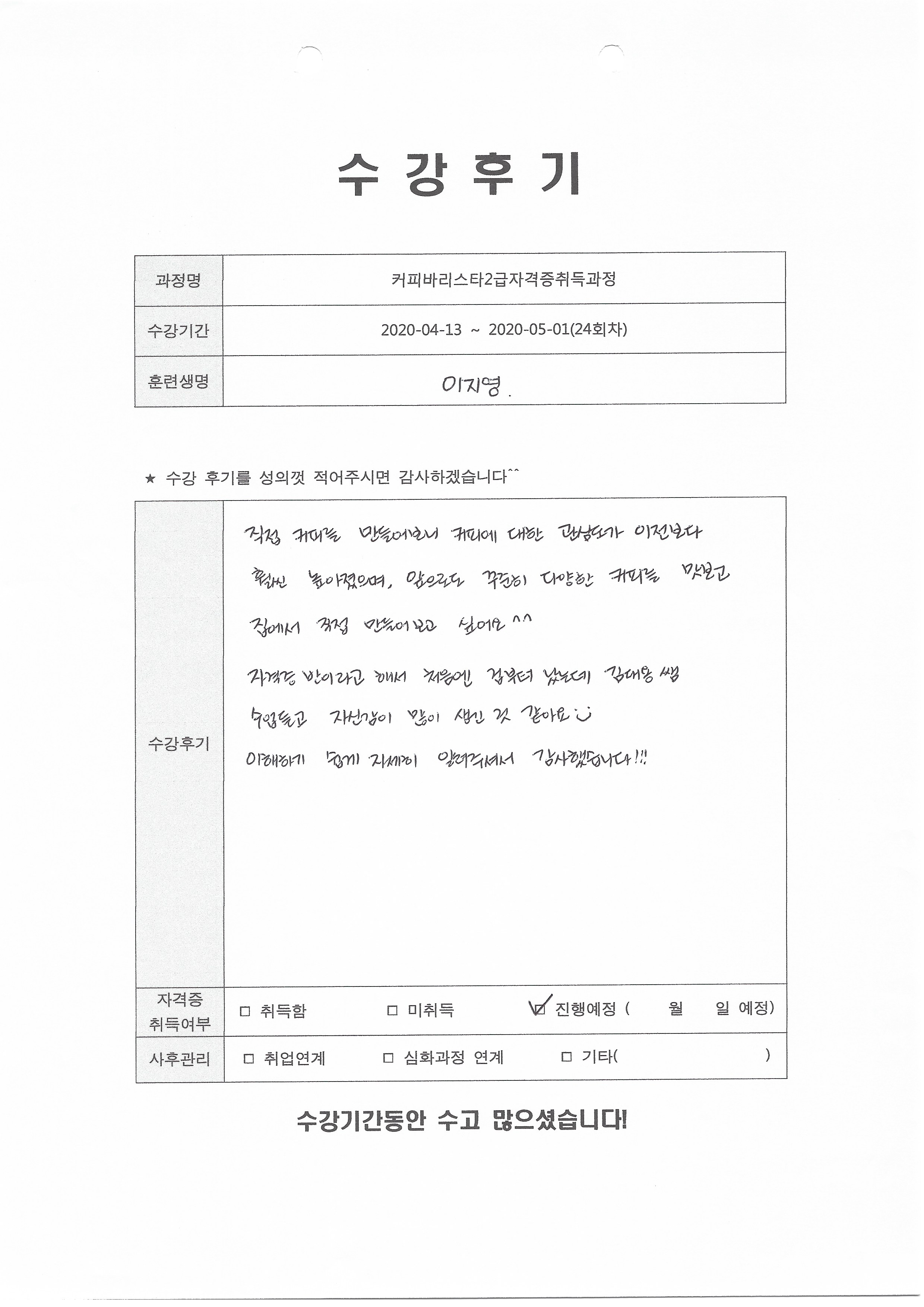 커피바리스타2급자격증취득과정(24회차) 수강평