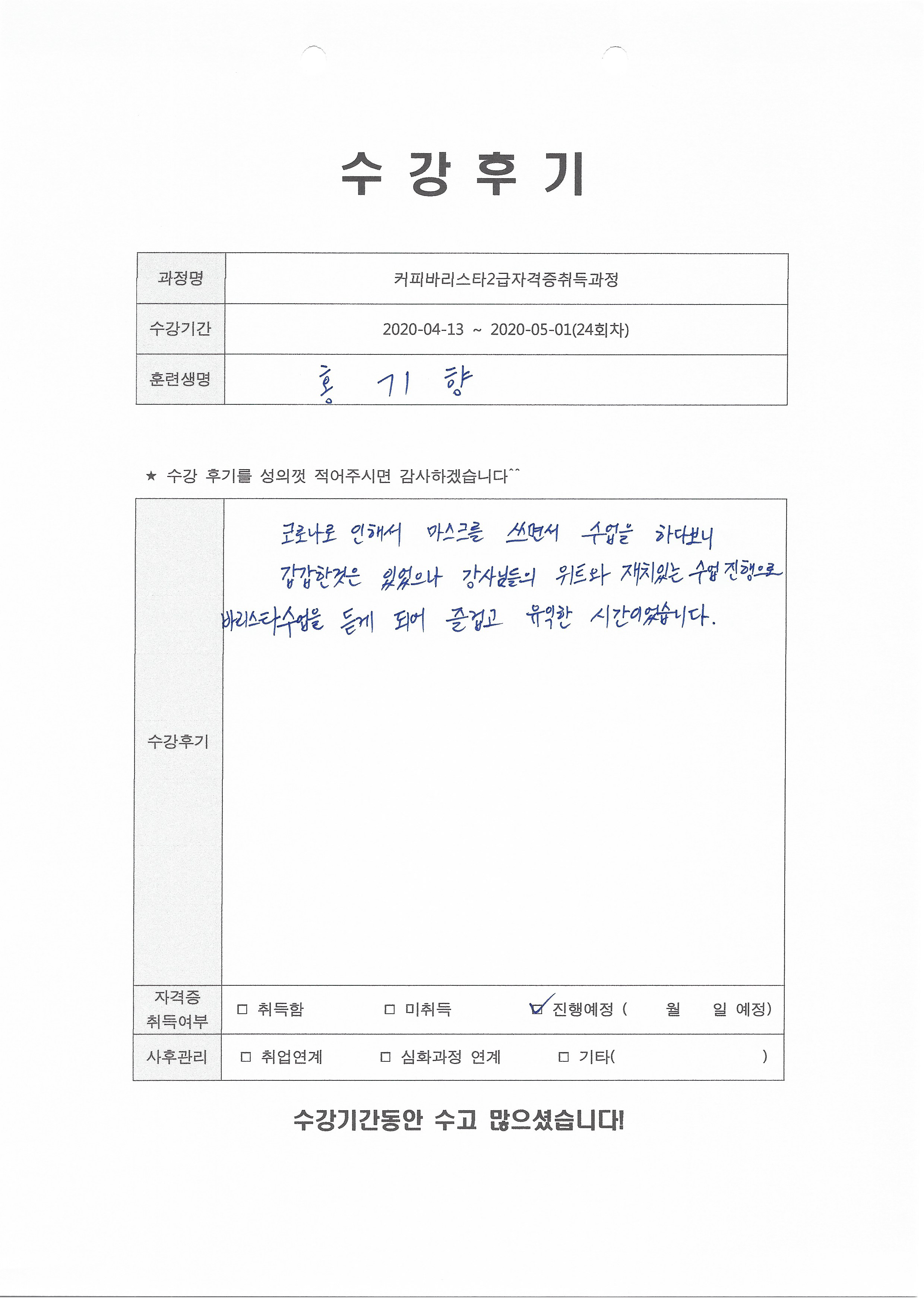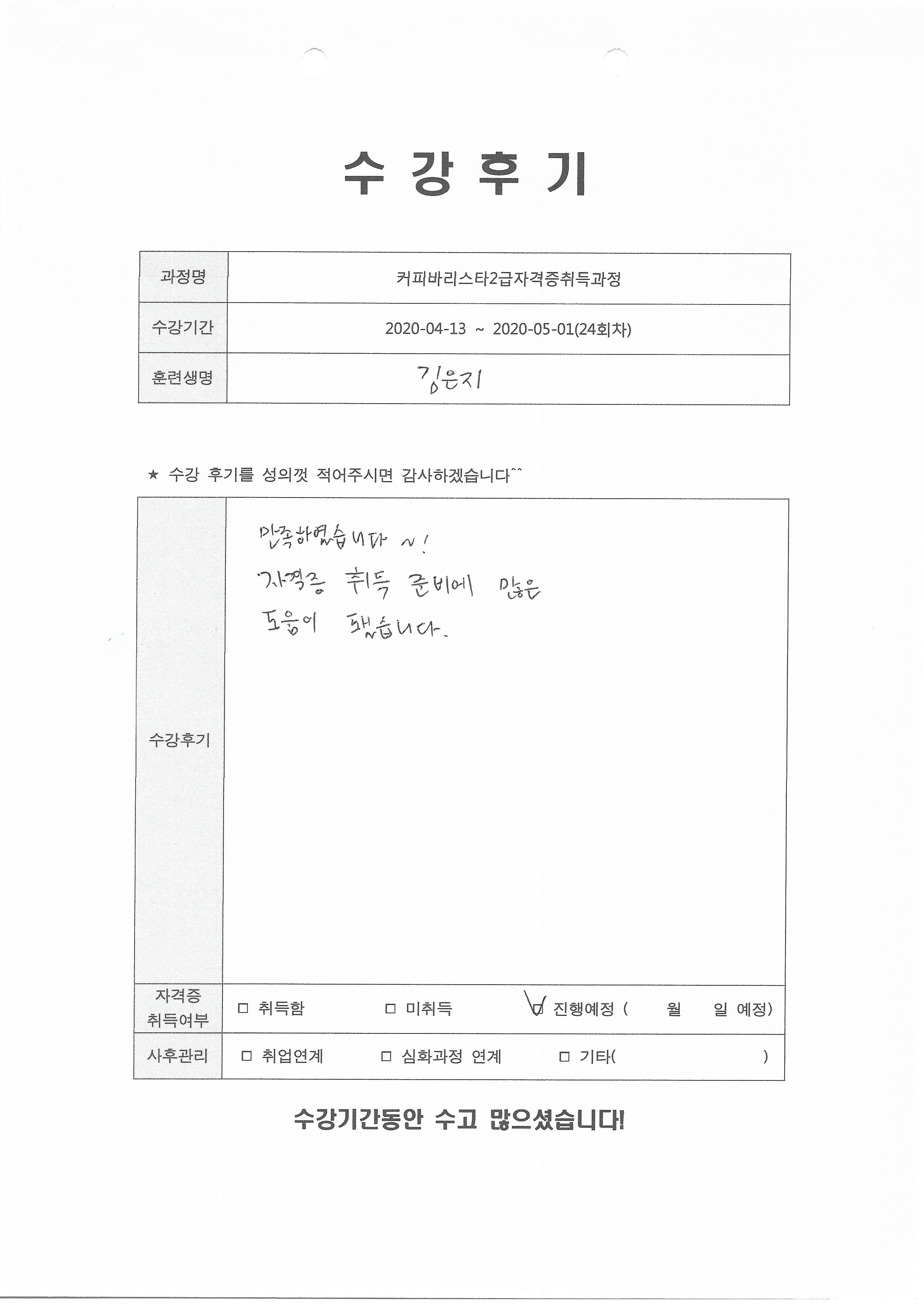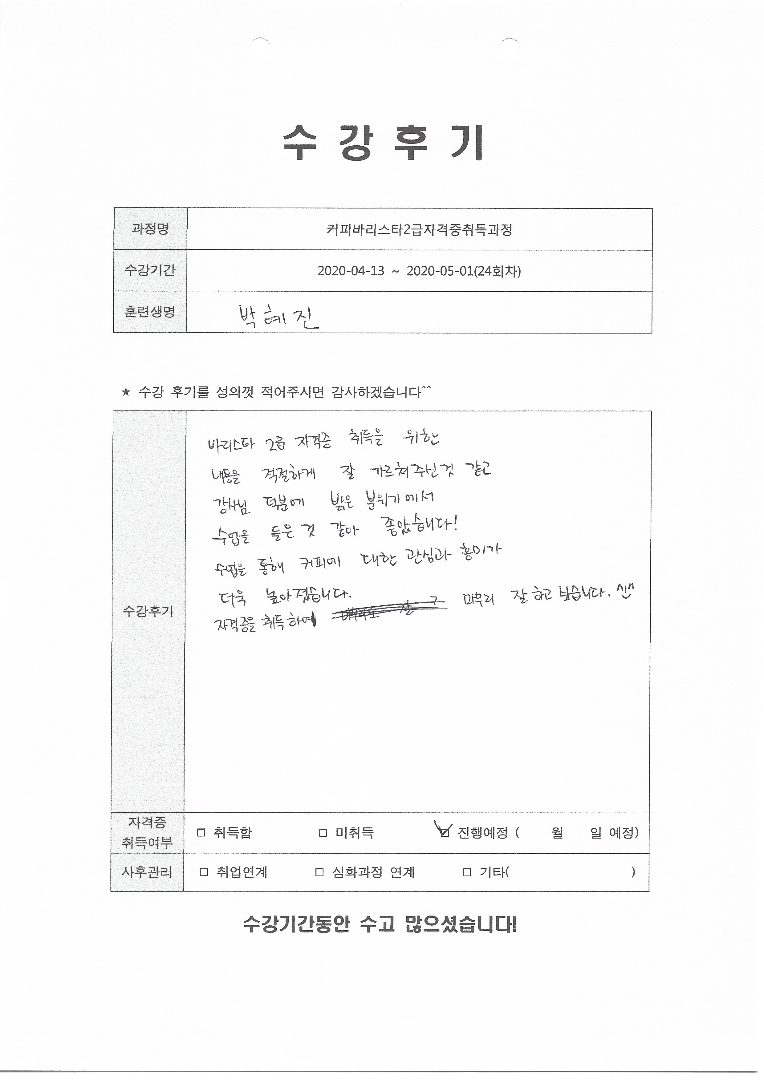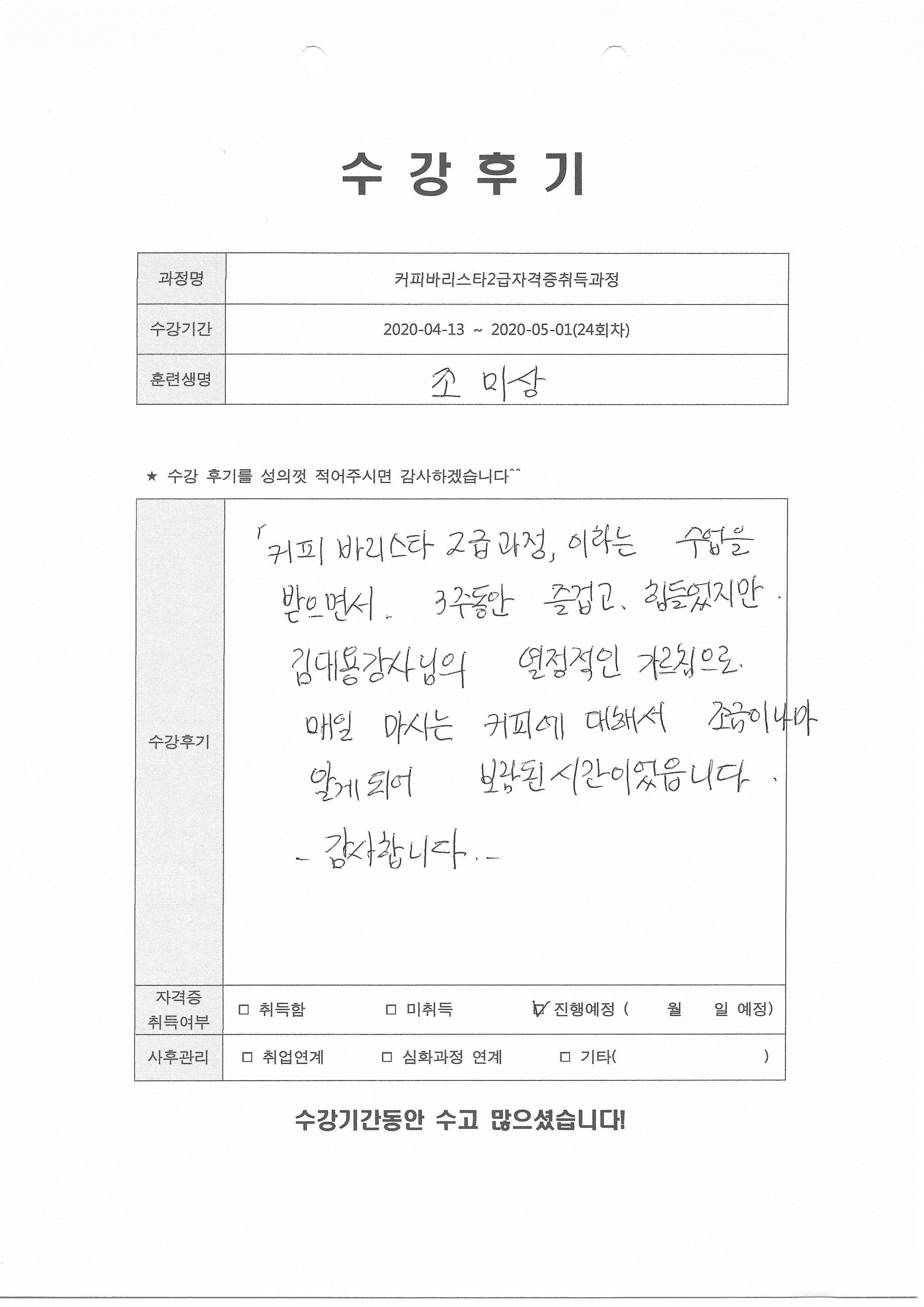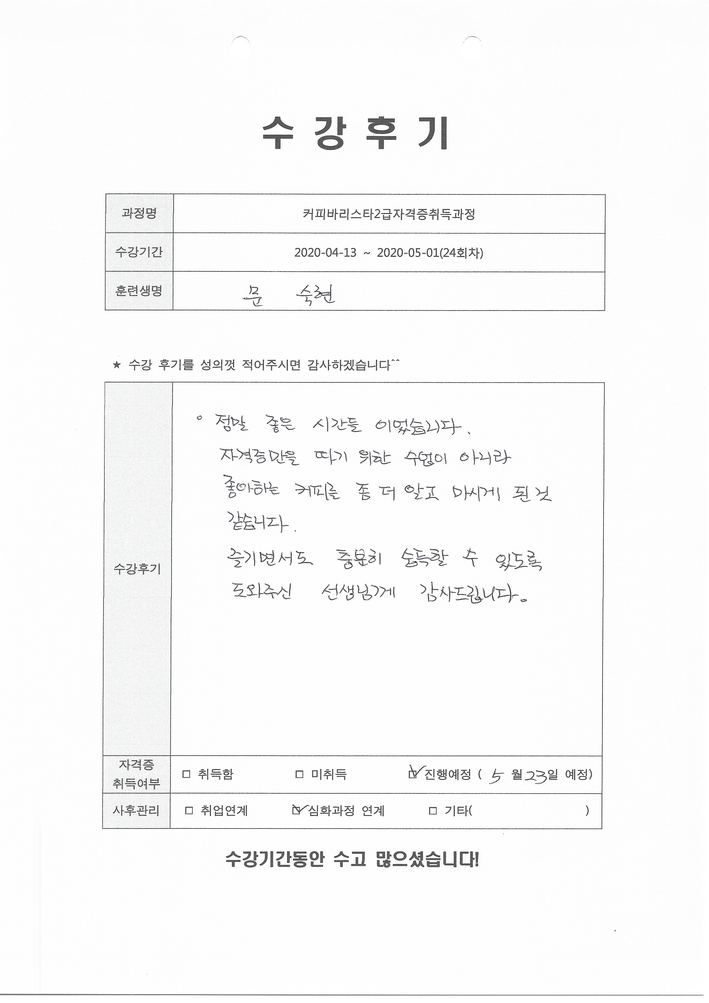 커피바리스타2급자격증취득과정(24회차) 수강평