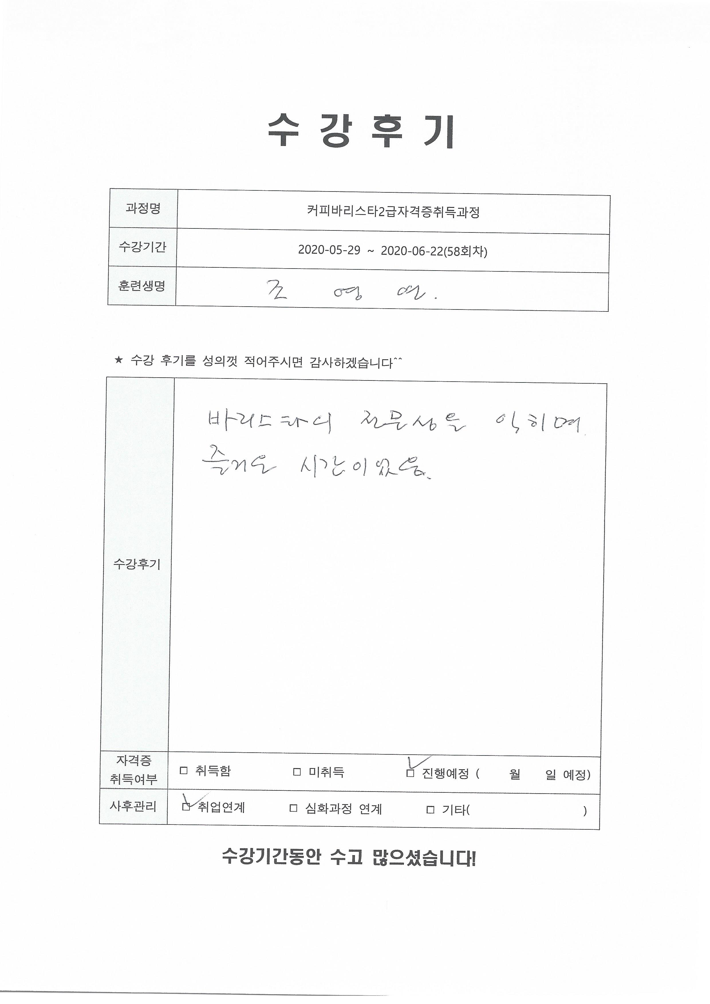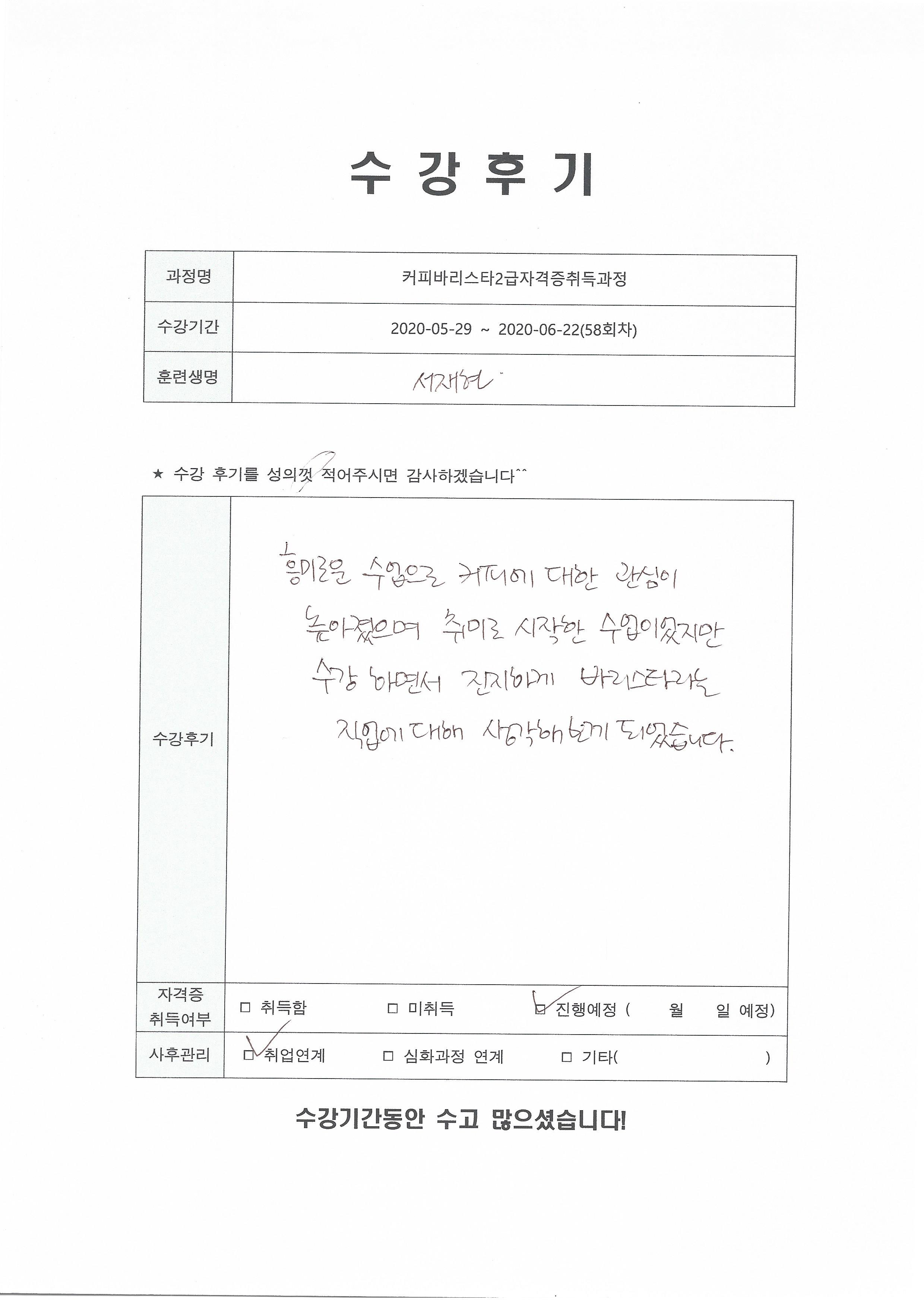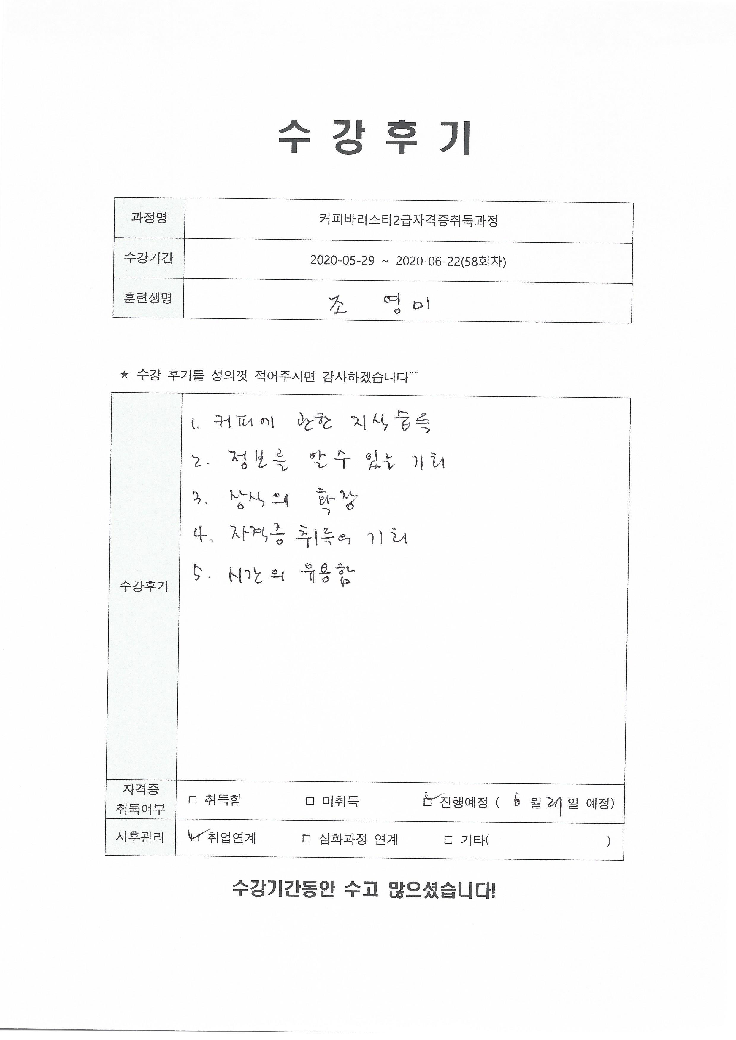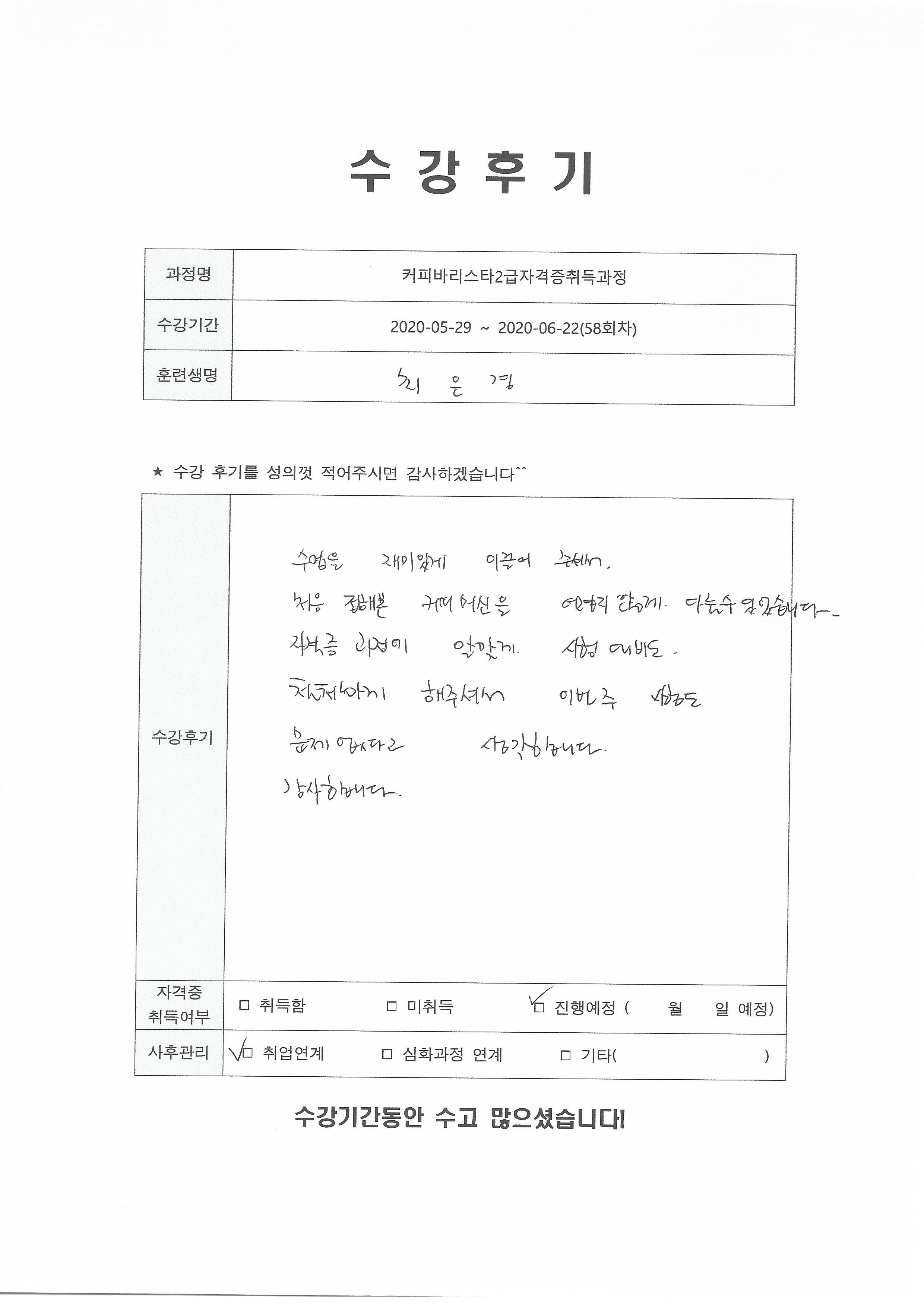 커피바리스타2급자격증취득과정(58회차) 수강평
