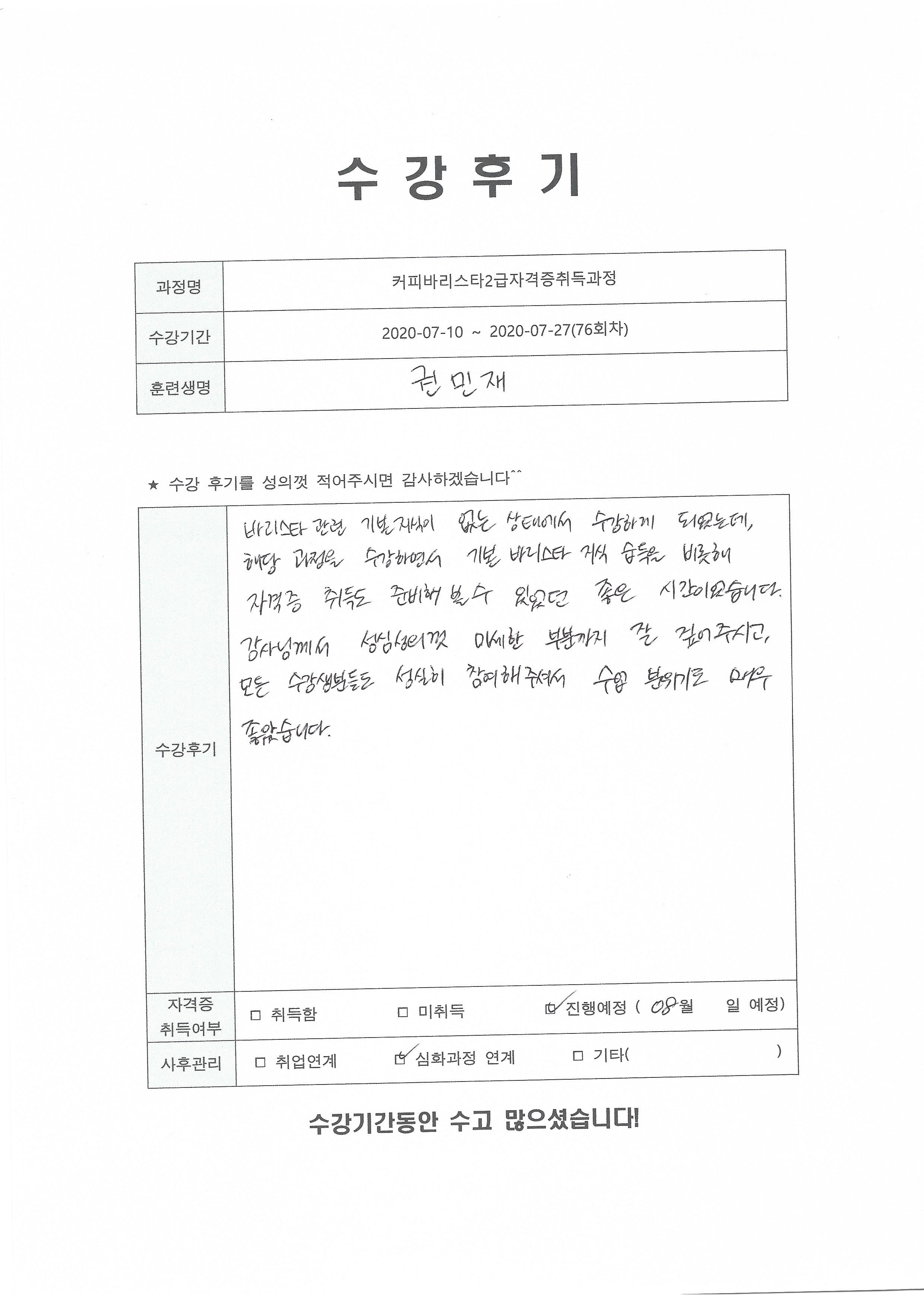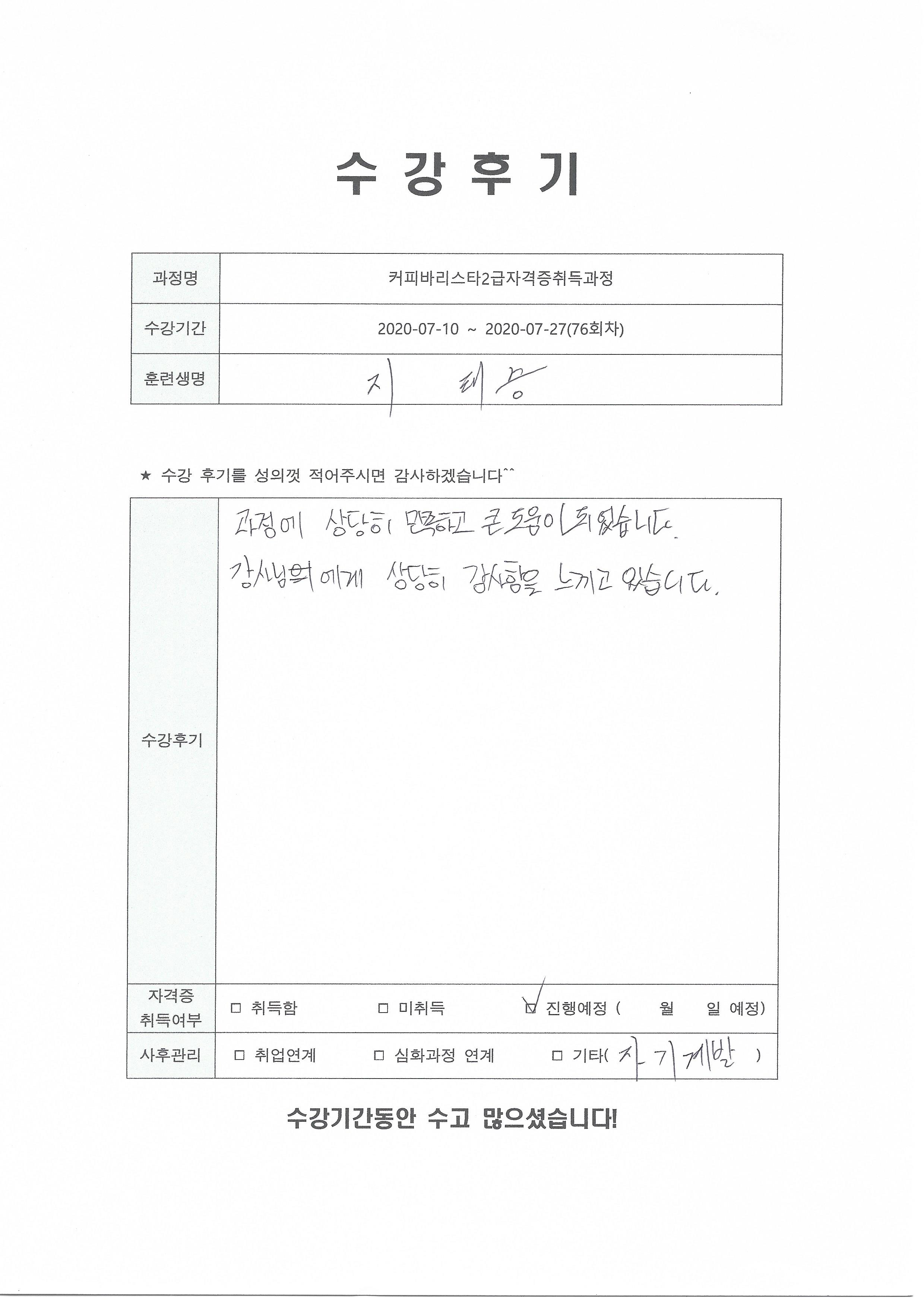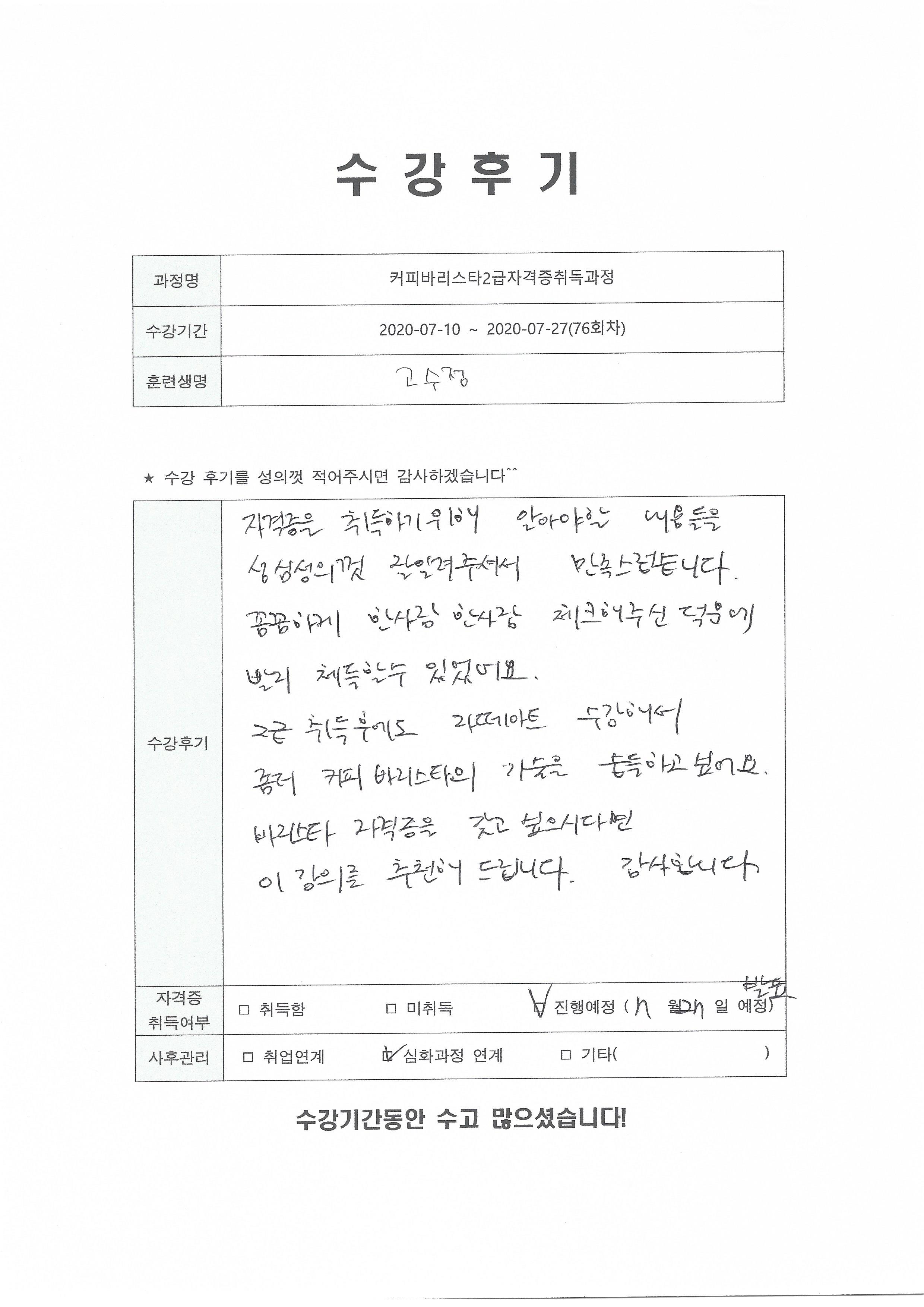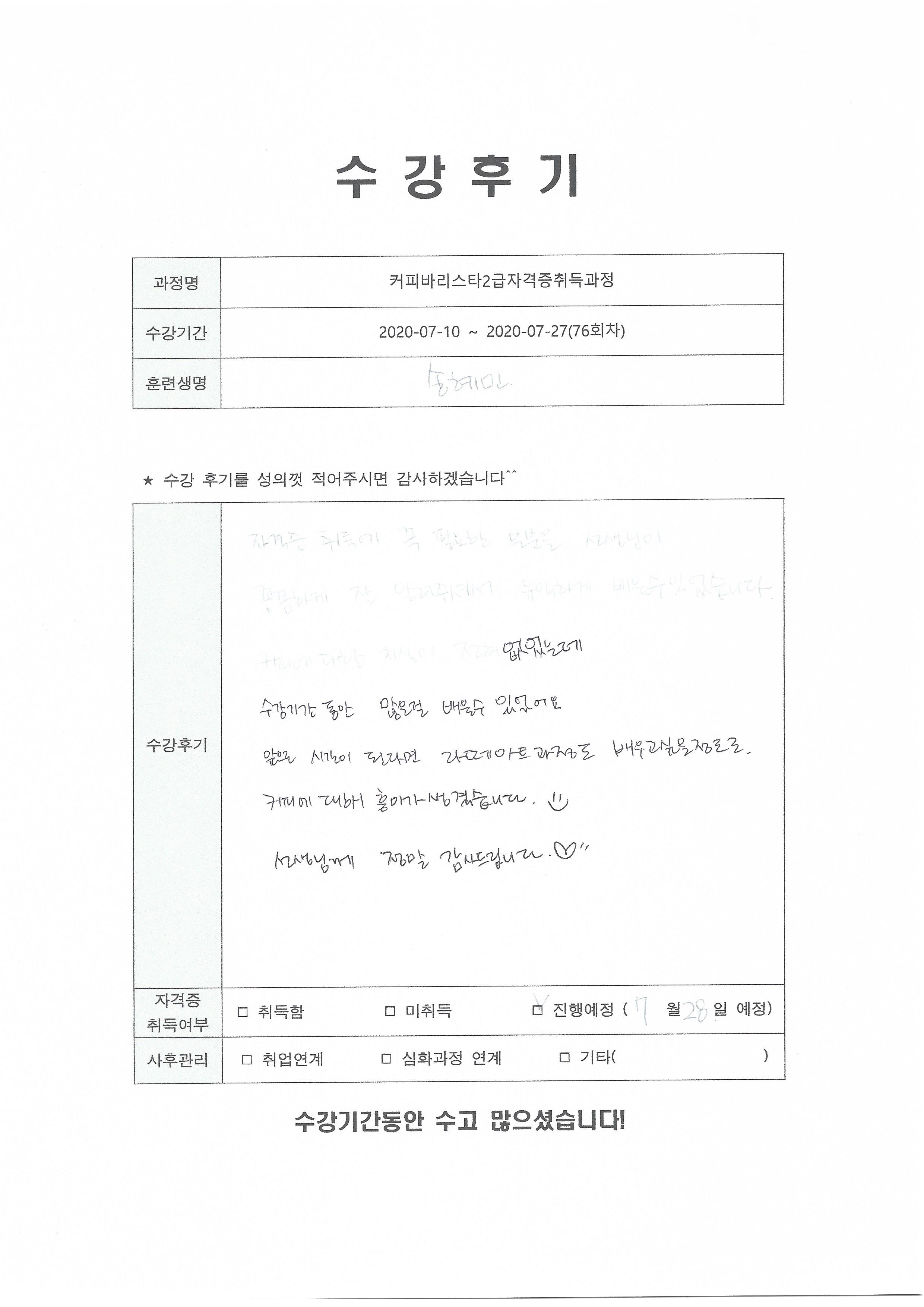 커피바리스타2급자격증취득과정(76회차) 수강평