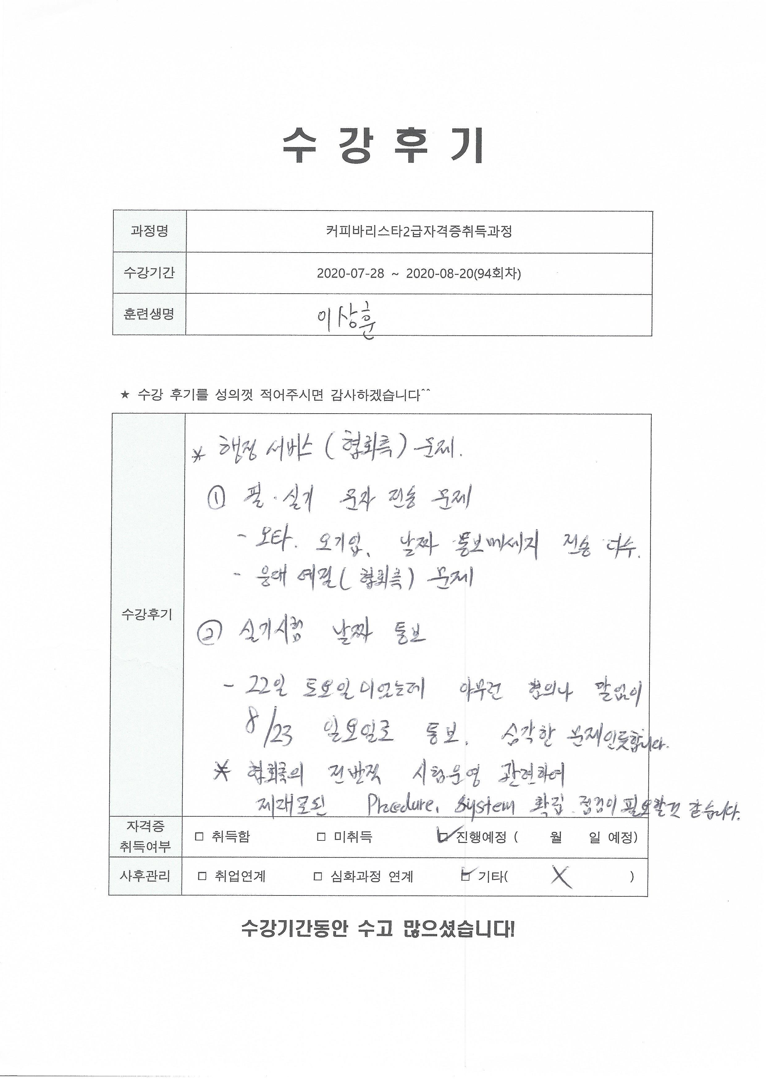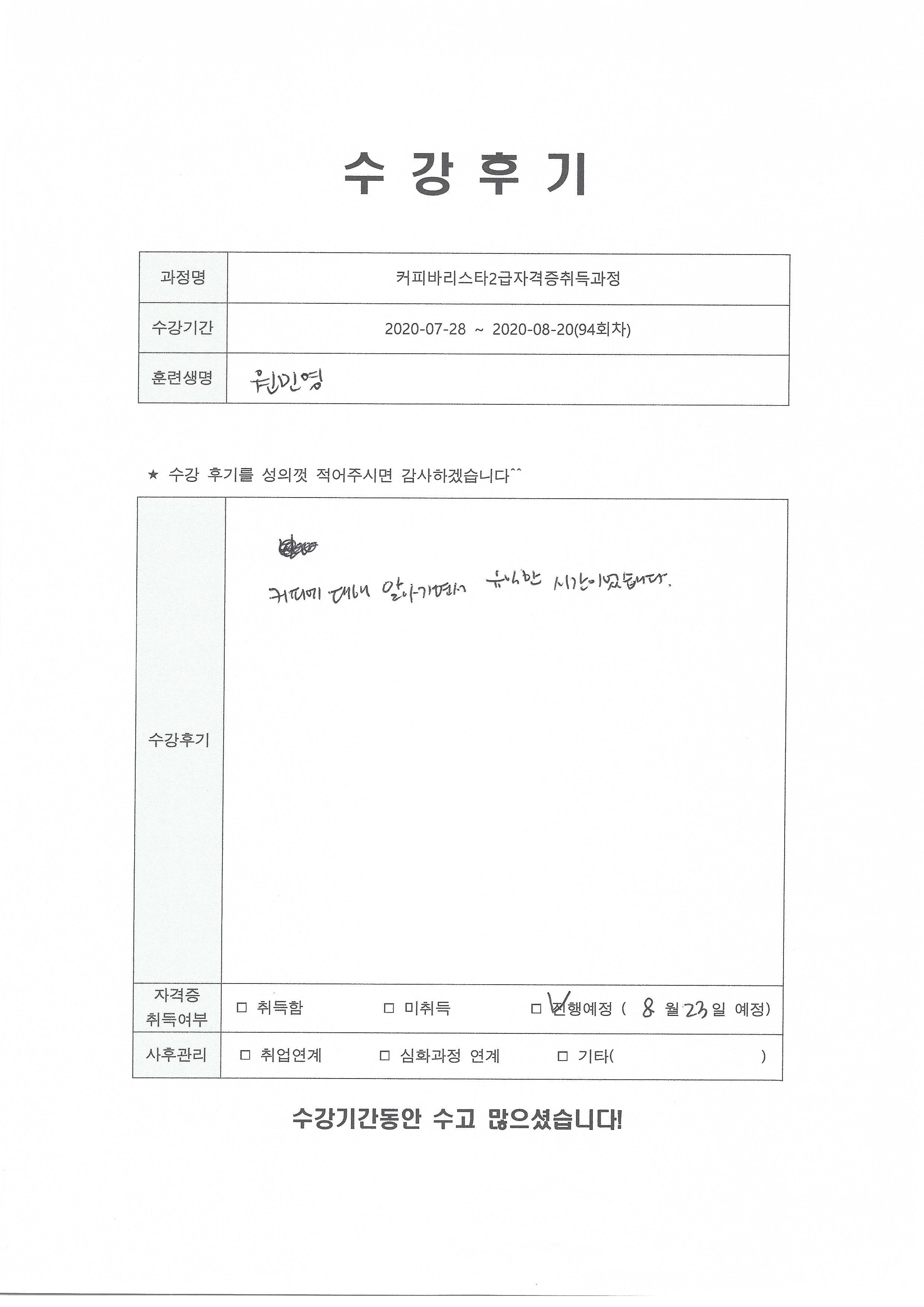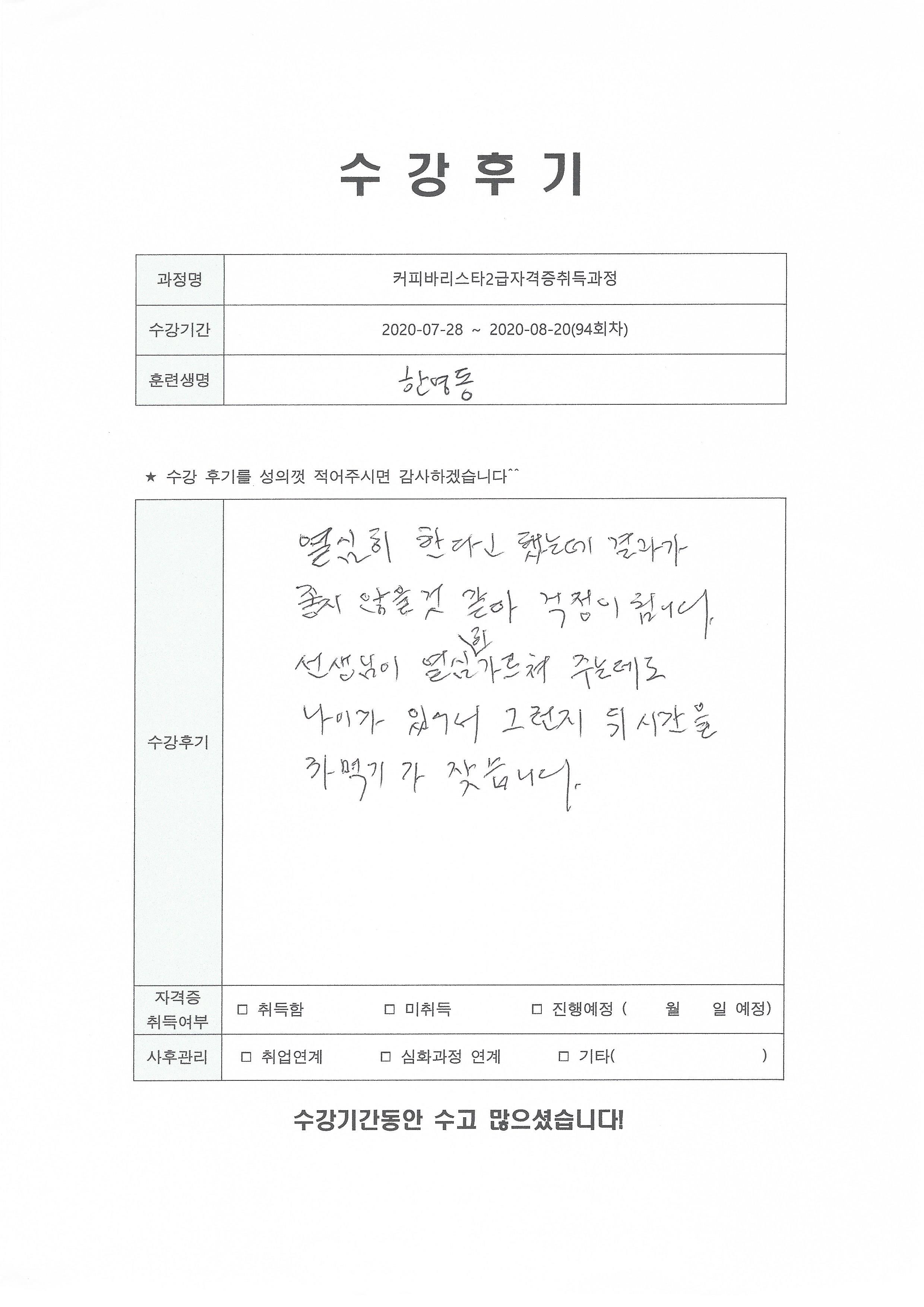 커피바리스타2급자격증취득과정(94회차) 수강평