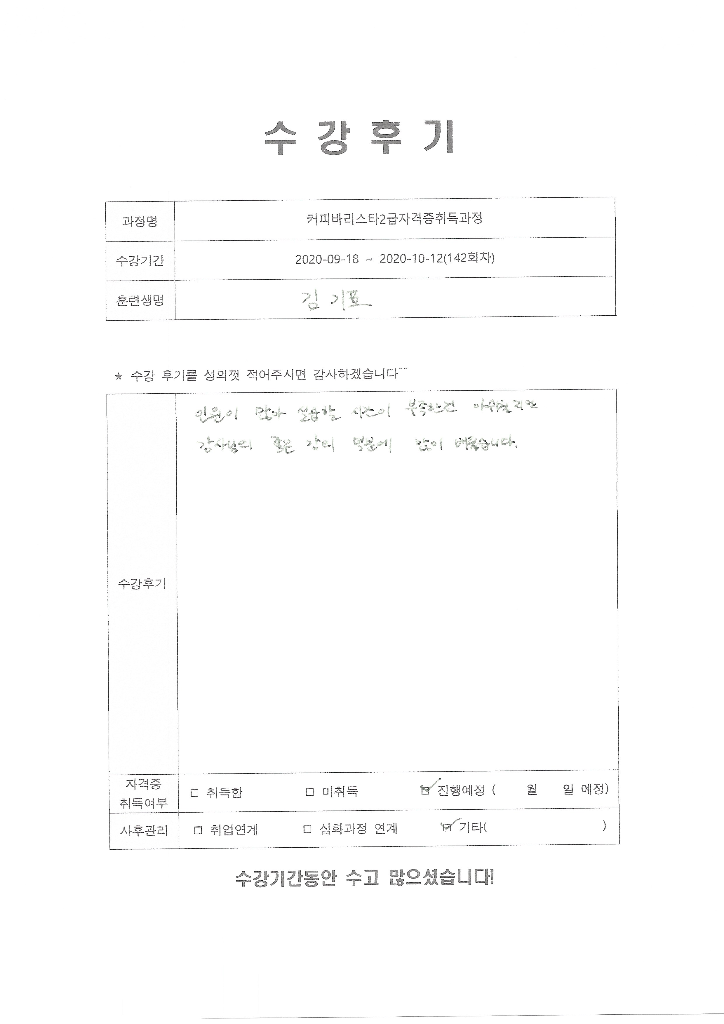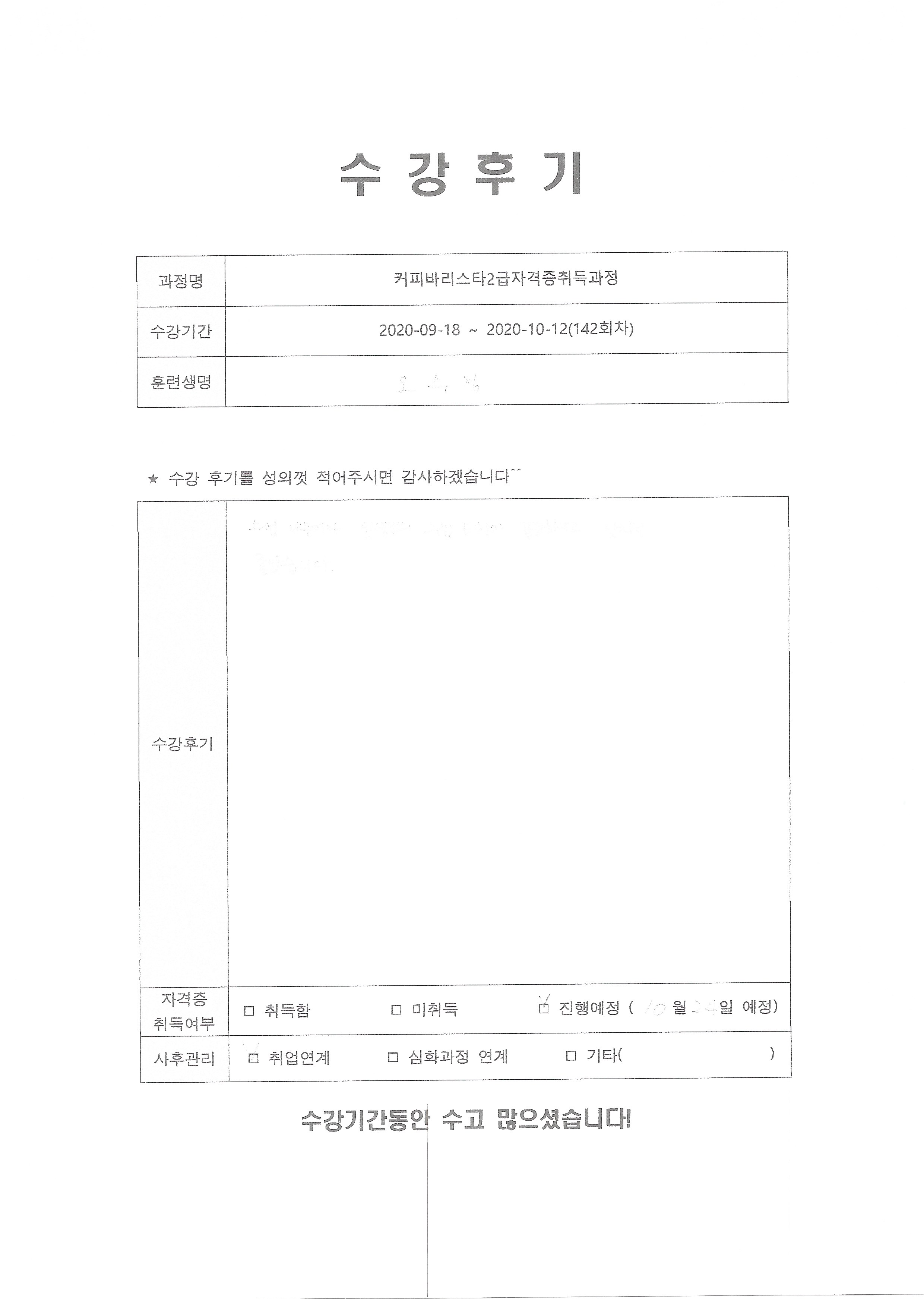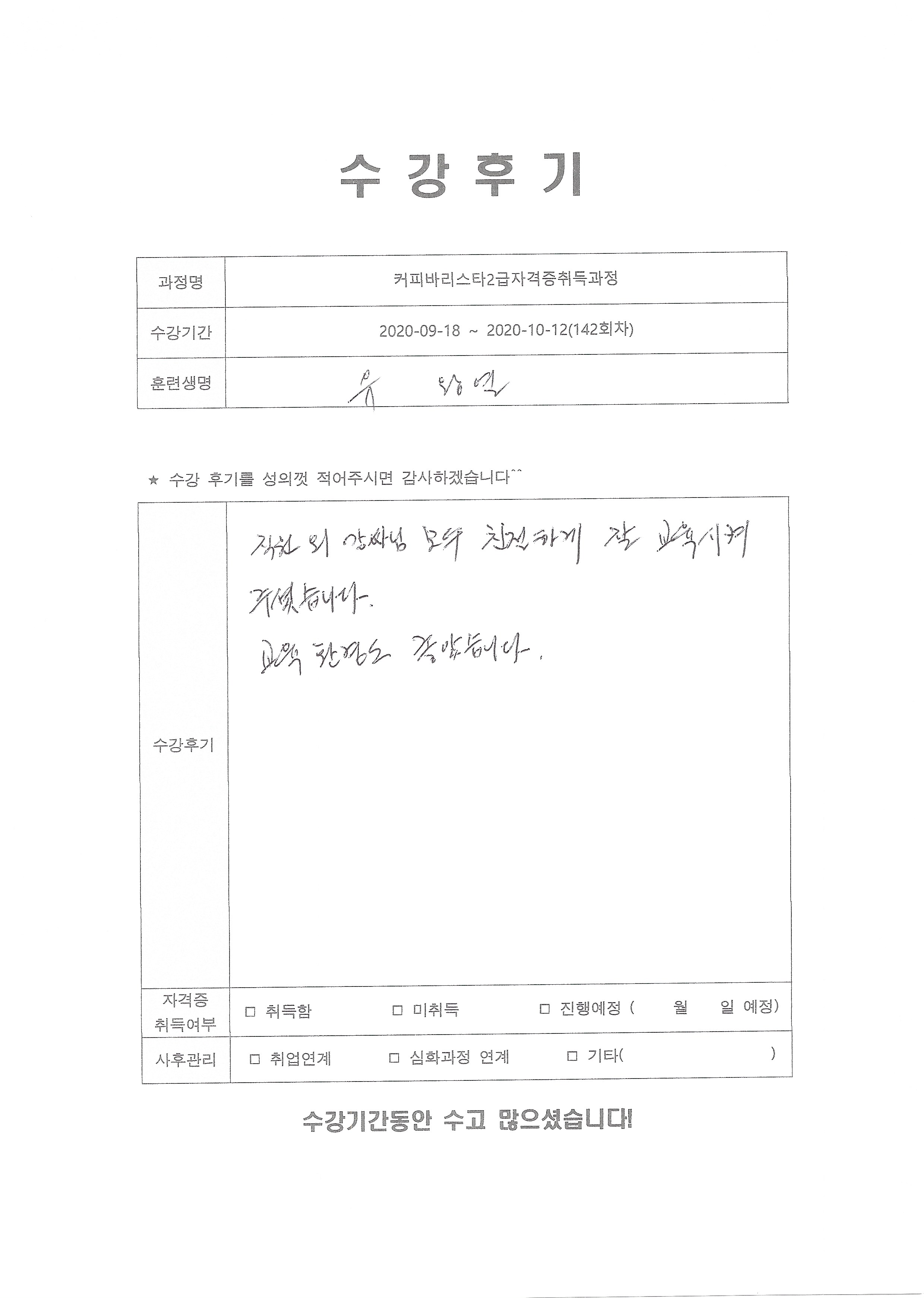 커피바리스타2급자격증취득과정(142회차) 수강평