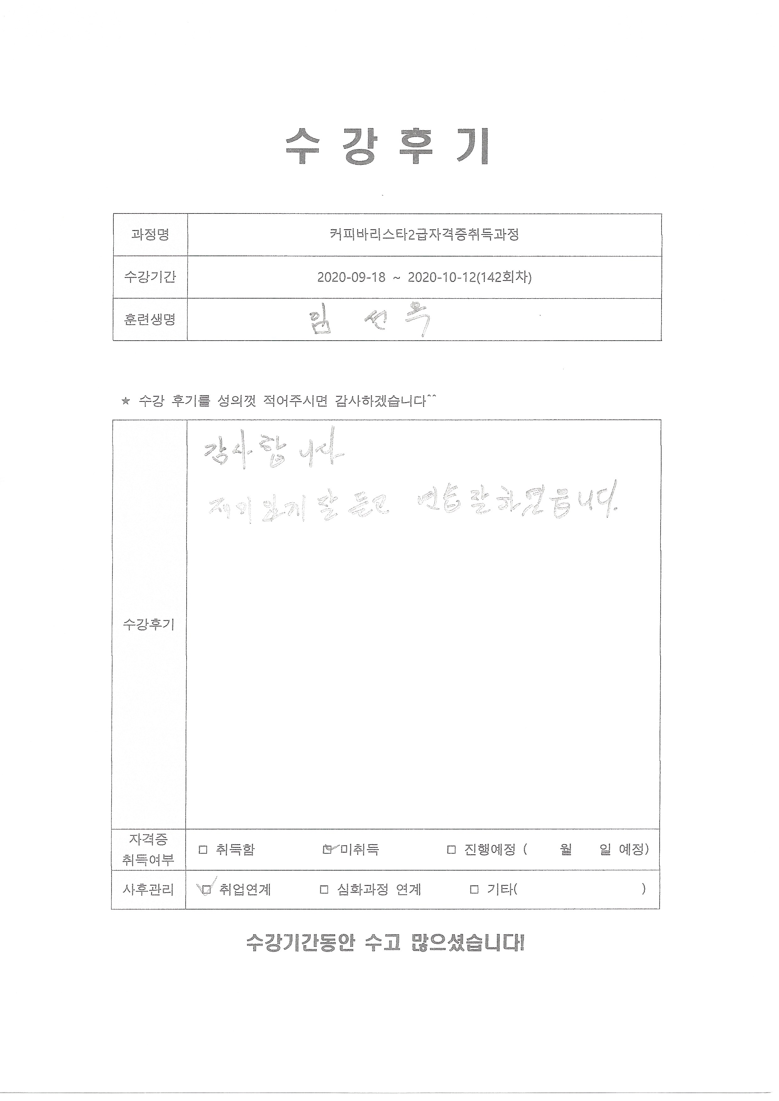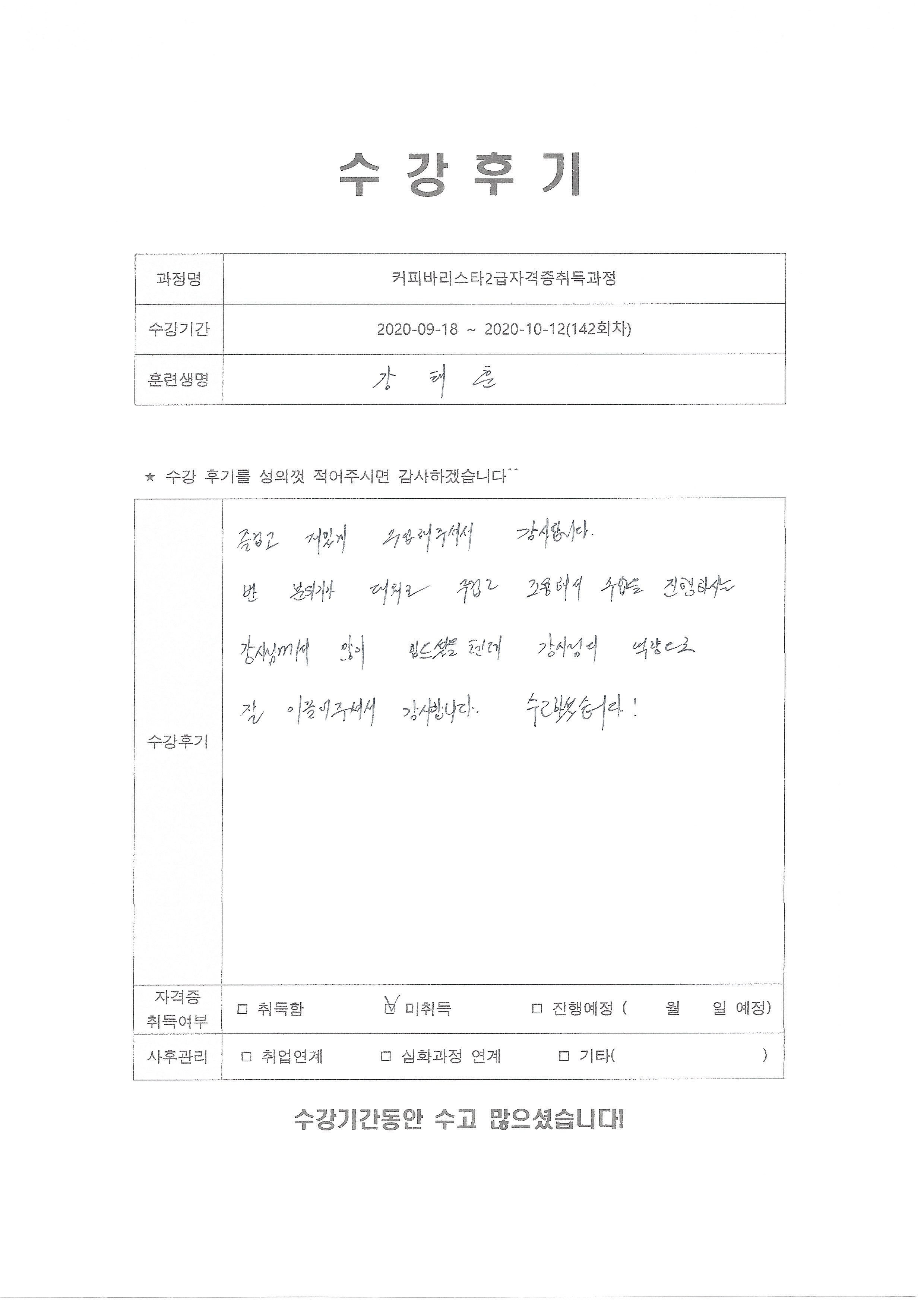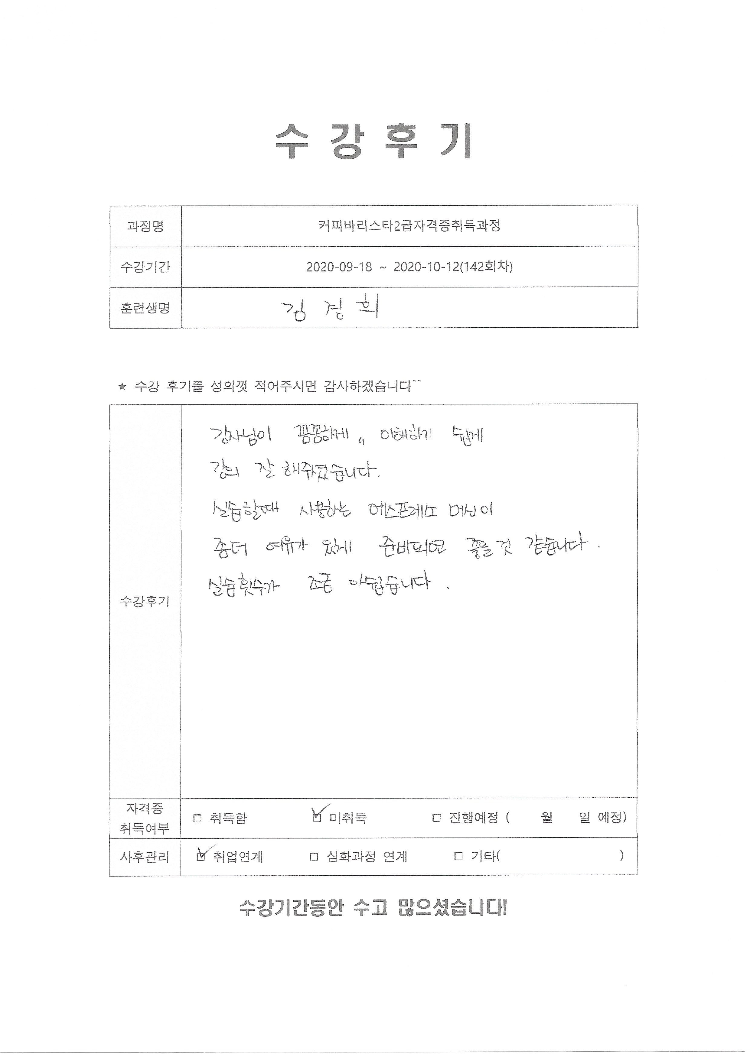 커피바리스타2급자격증취득과정(142회차) 수강평