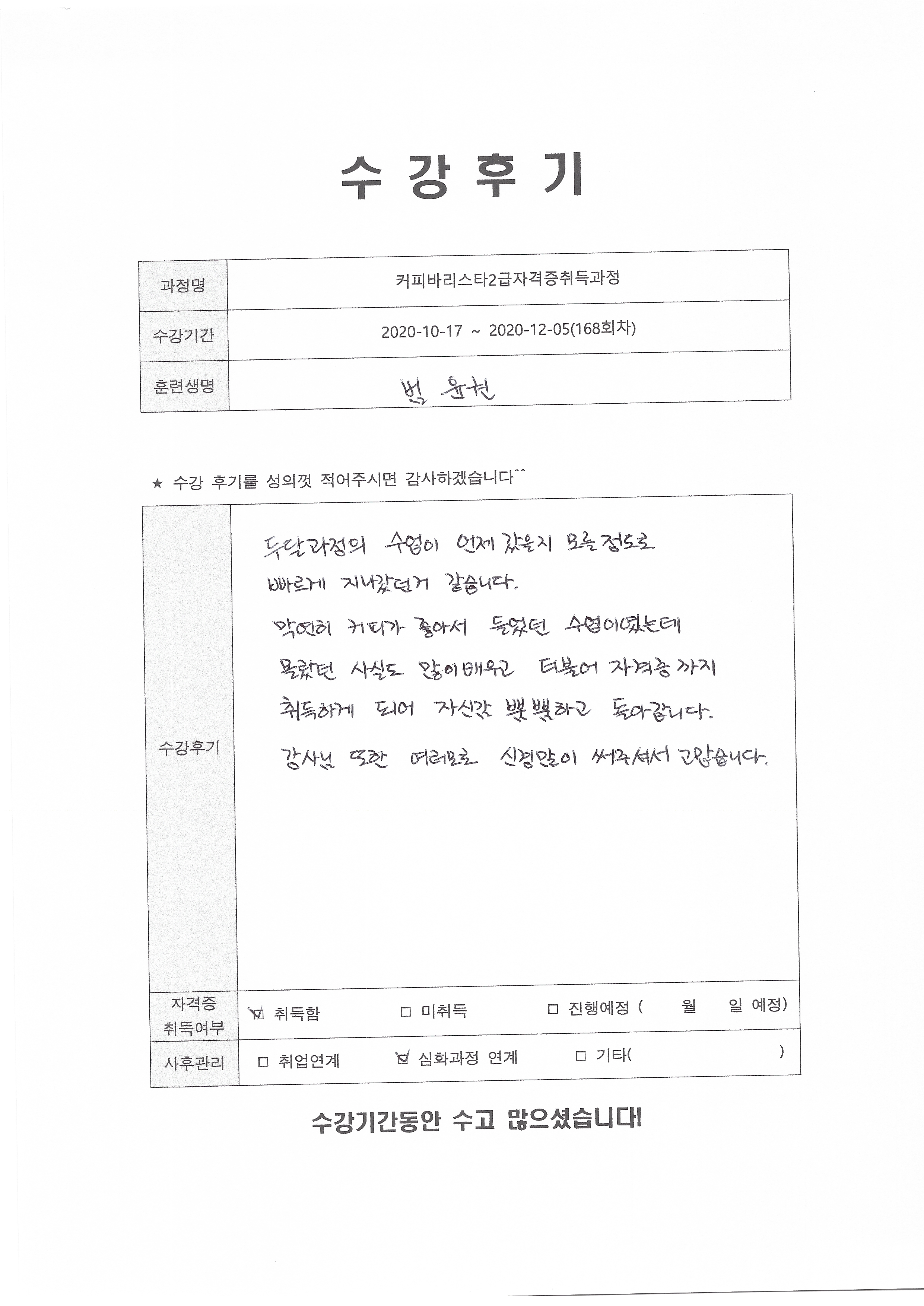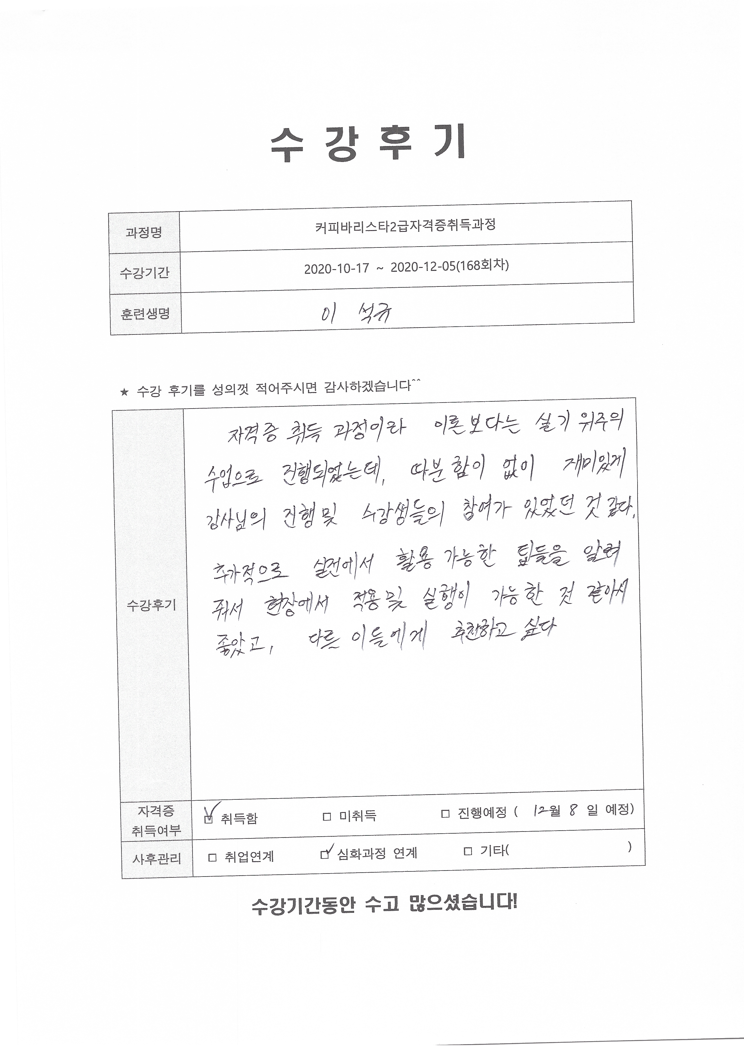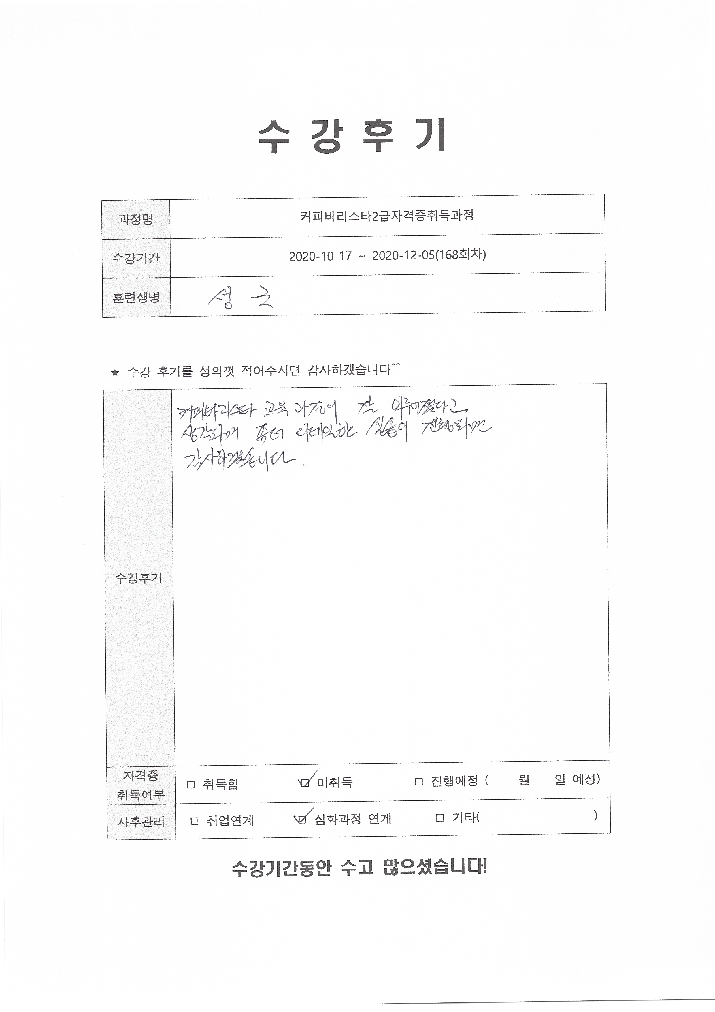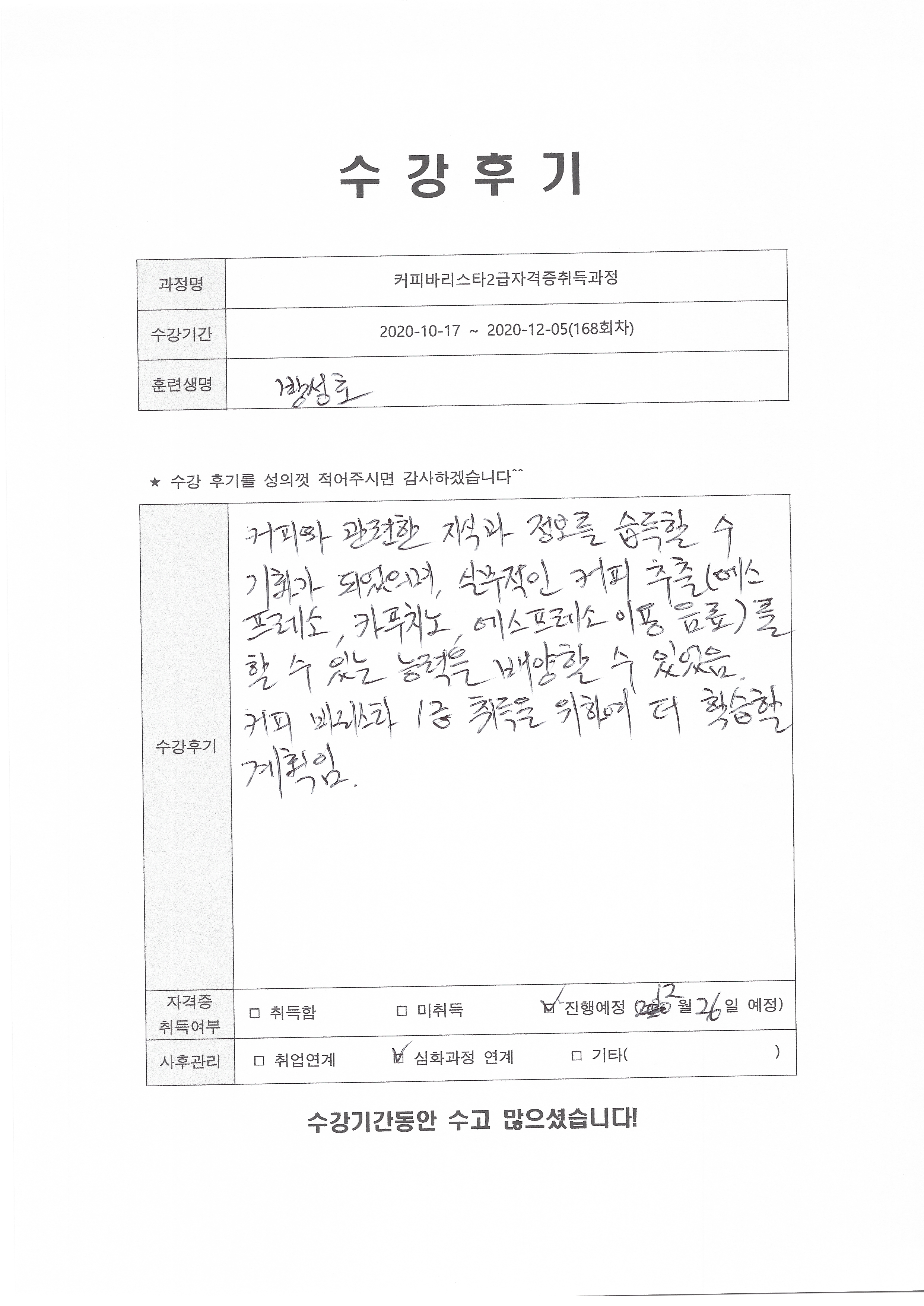 커피바리스타2급자격증취득과정 (168회차) 수강평
