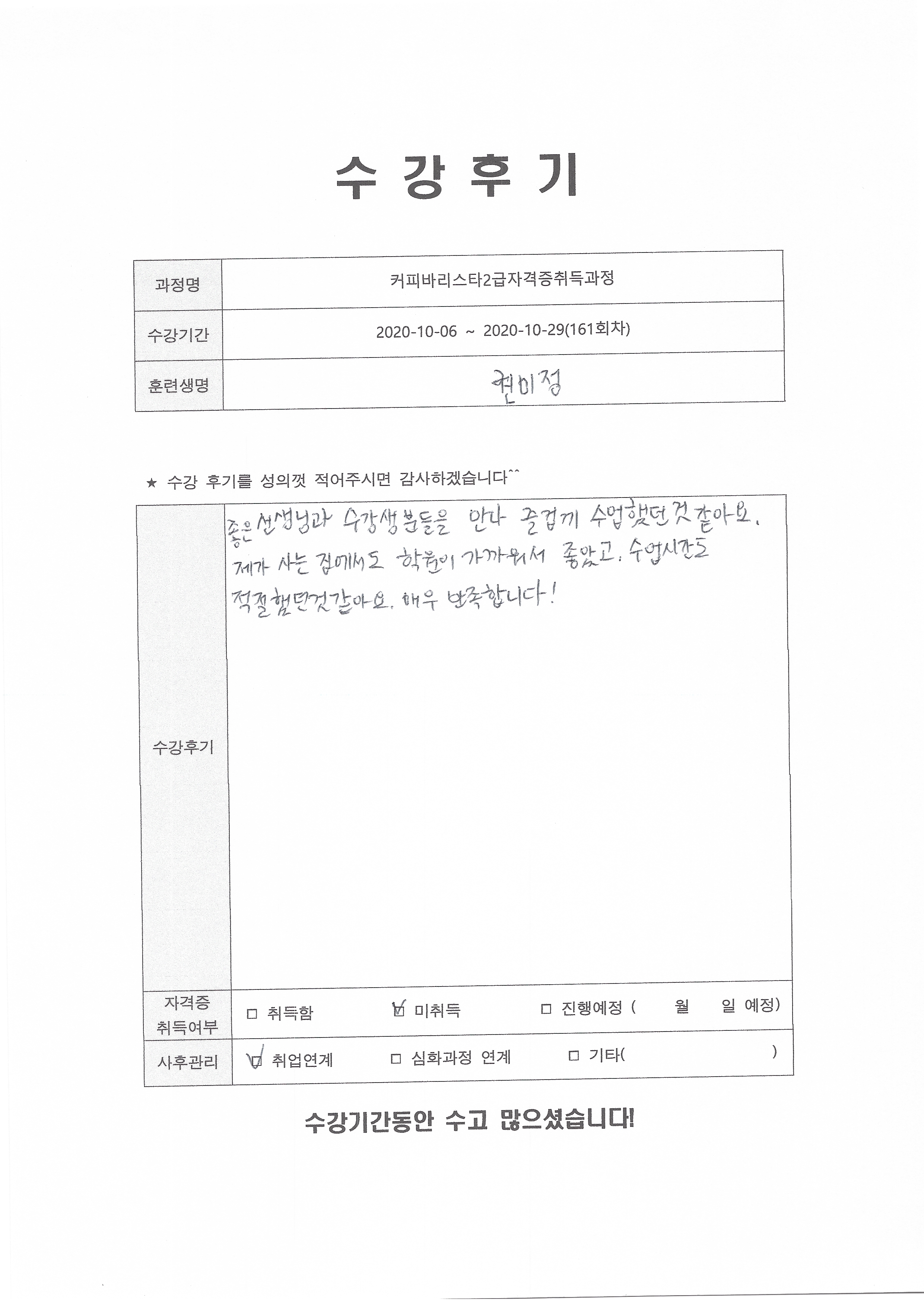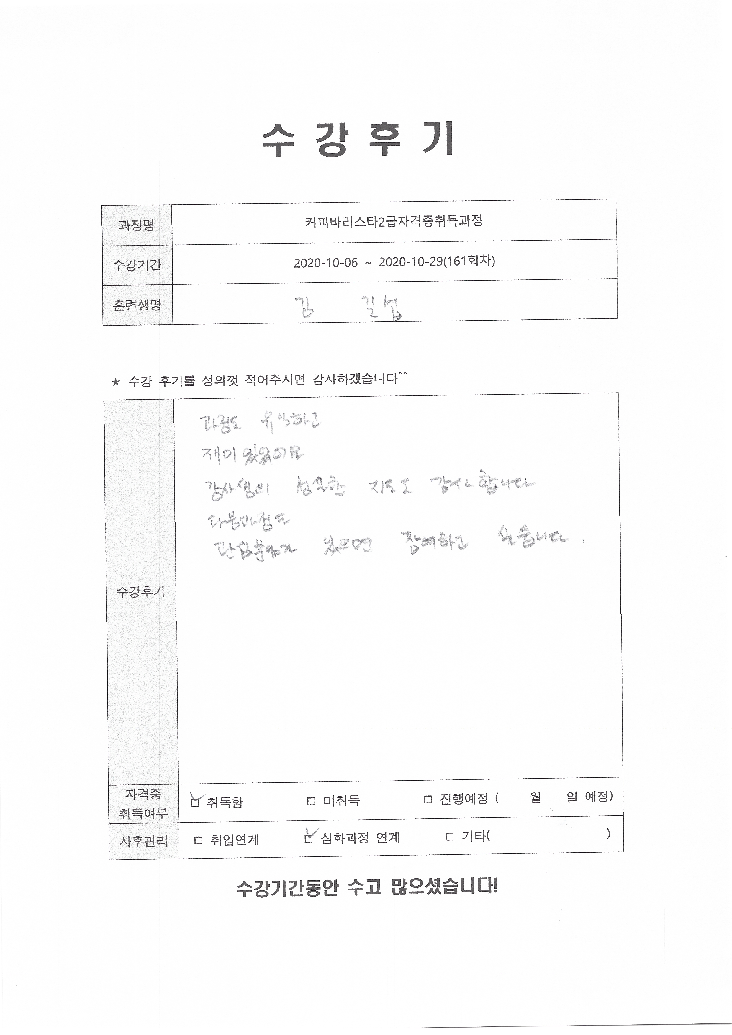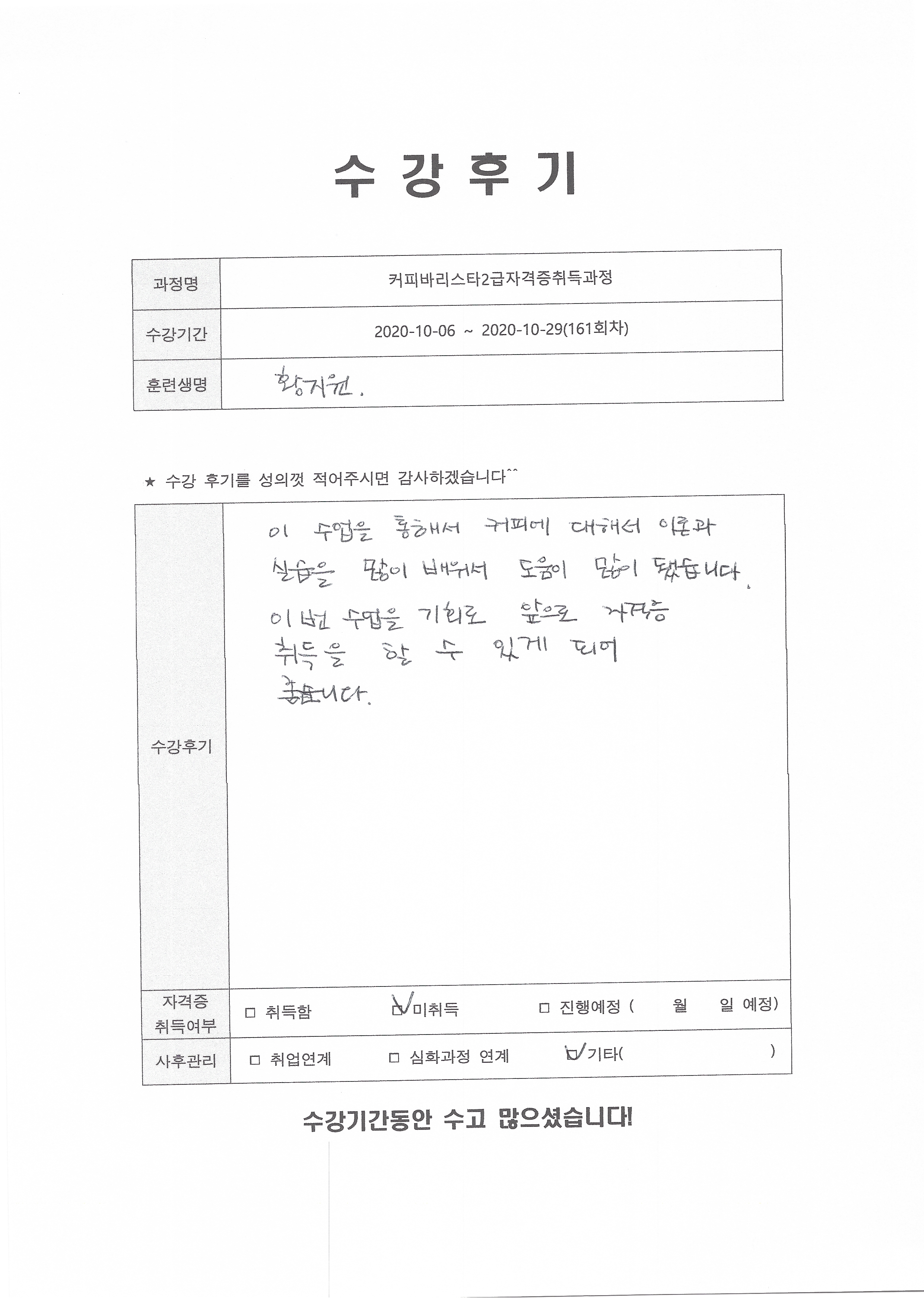 커피바리스타2급자격증취득과정 (161회차) 수강평