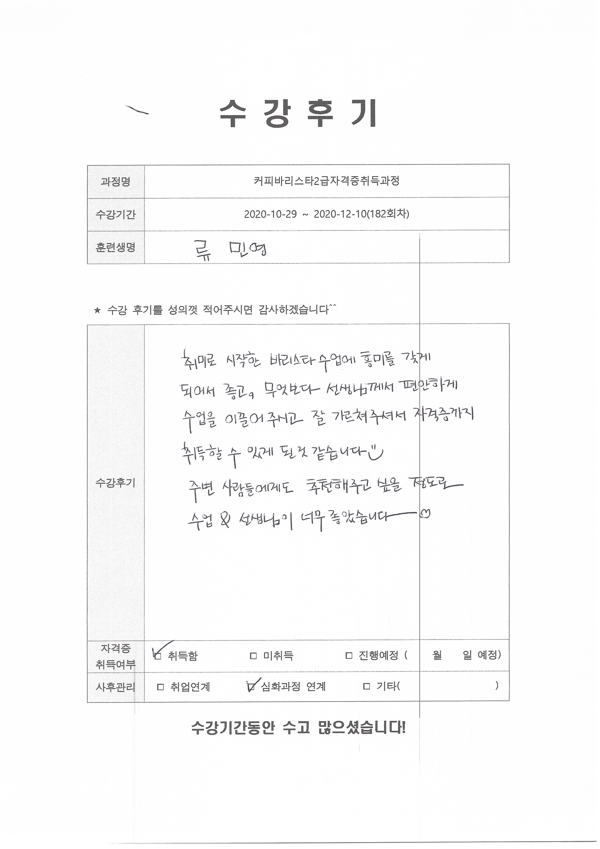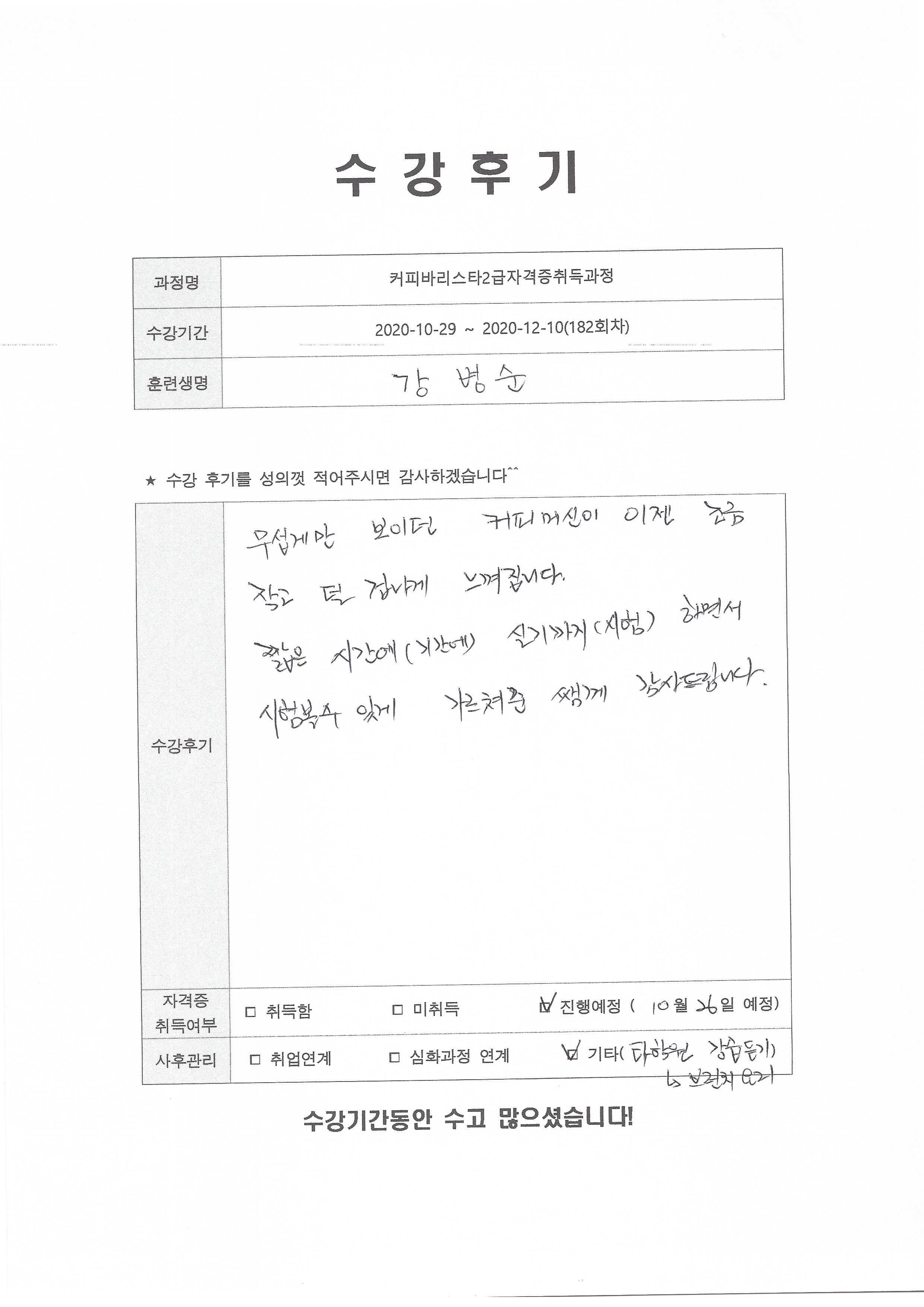 커피바리스타2급자격증취득과정 (182회차) 수강평