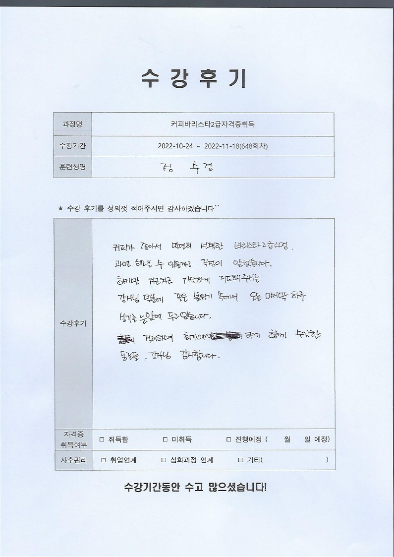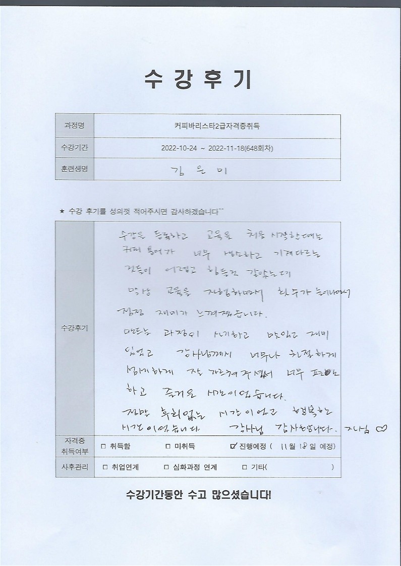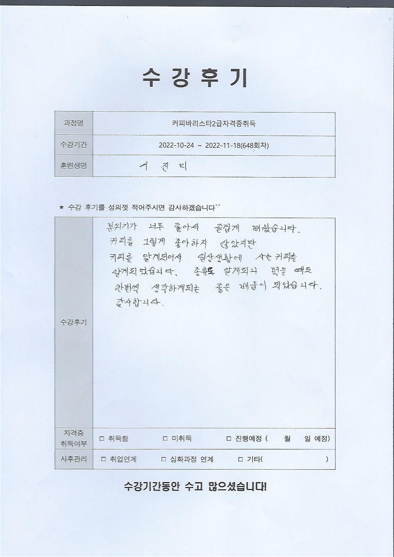 커피바리스타2급자격증취득 648회차 수강후기