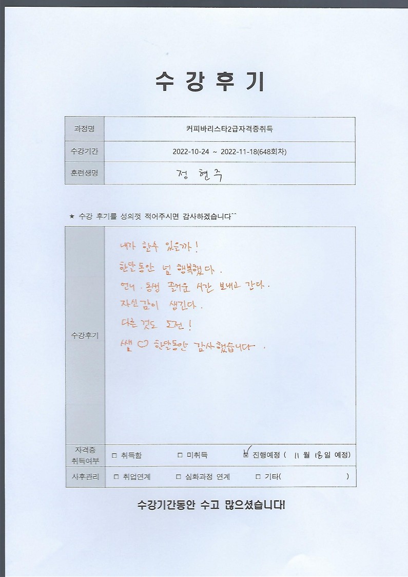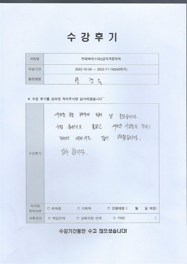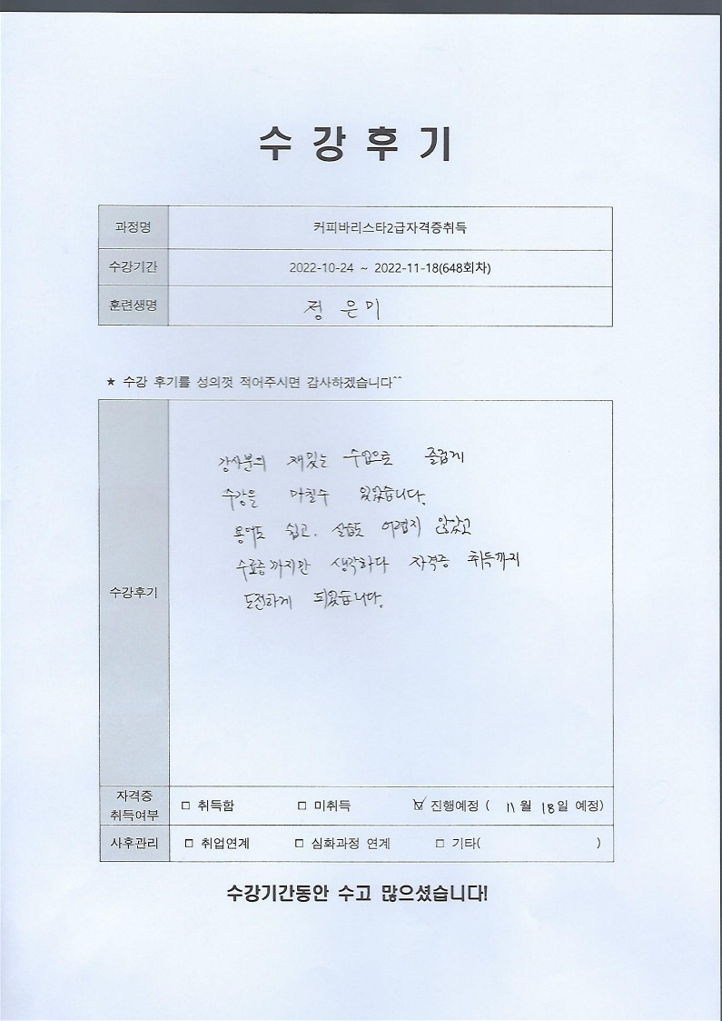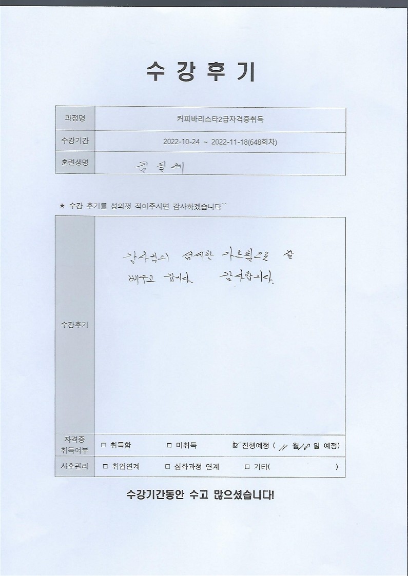 커피바리스타2급자격증취득 648회차 수강후기