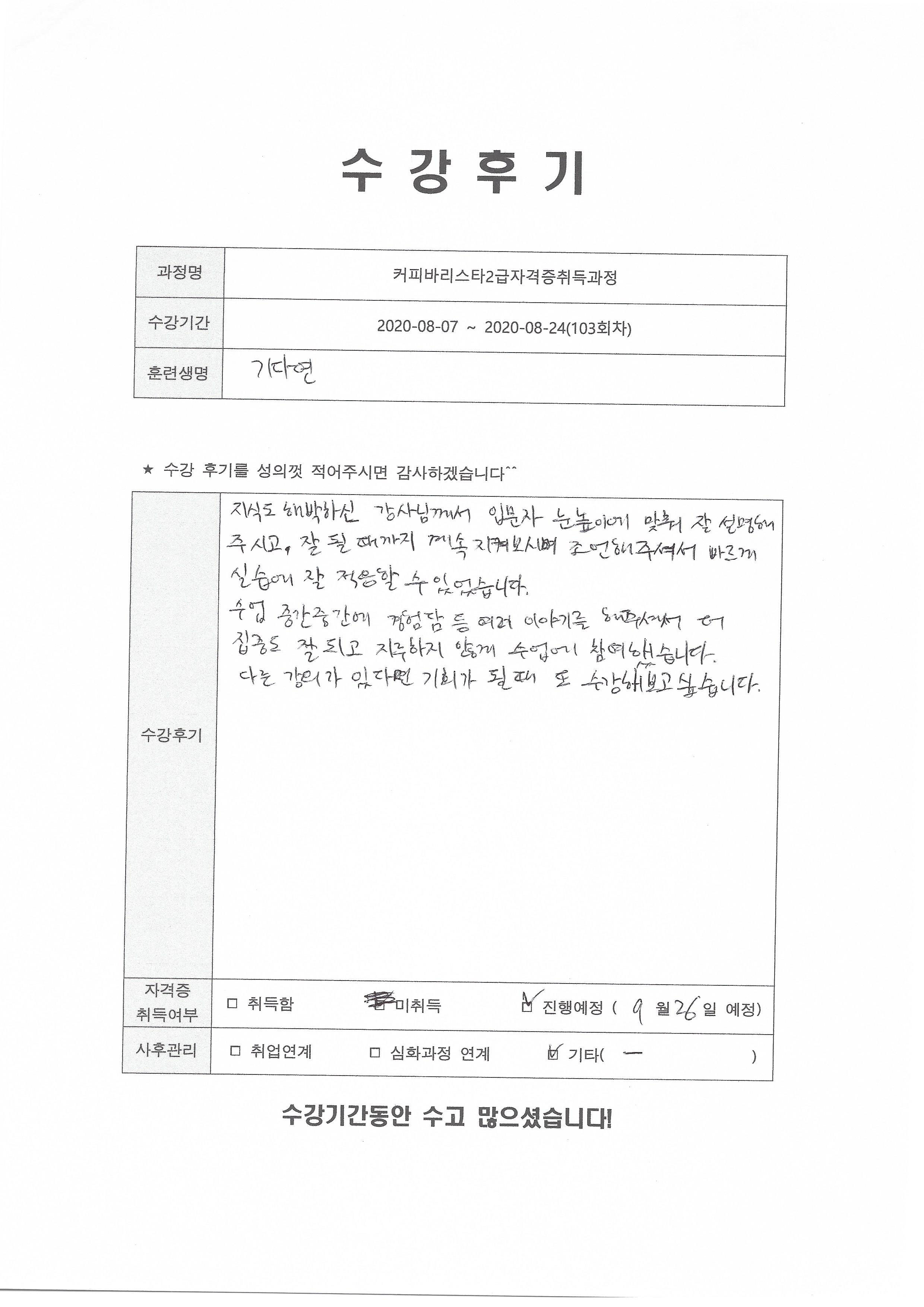 커피바리스타2급자격증취득과정(103회차) 수강평