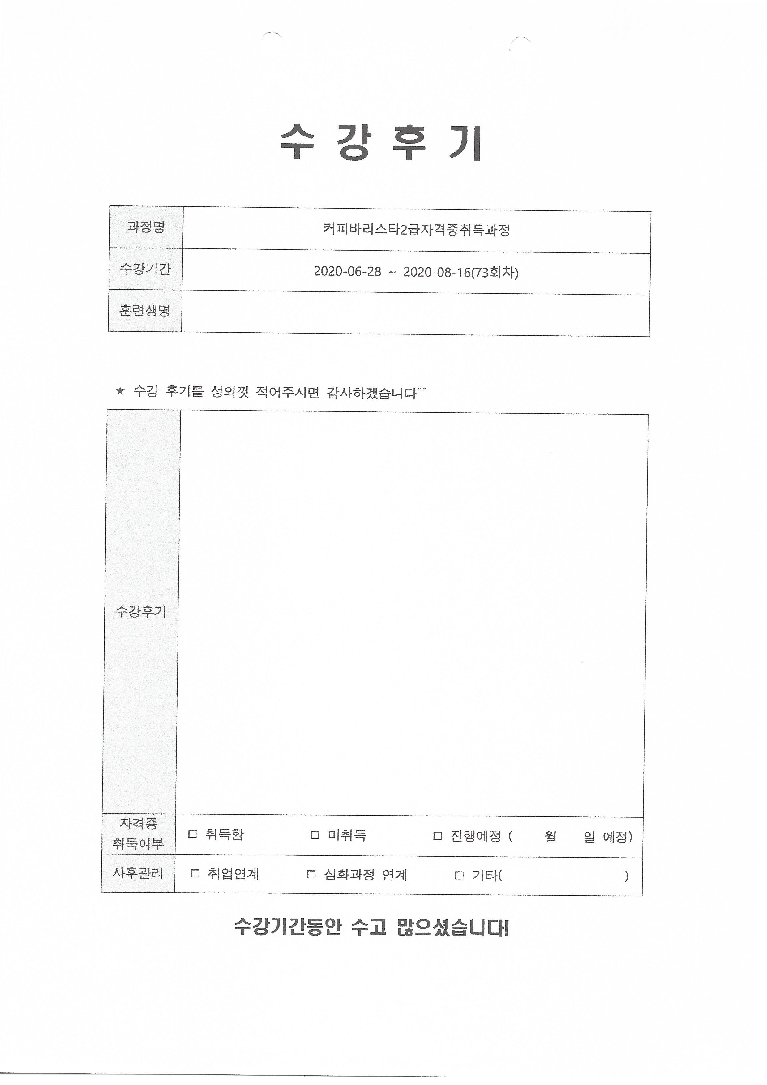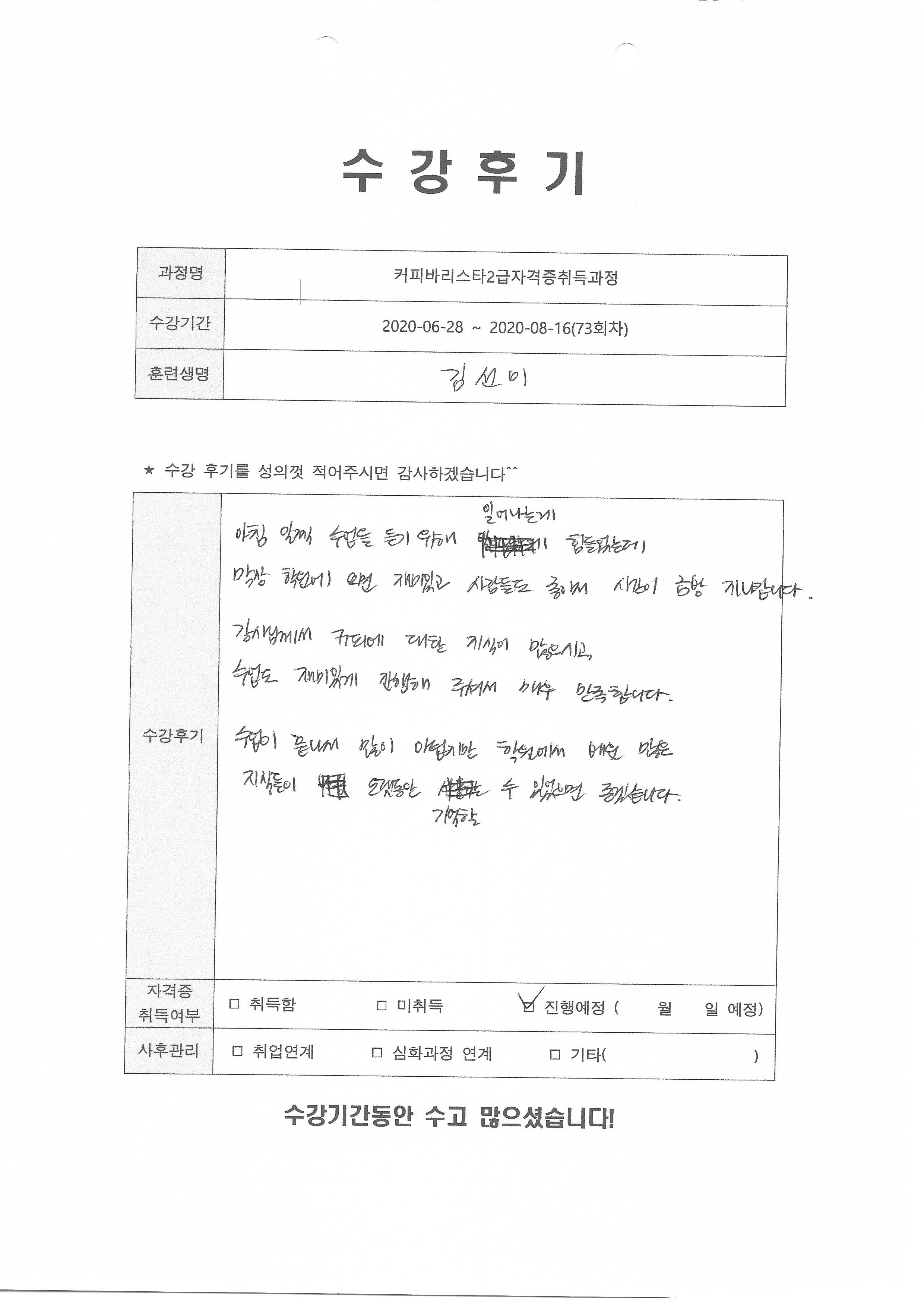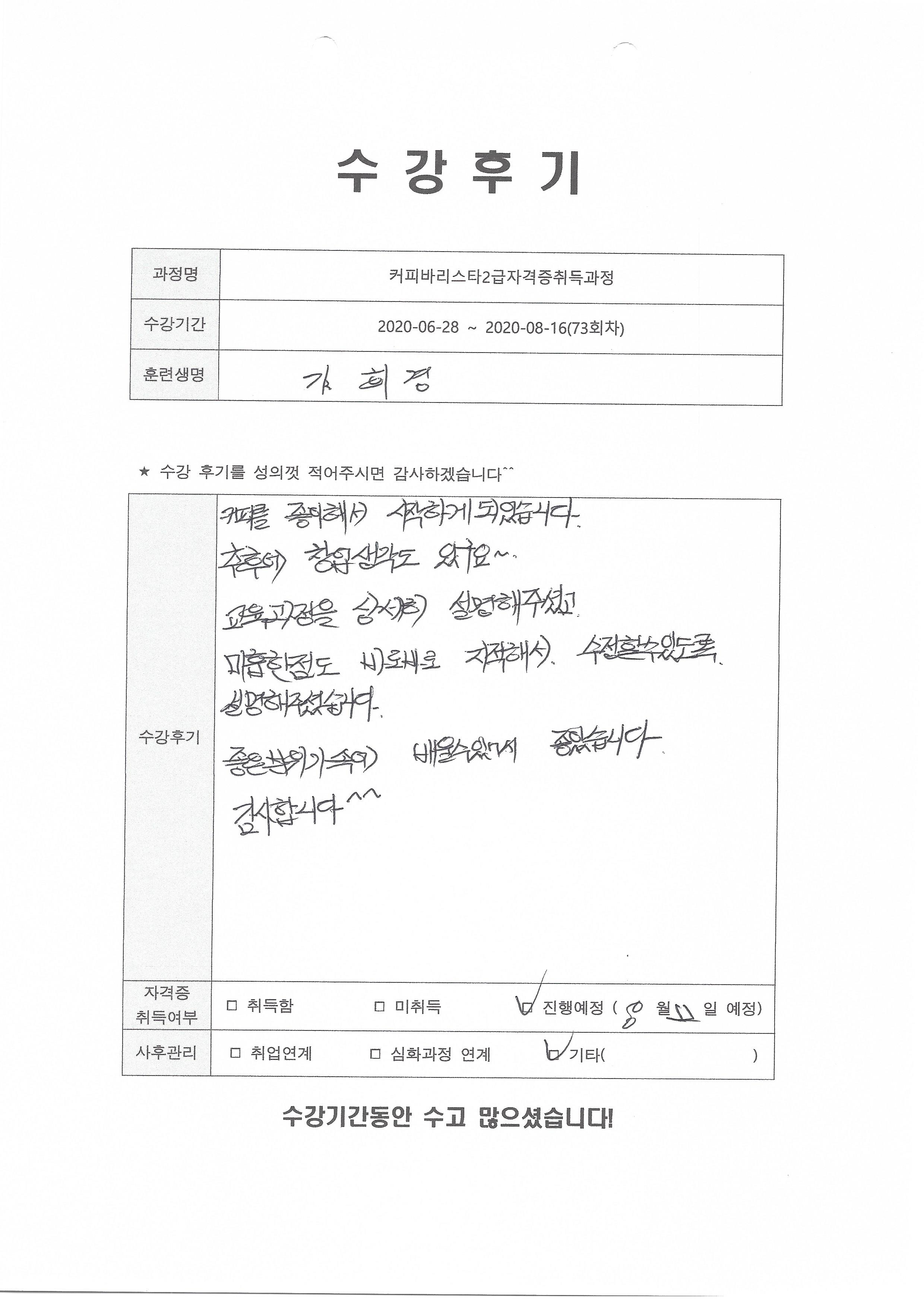 커피바리스타2급자격증취득과정(73회차) 수강평