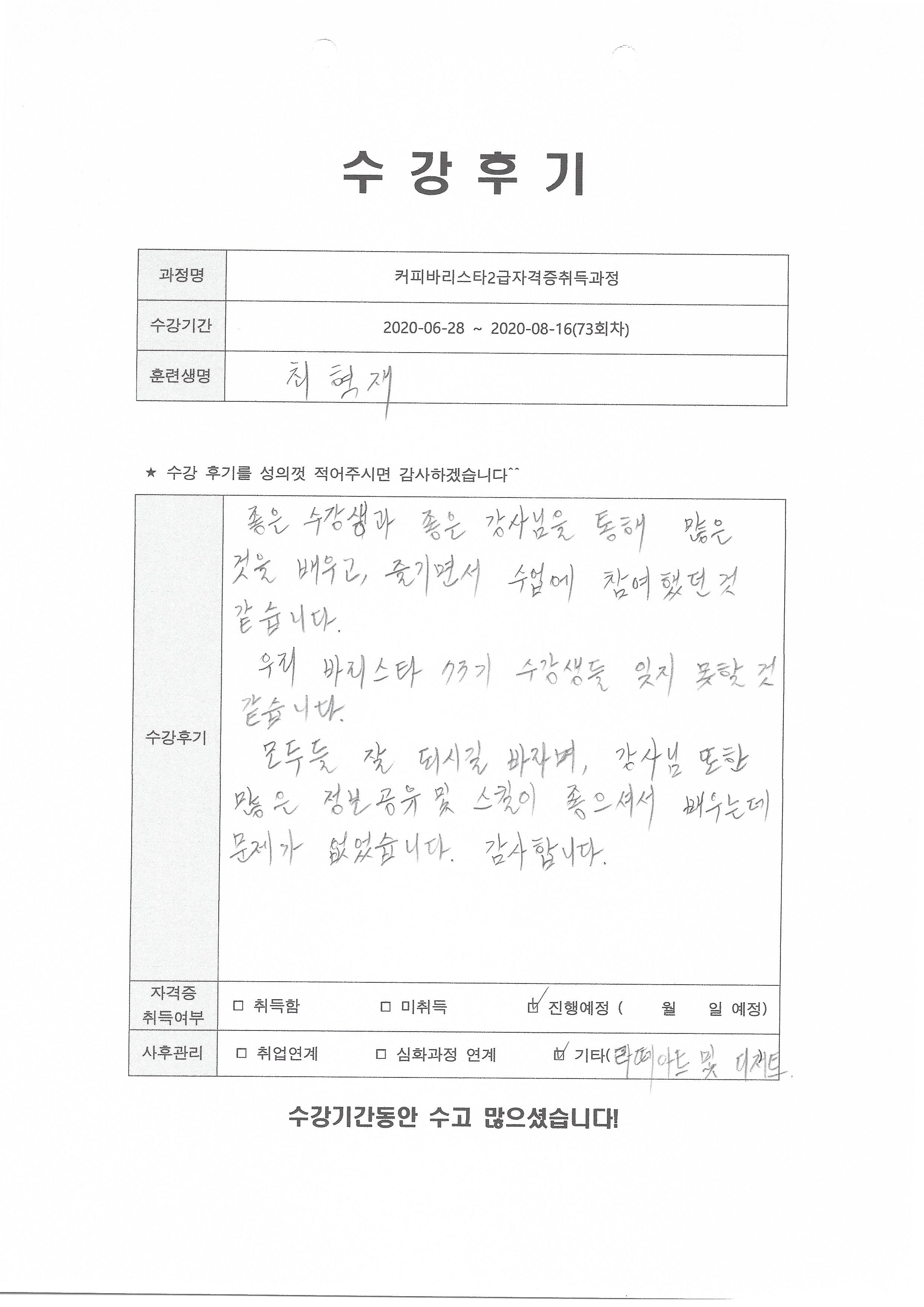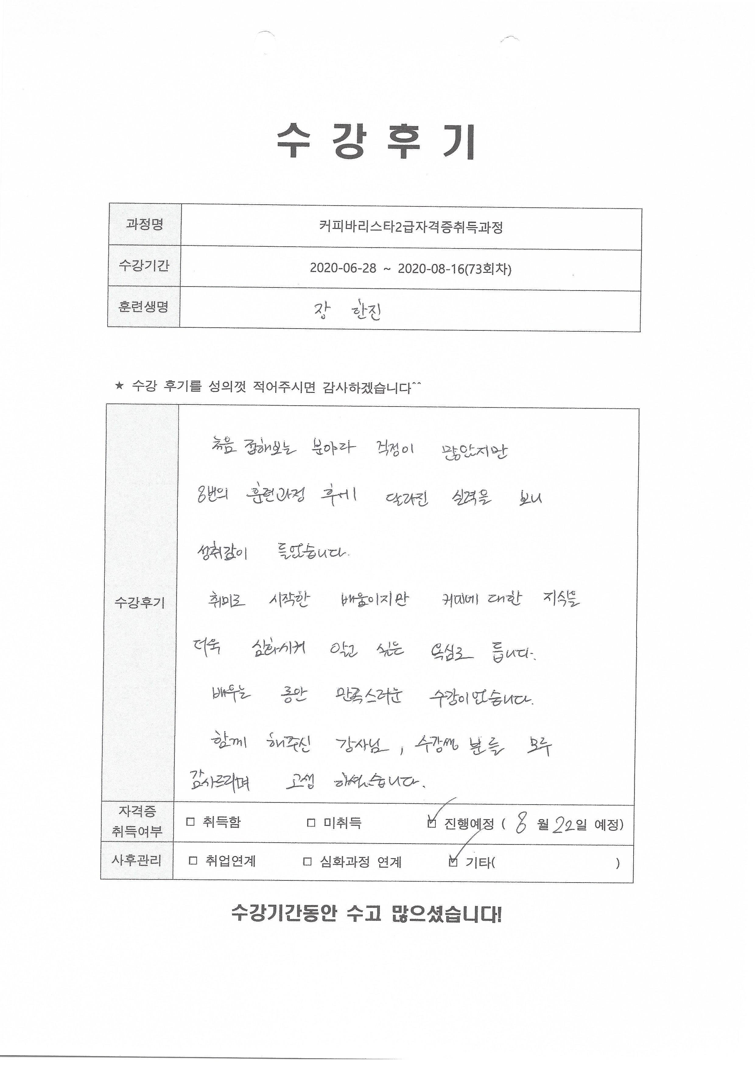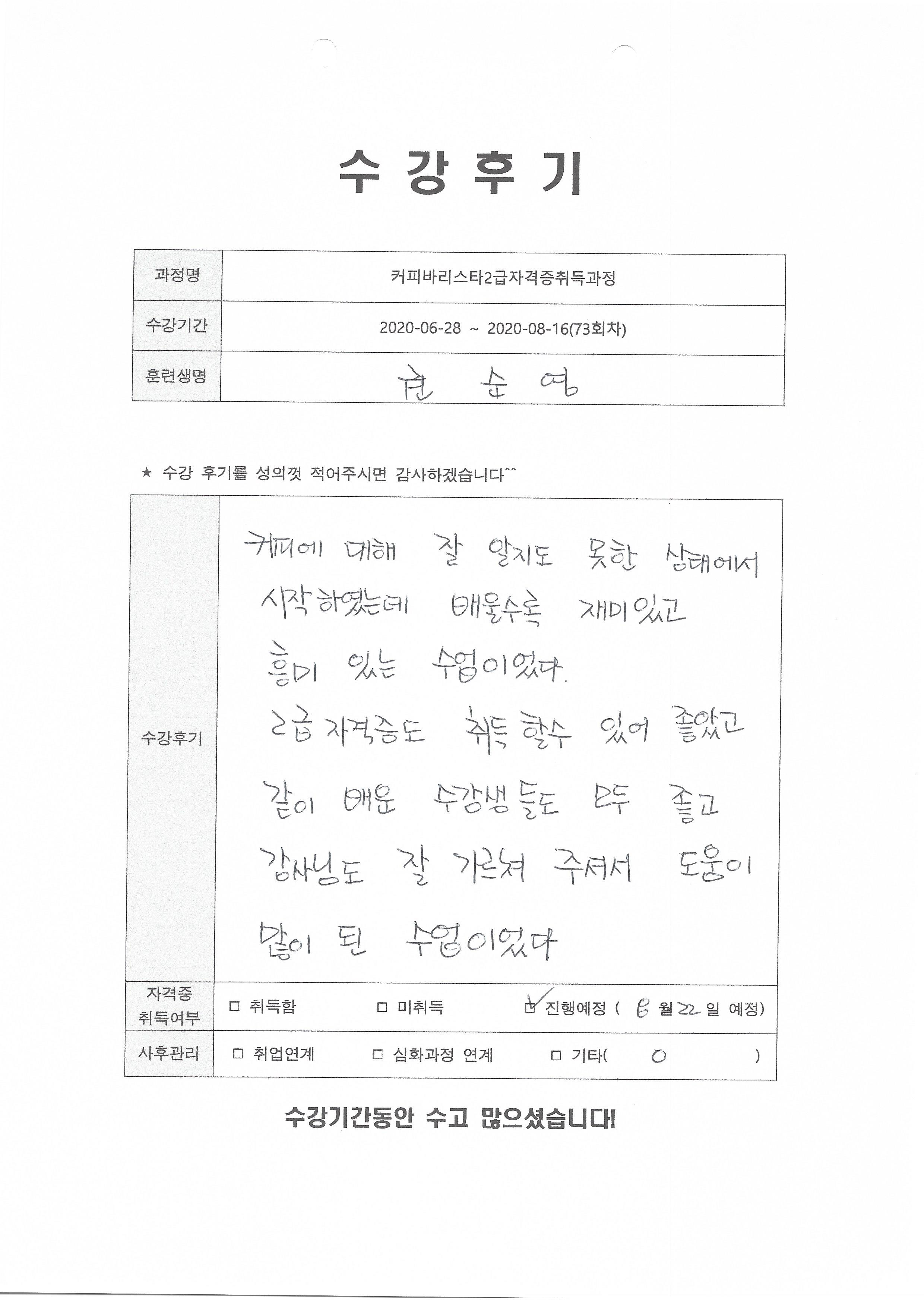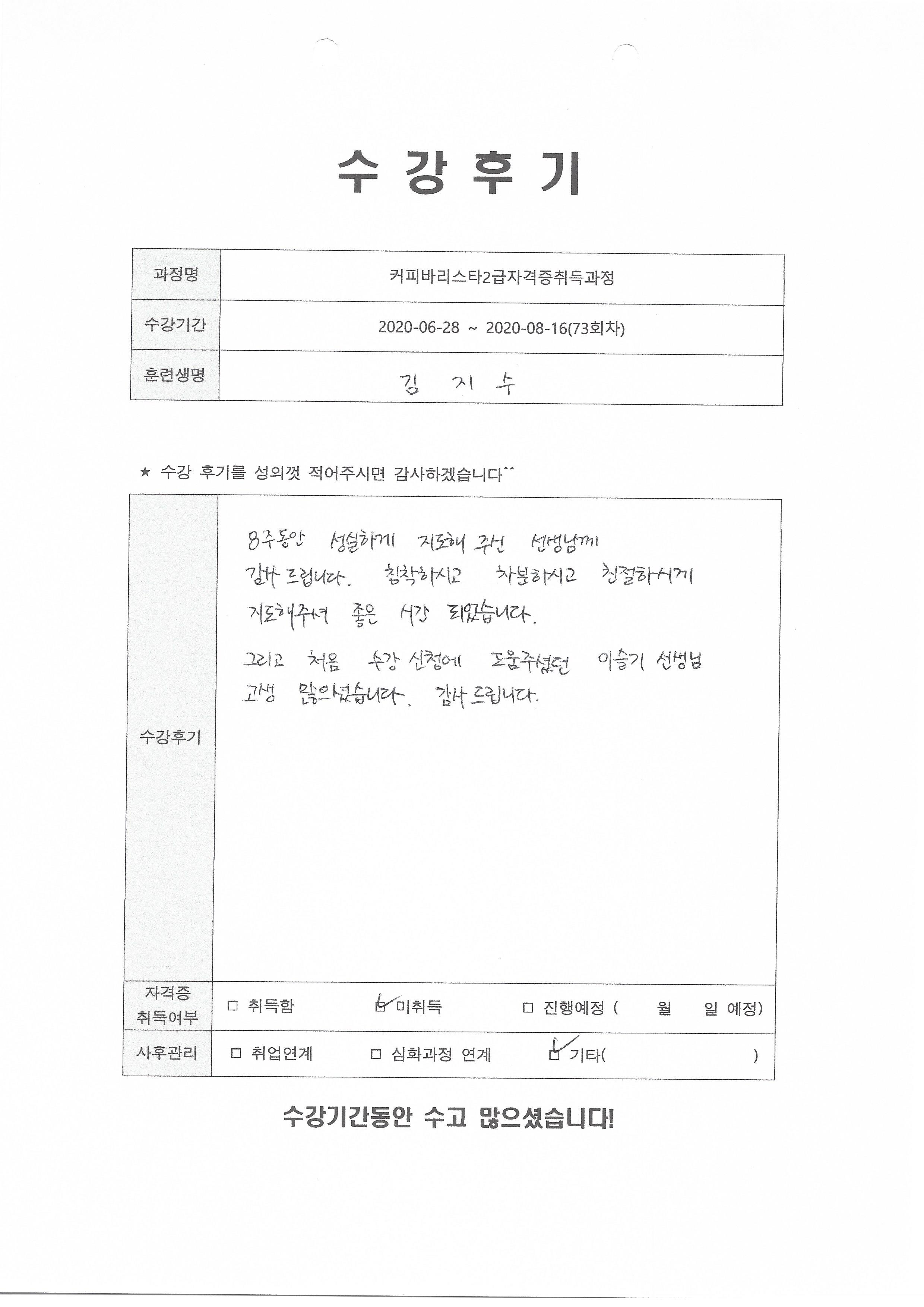 커피바리스타2급자격증취득과정(73회차) 수강평