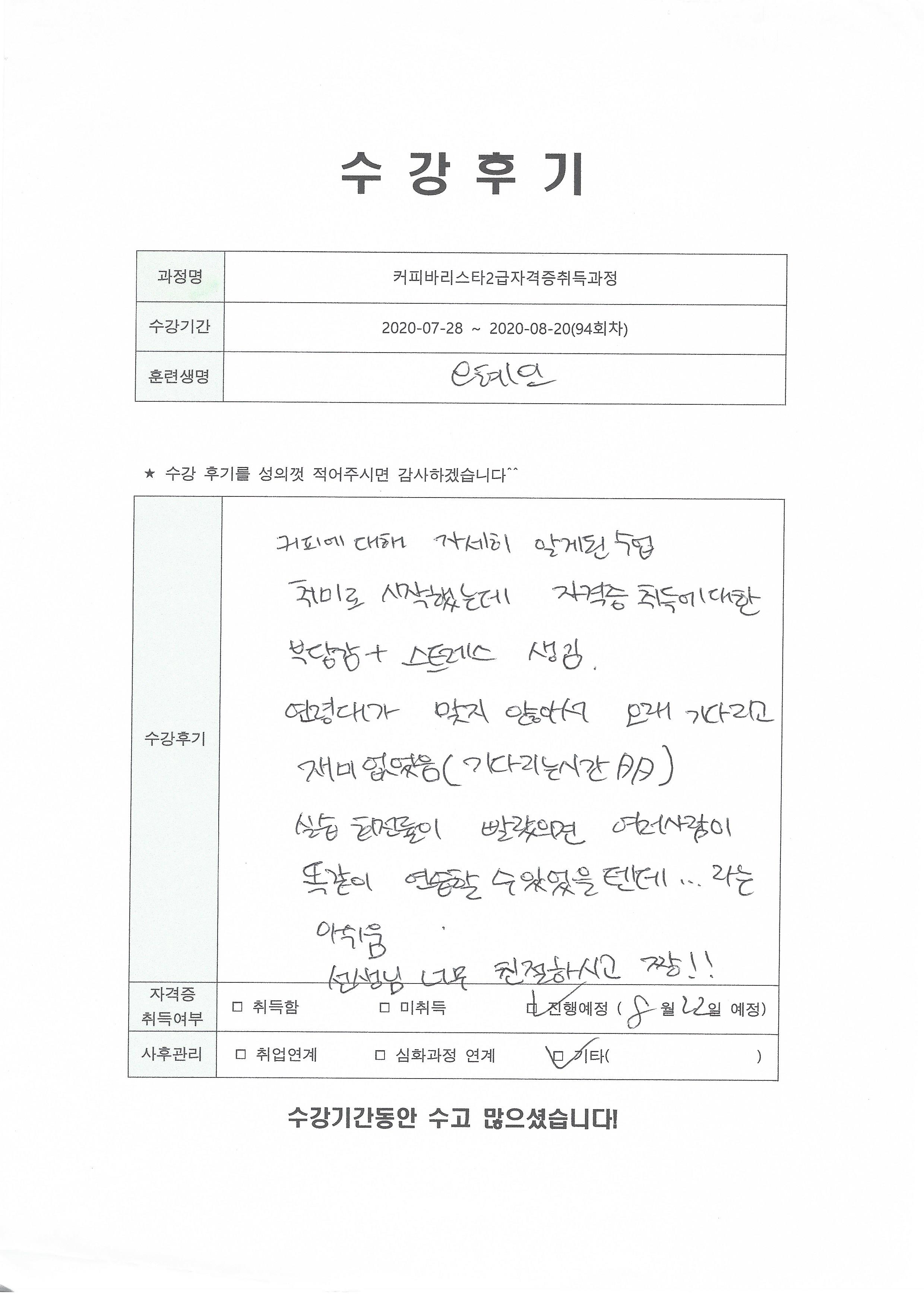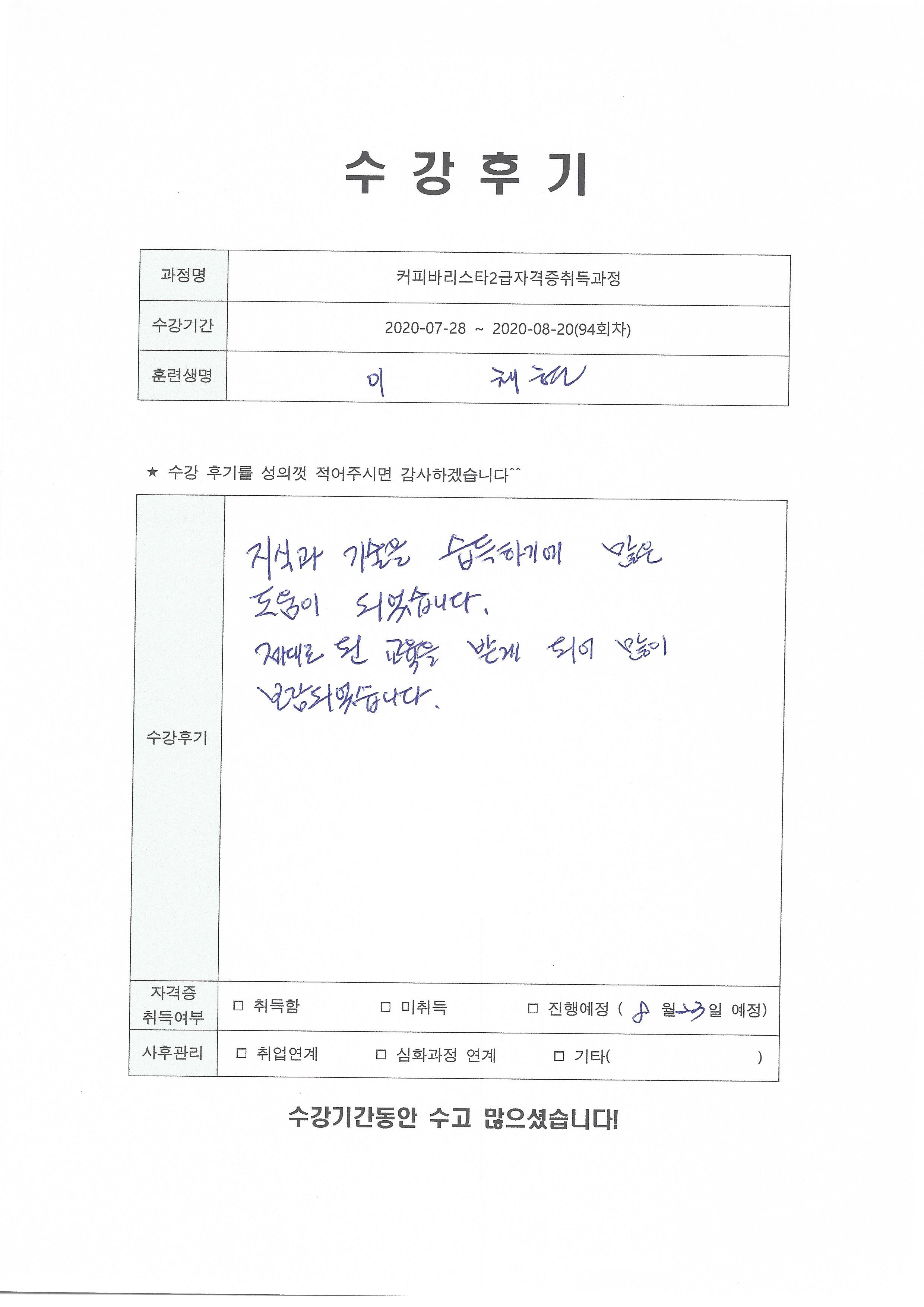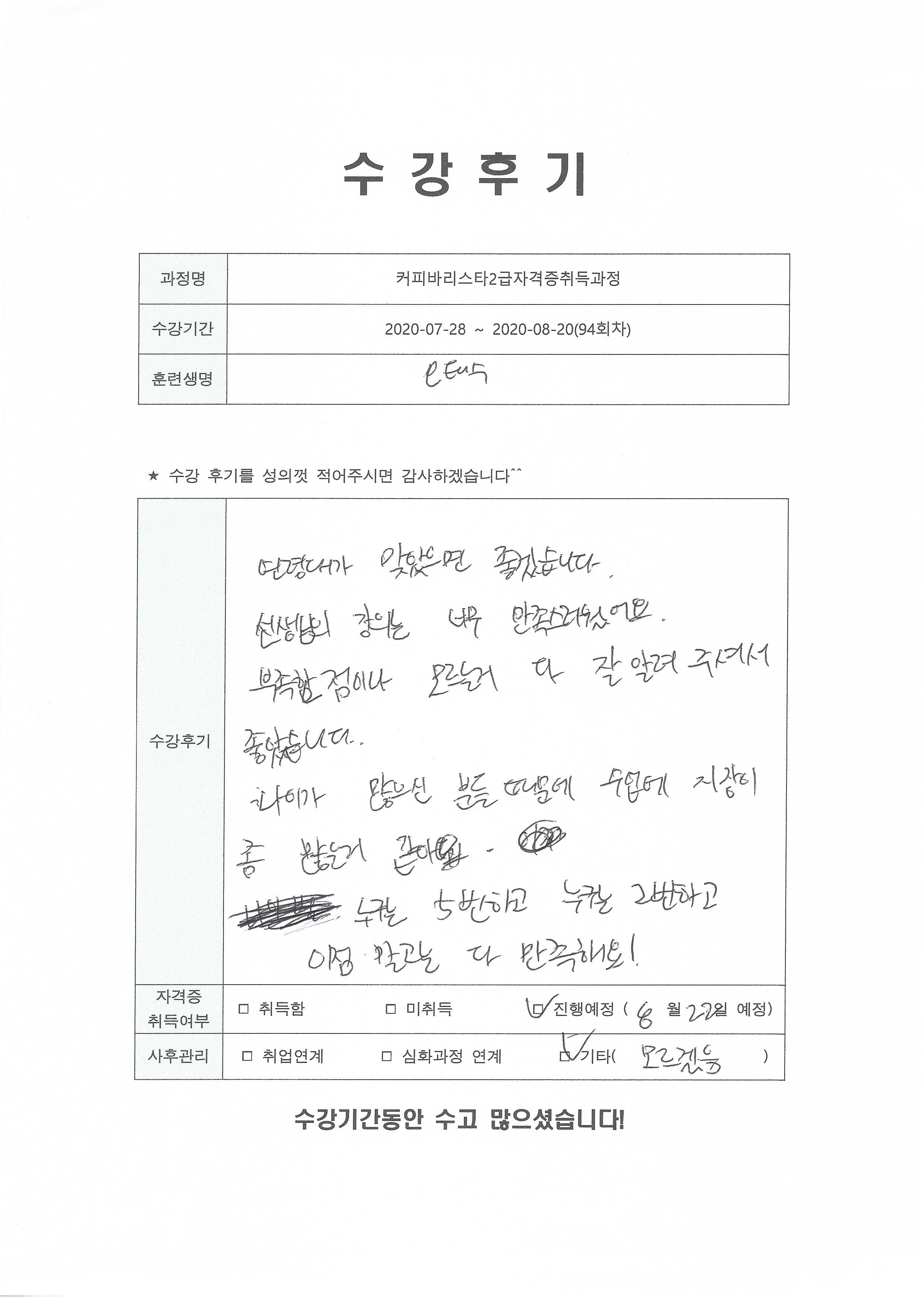커피바리스타2급자격증취득과정(94회차) 수강평