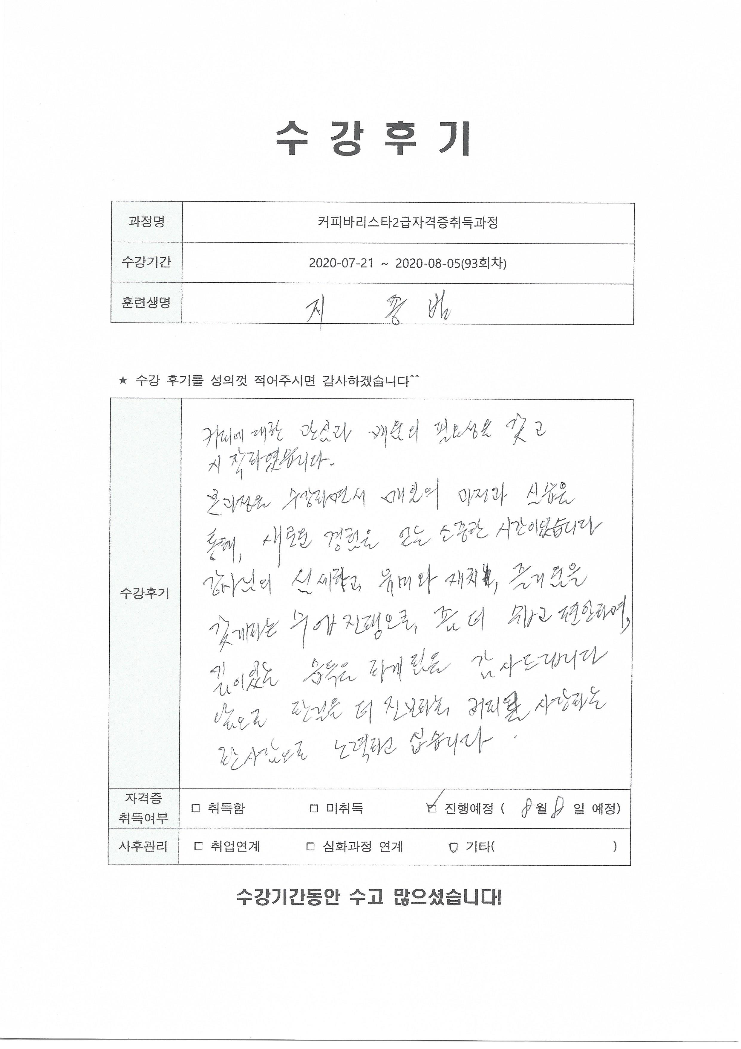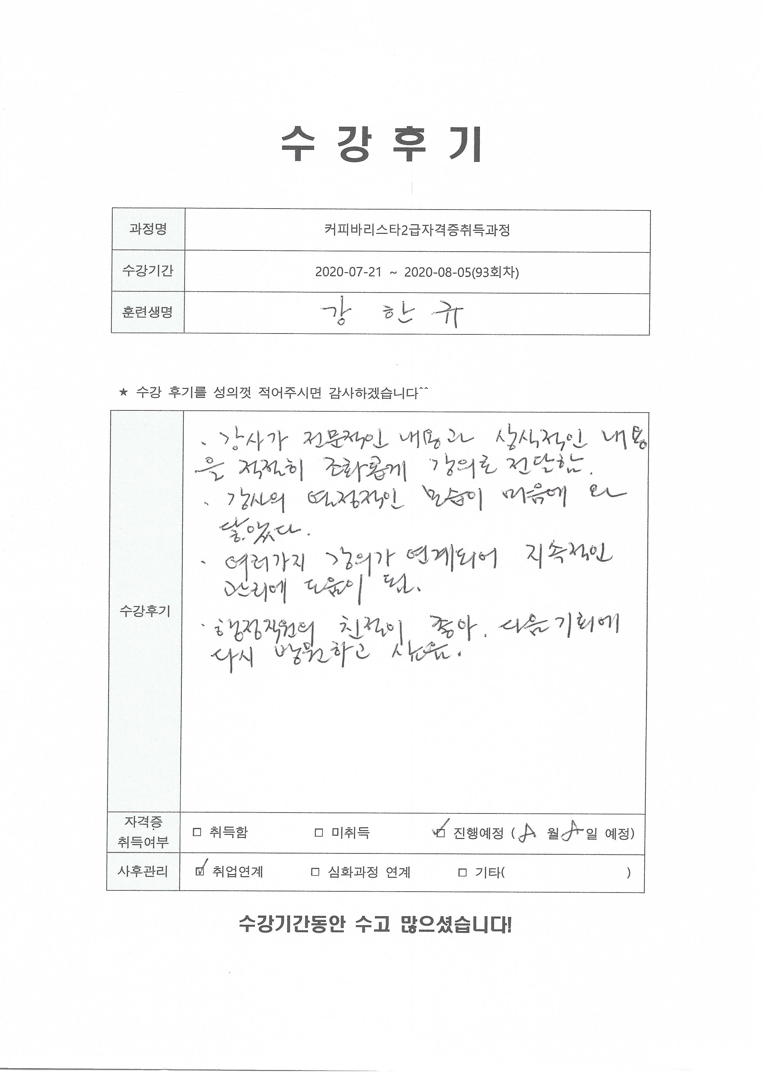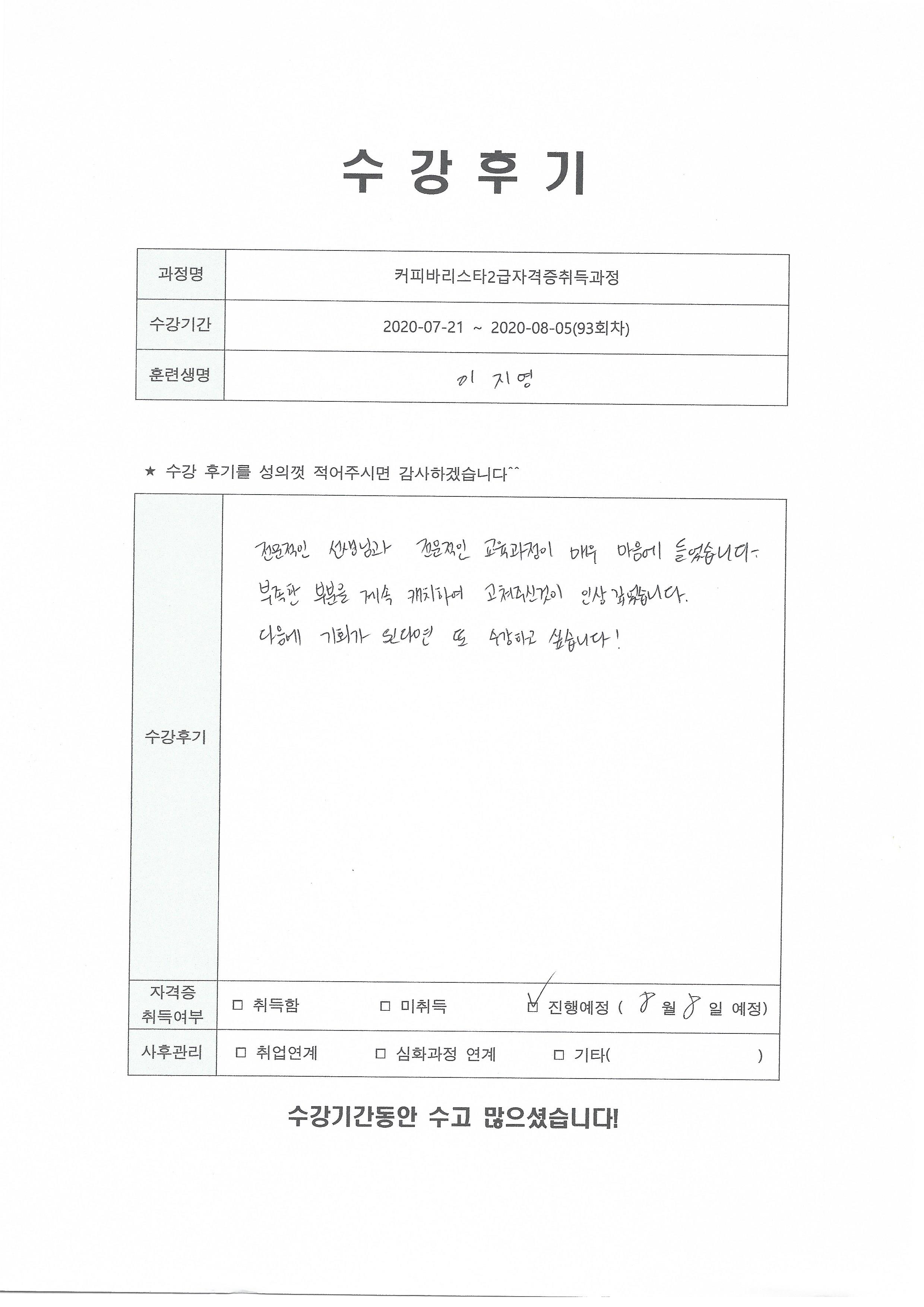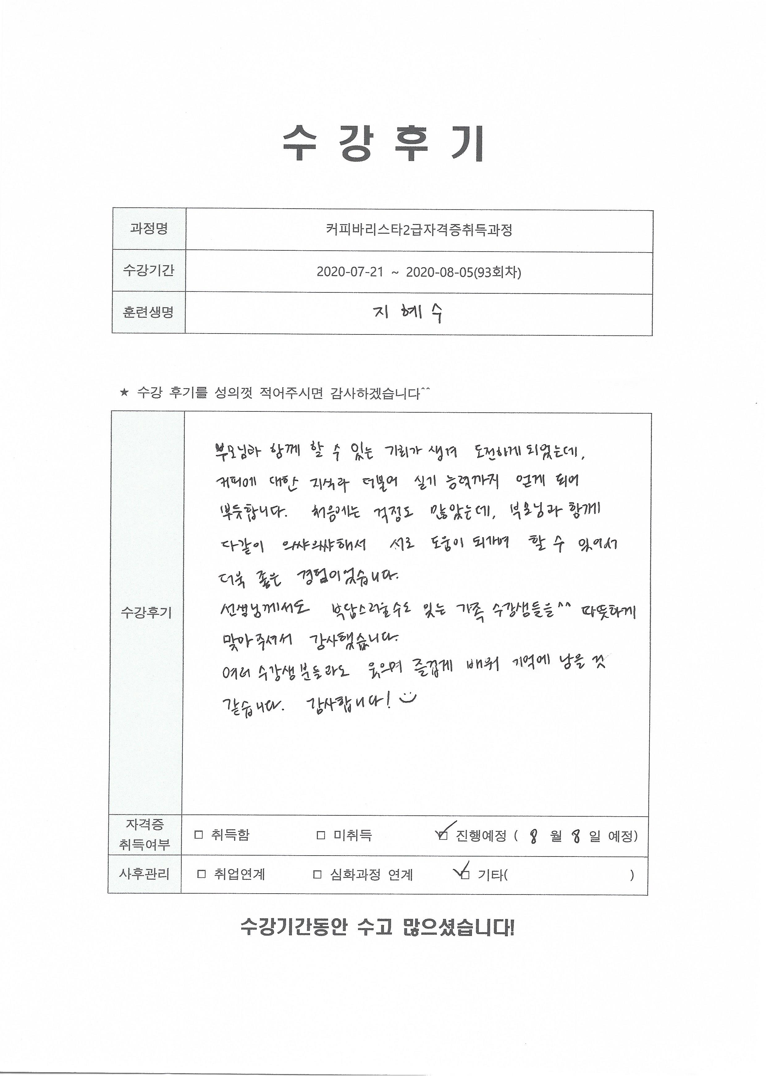 커피바리스타2급자격증취득과정(93회차) 수강평
