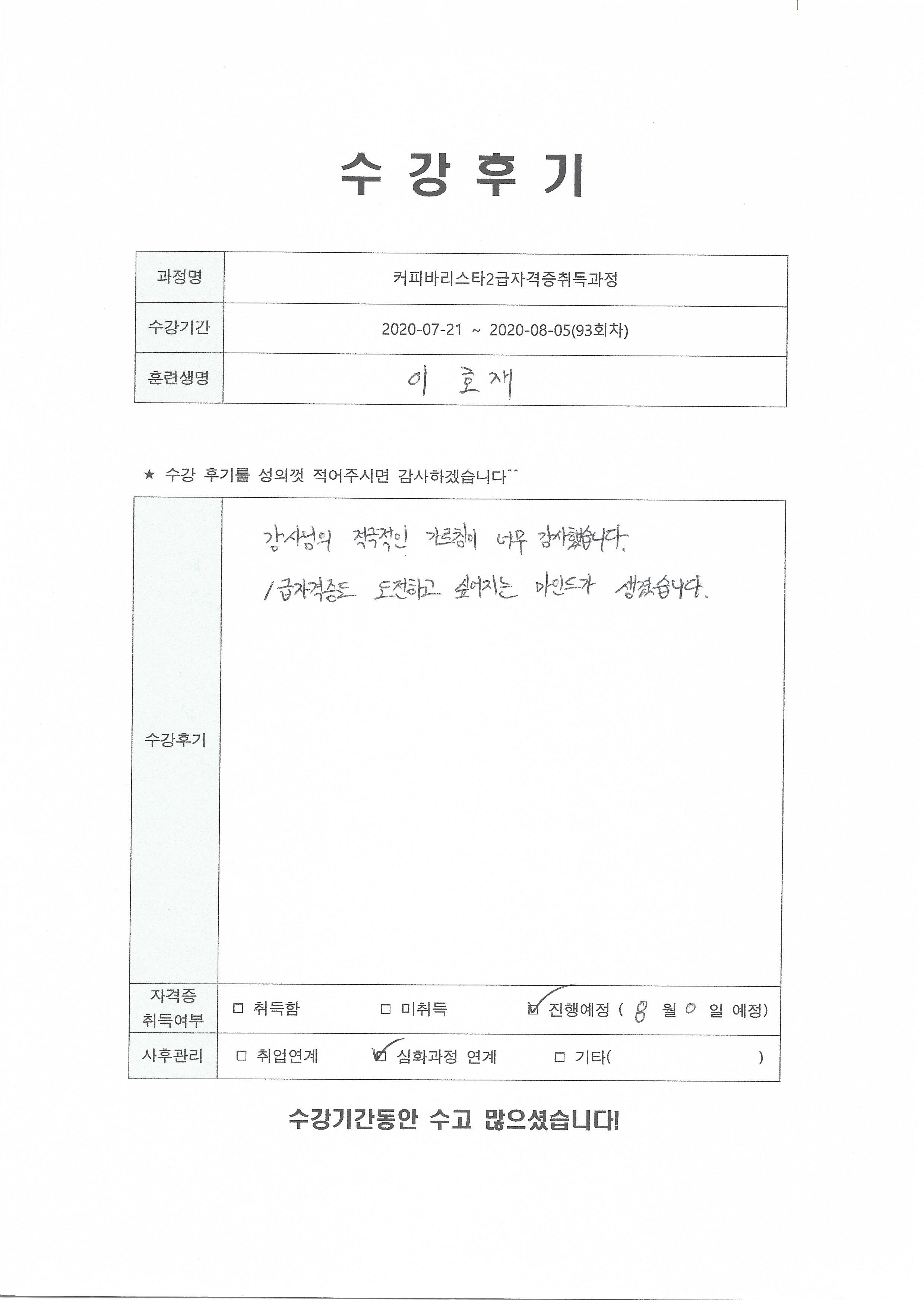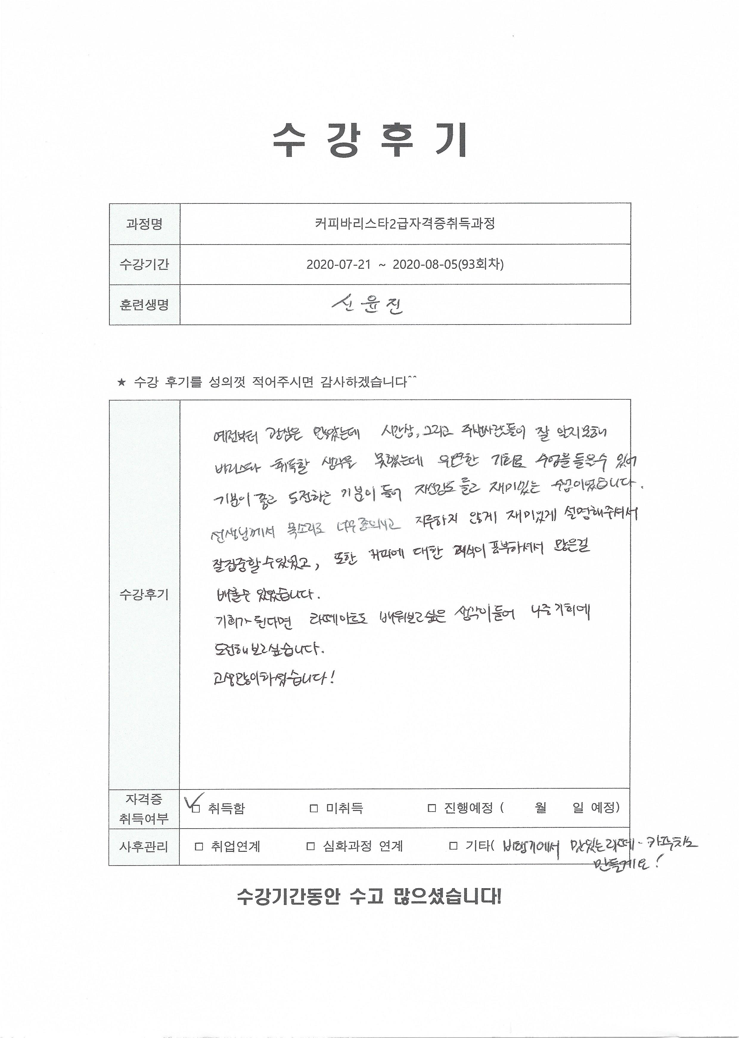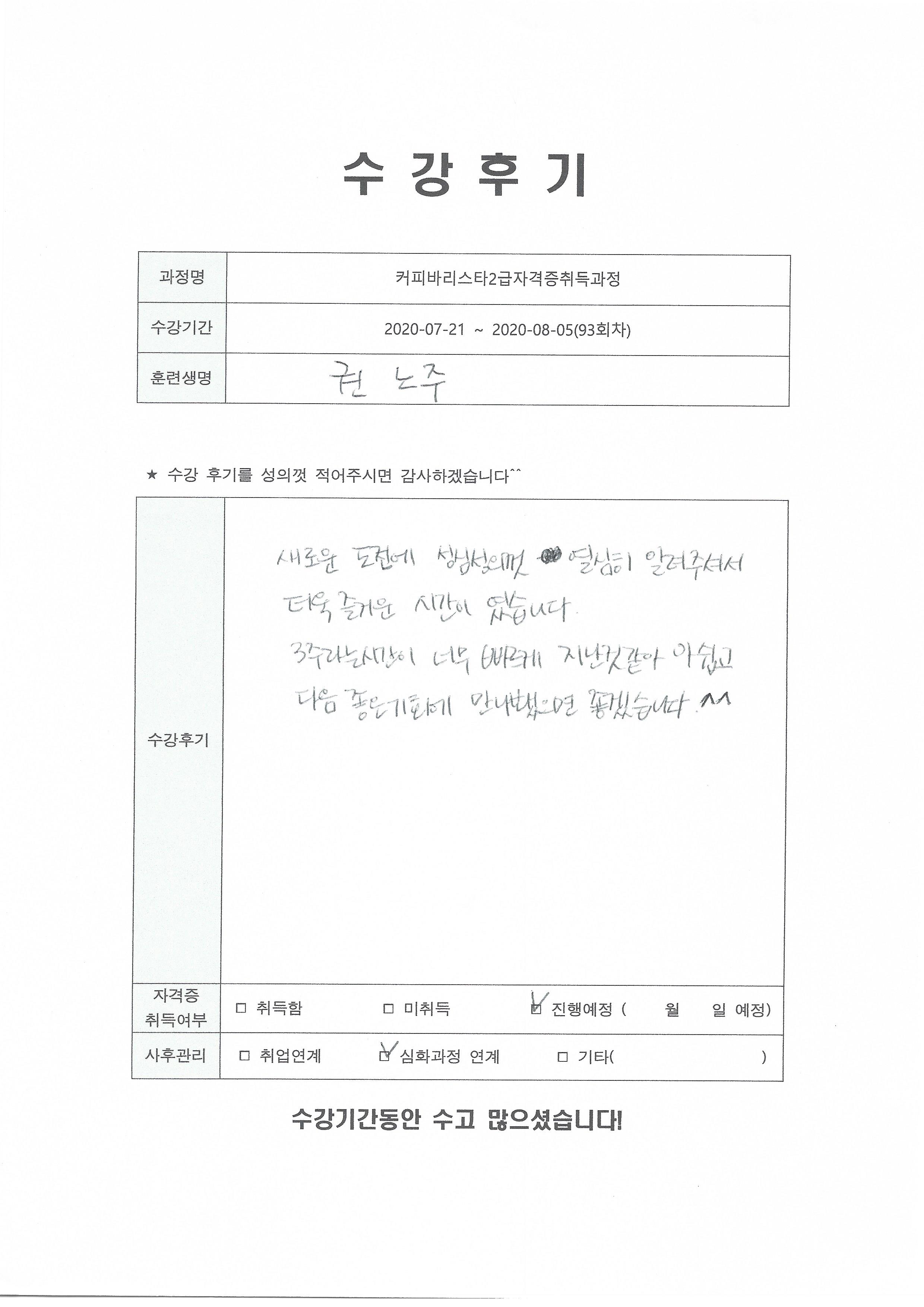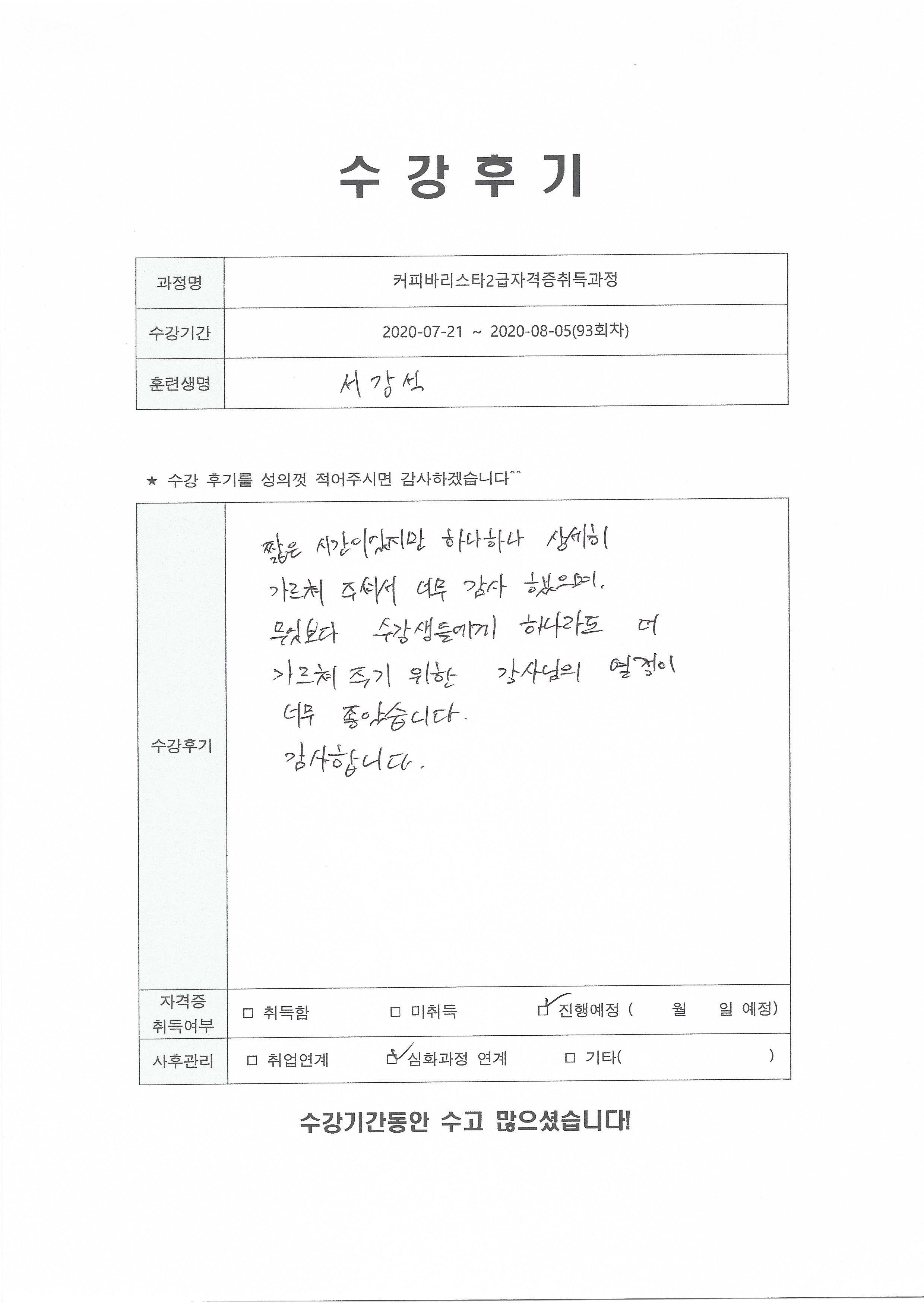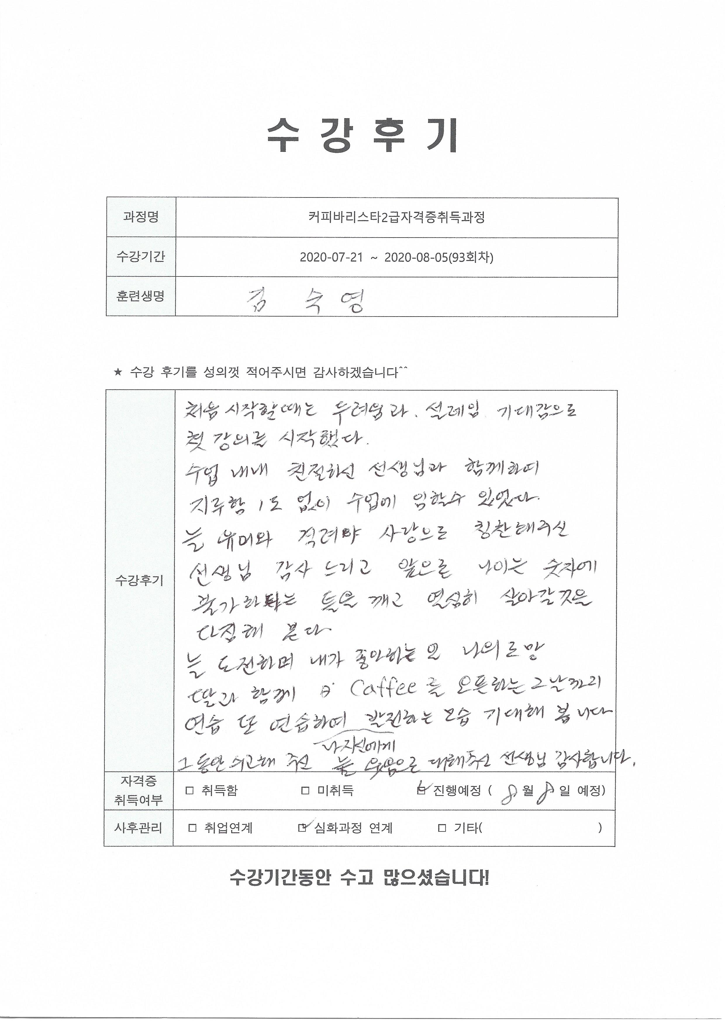커피바리스타2급자격증취득과정(93회차) 수강평