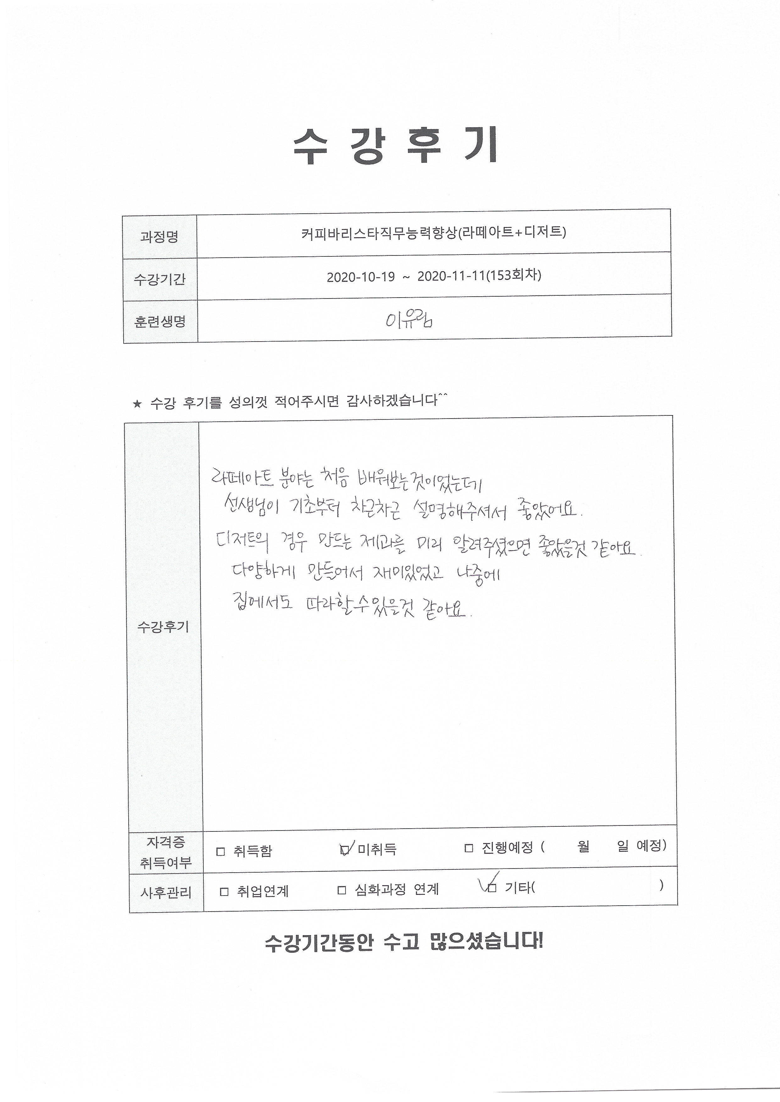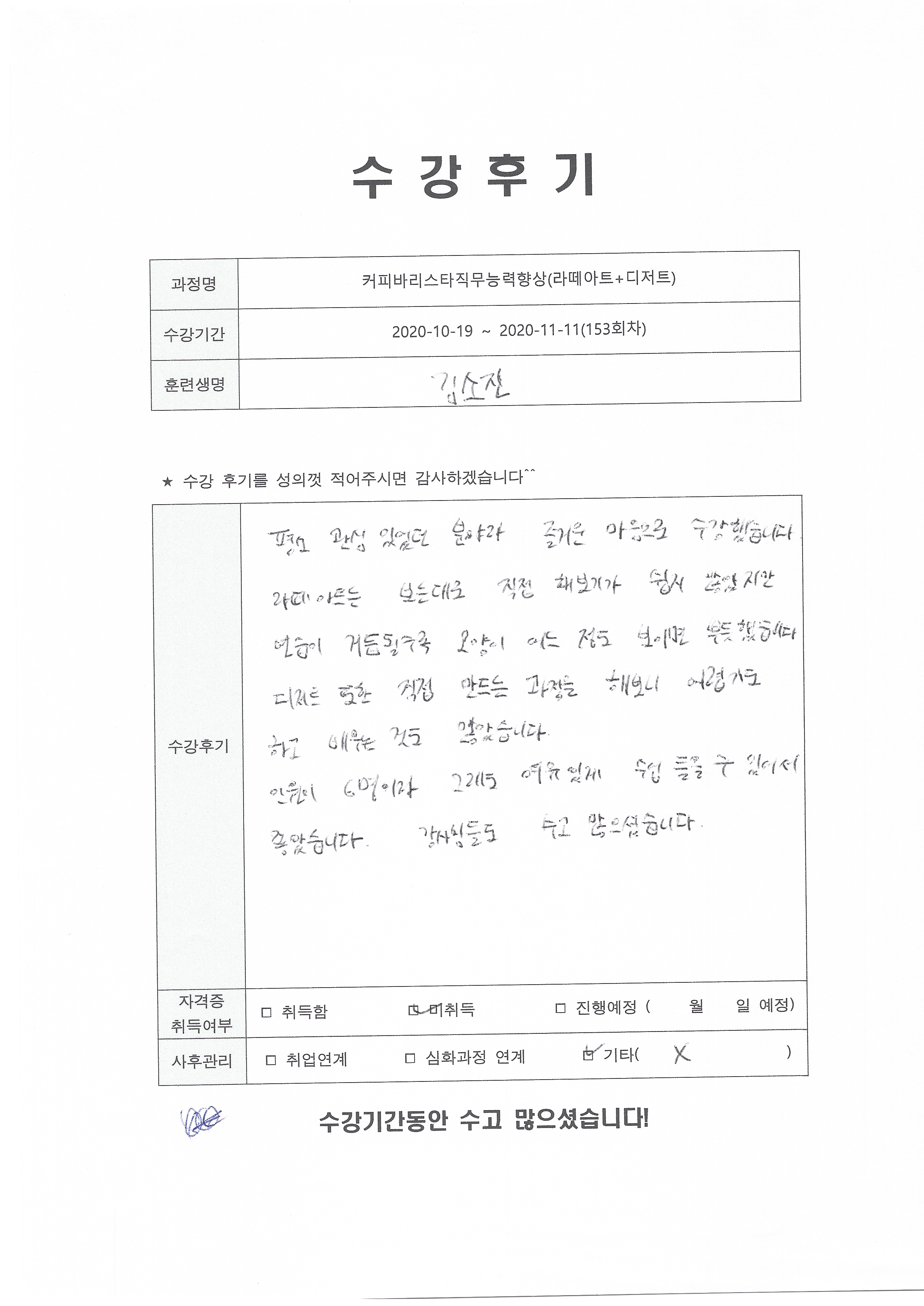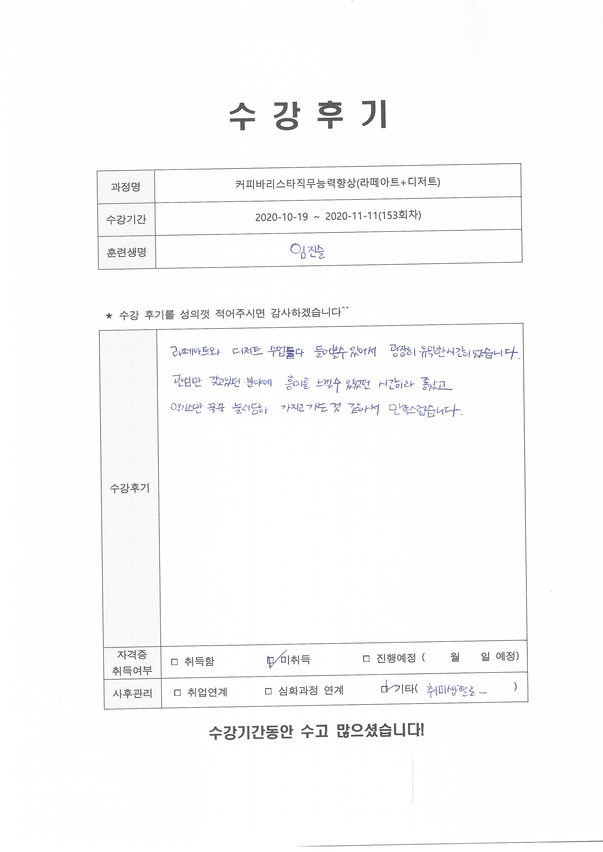 커피바리스타직무능력향상 (라떼아트+디저트)(153회차) 수강평