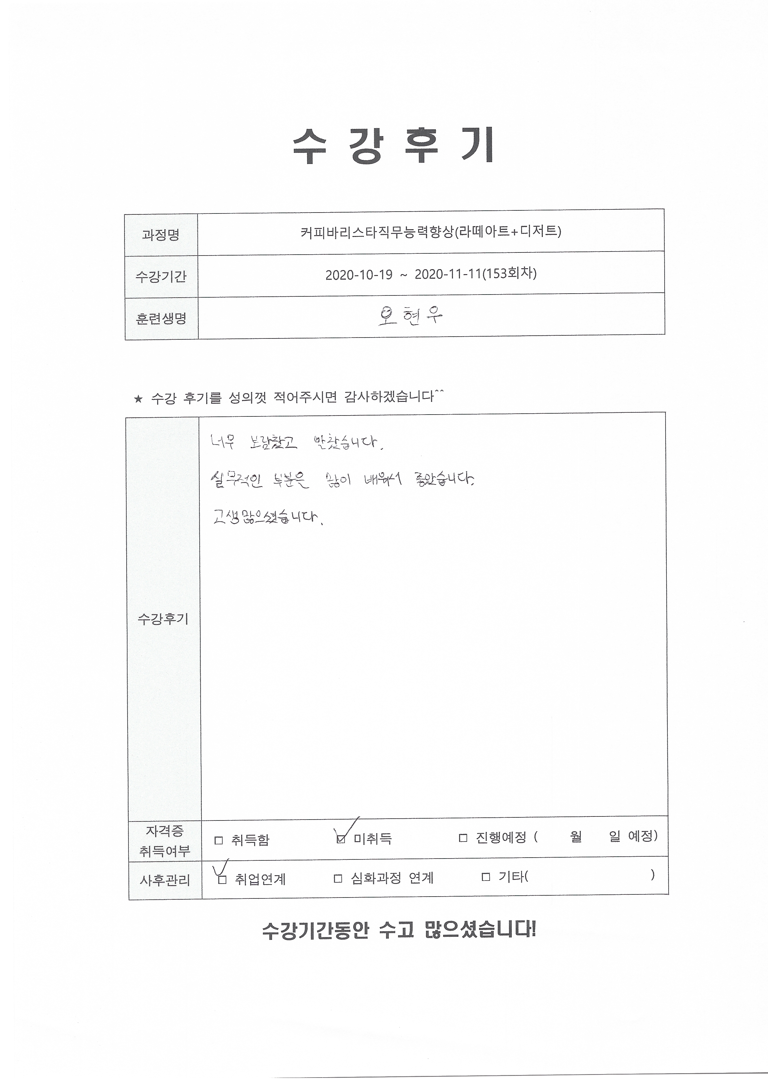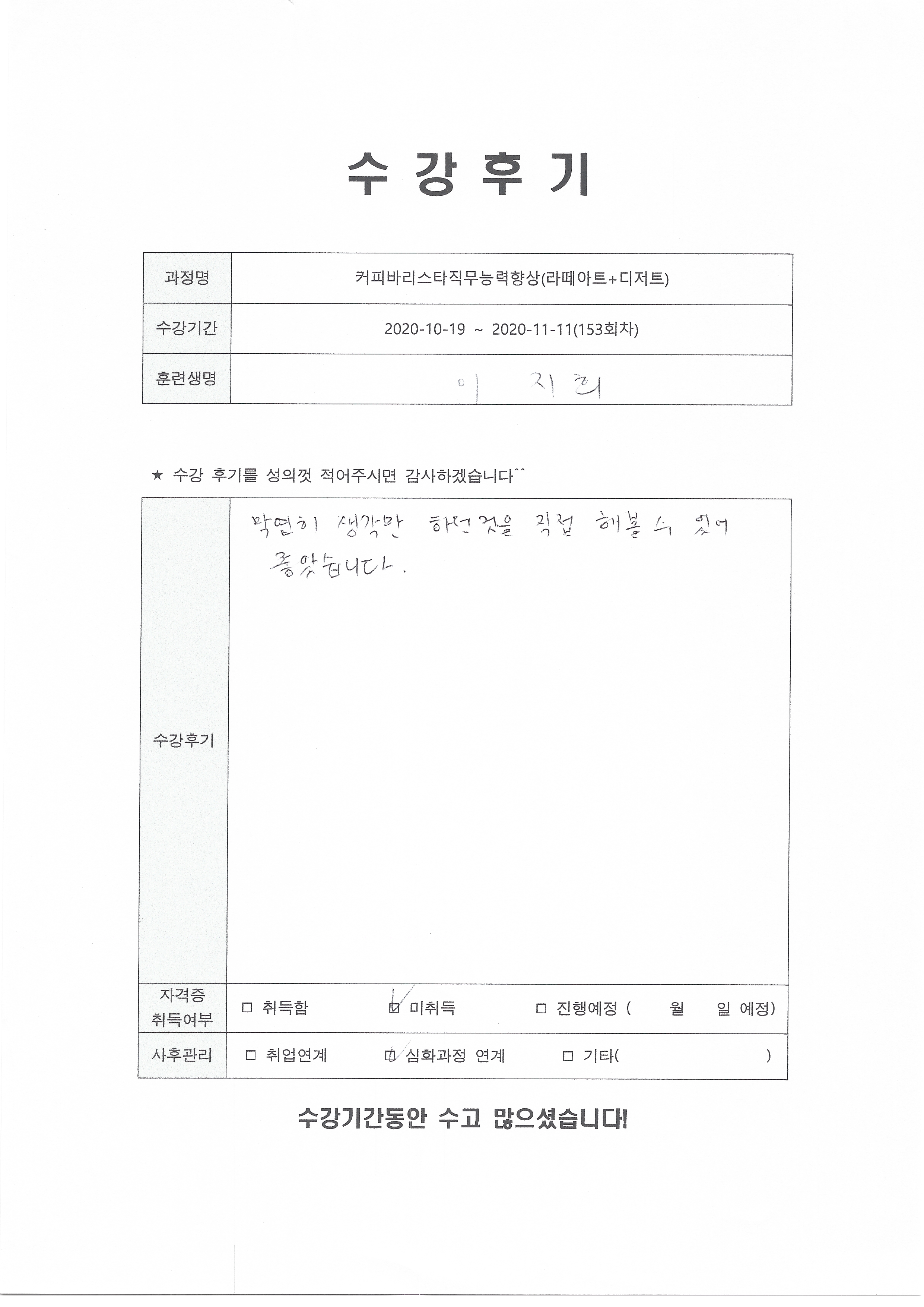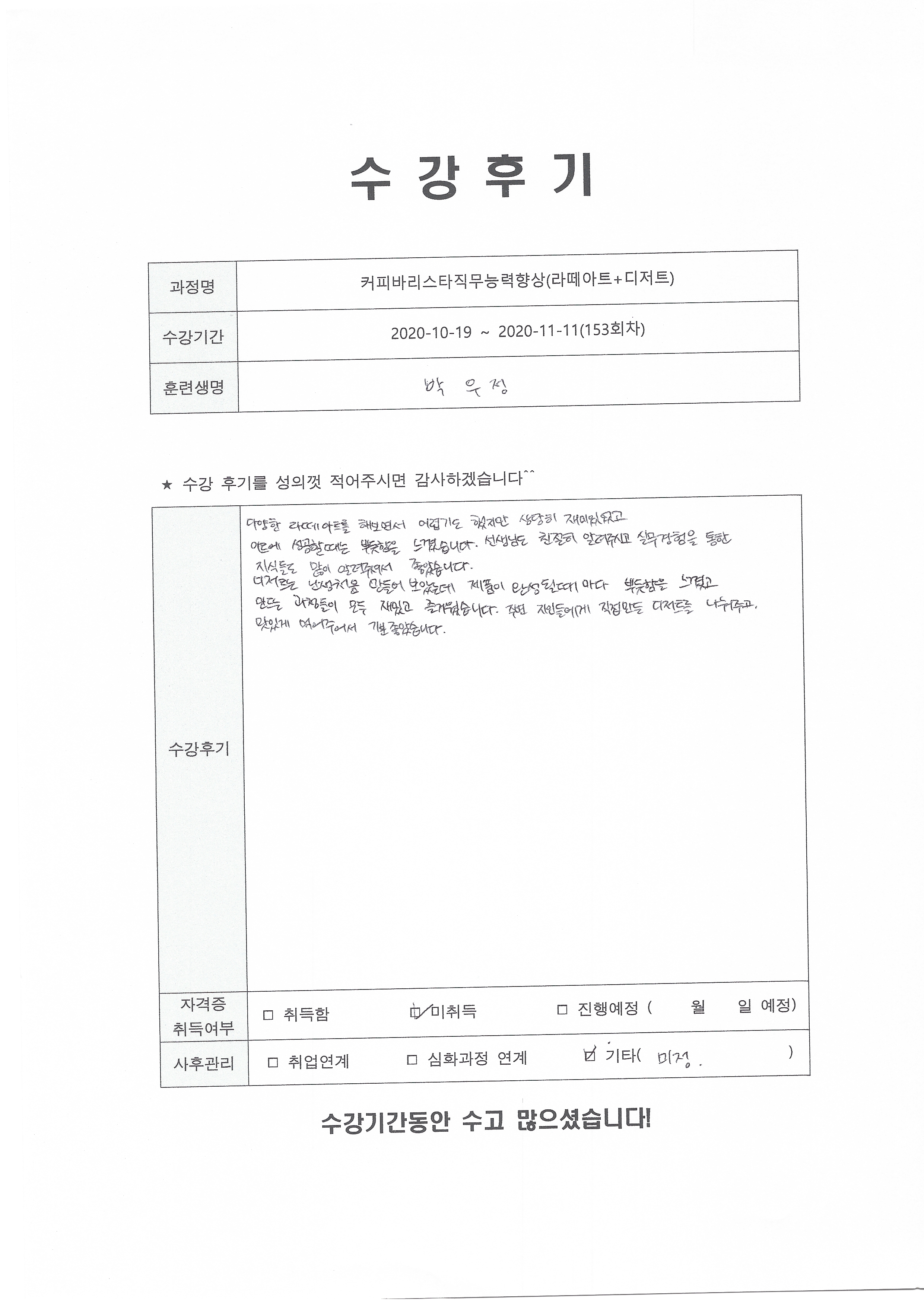 커피바리스타직무능력향상 (라떼아트+디저트)(153회차) 수강평