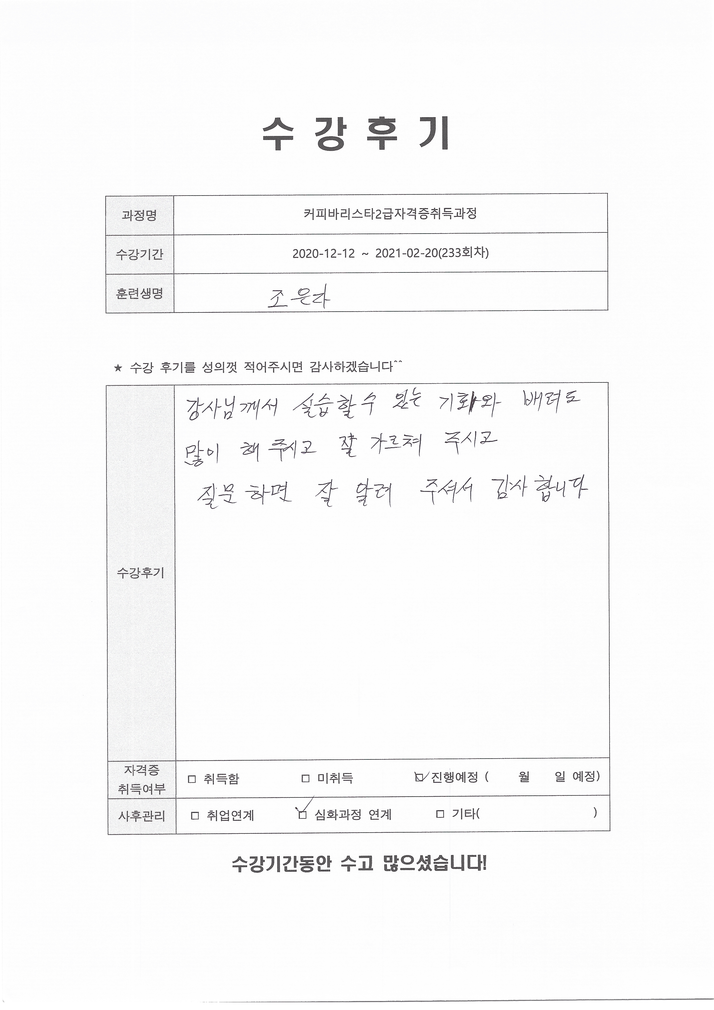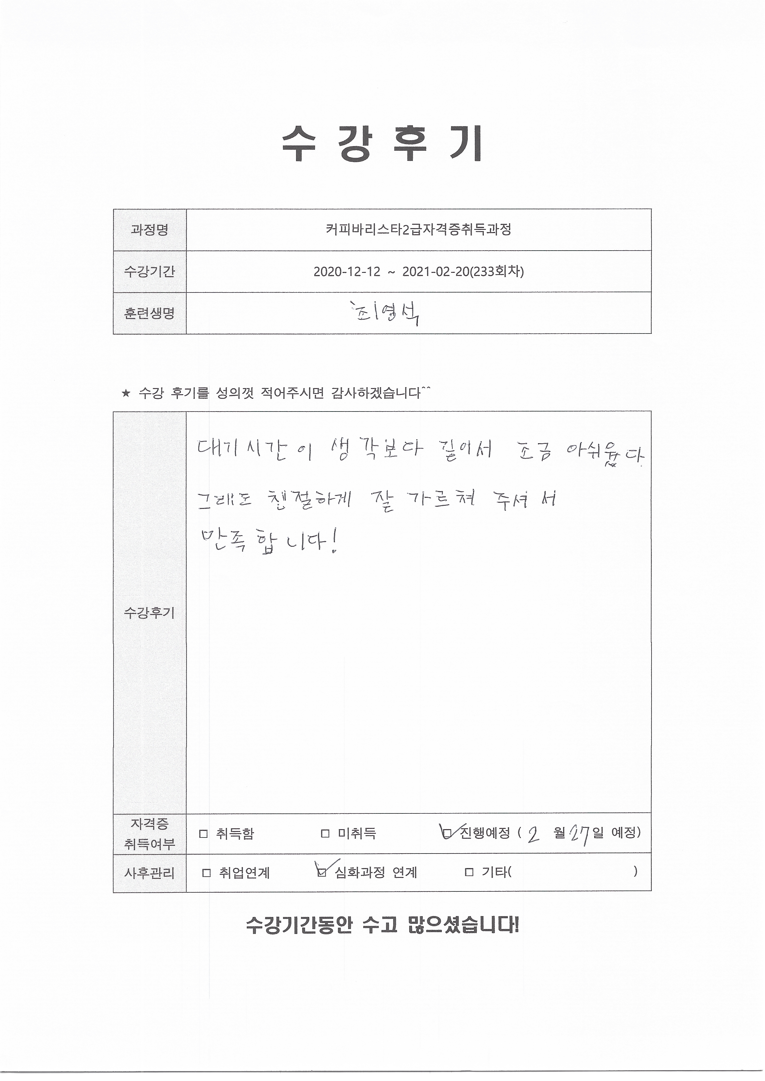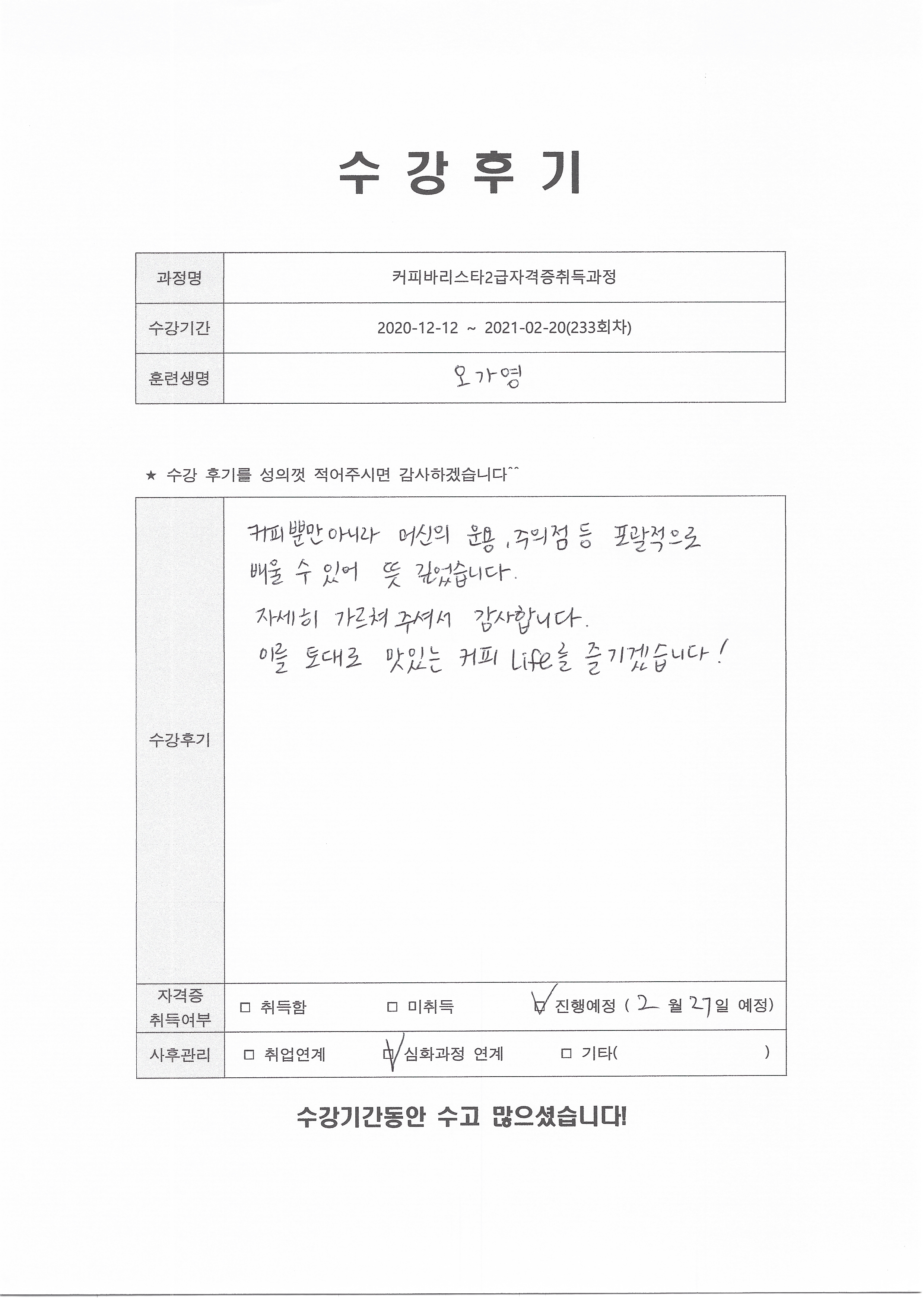 커피바리스타2급자격증취득과정 (233회차) 수강평