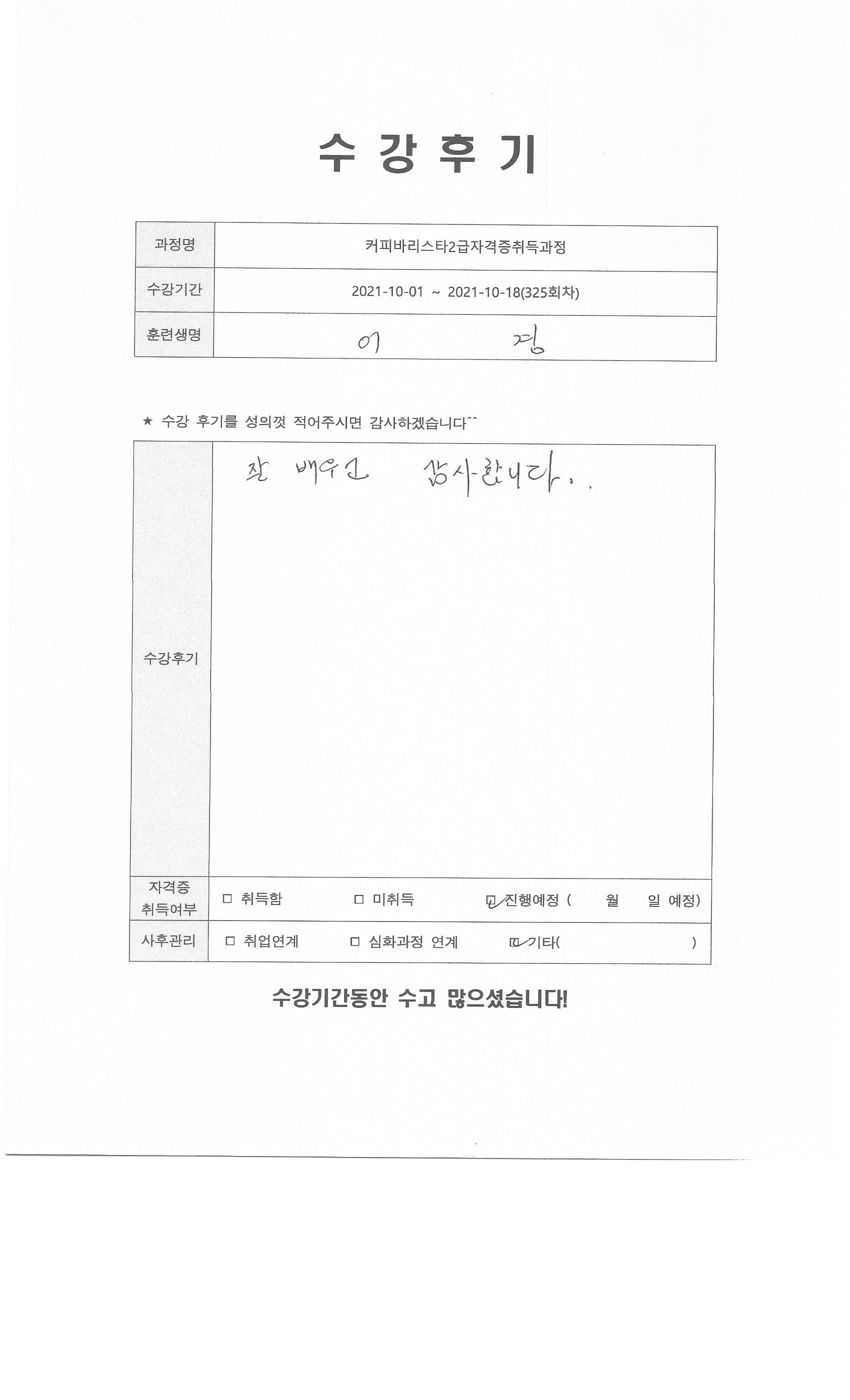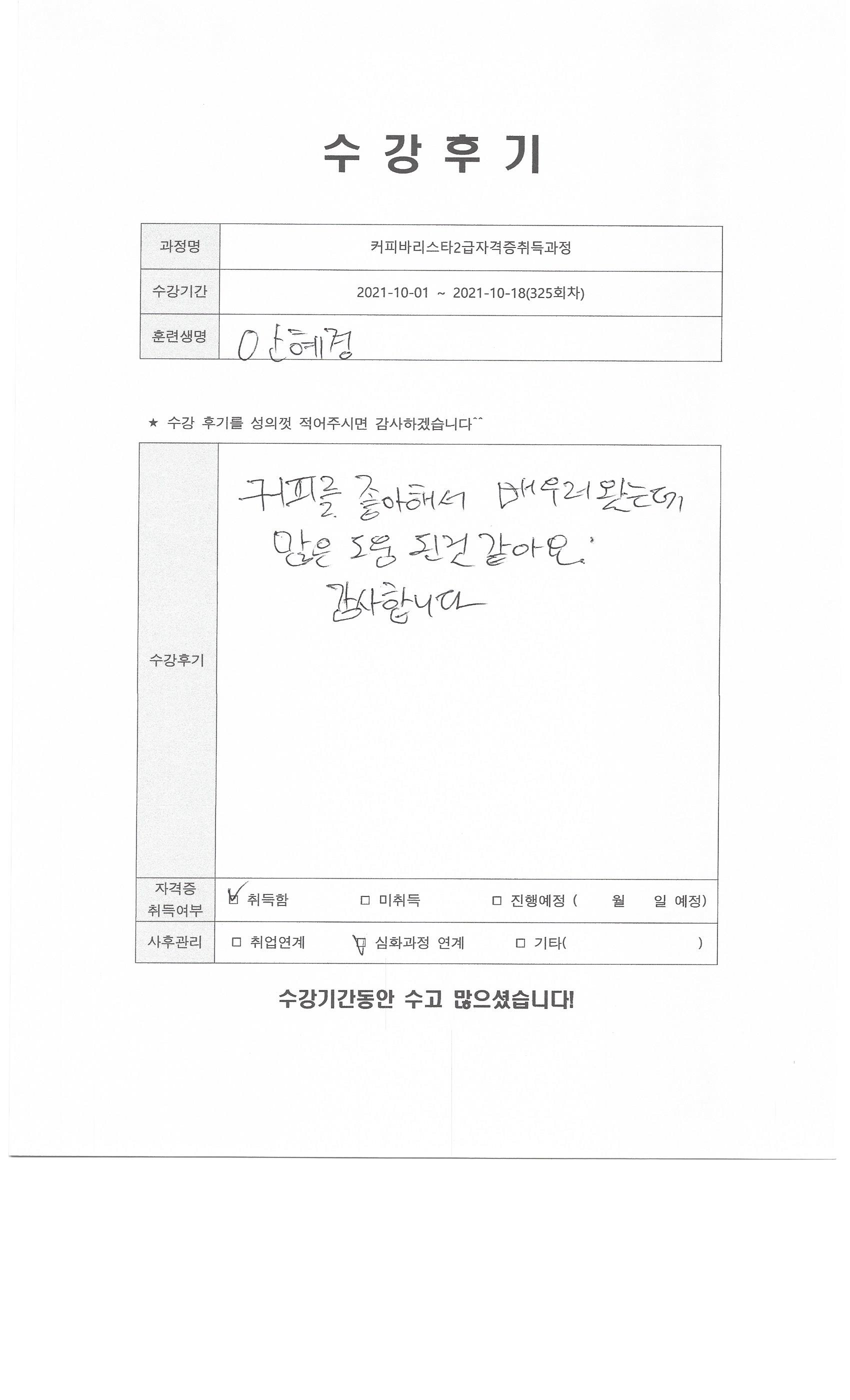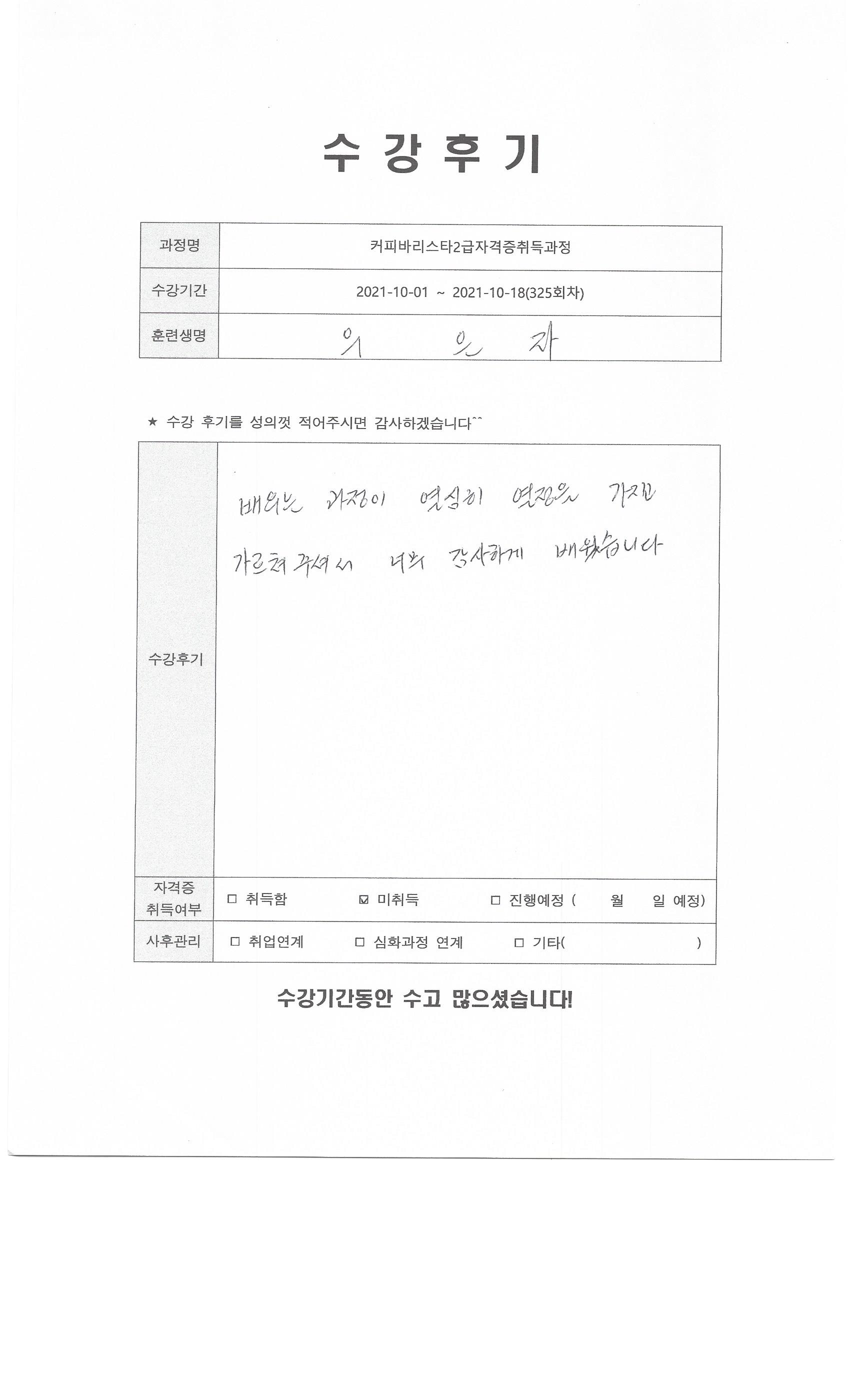 커피바리스타2급자격증취득과정 (325회차) 수강평