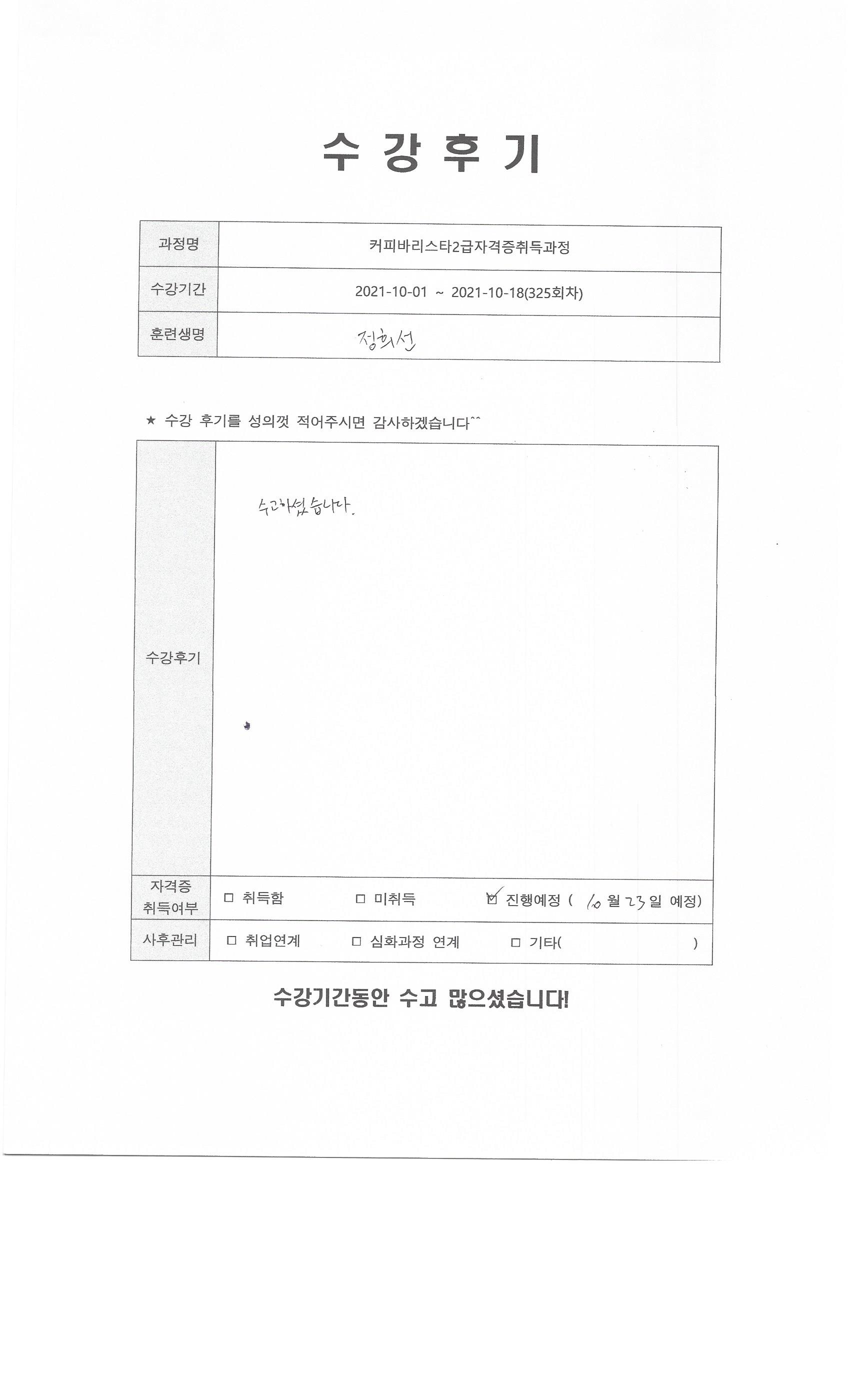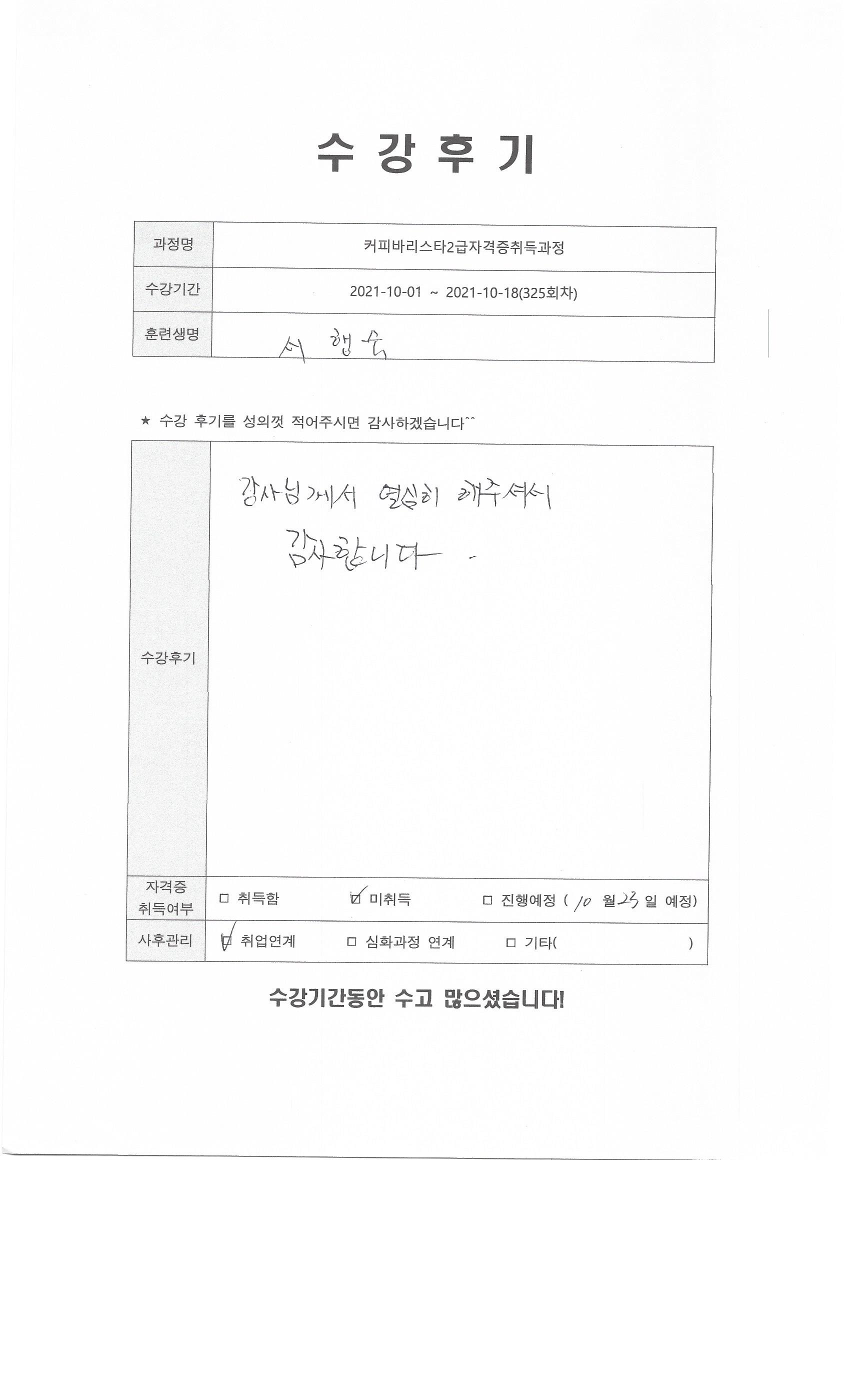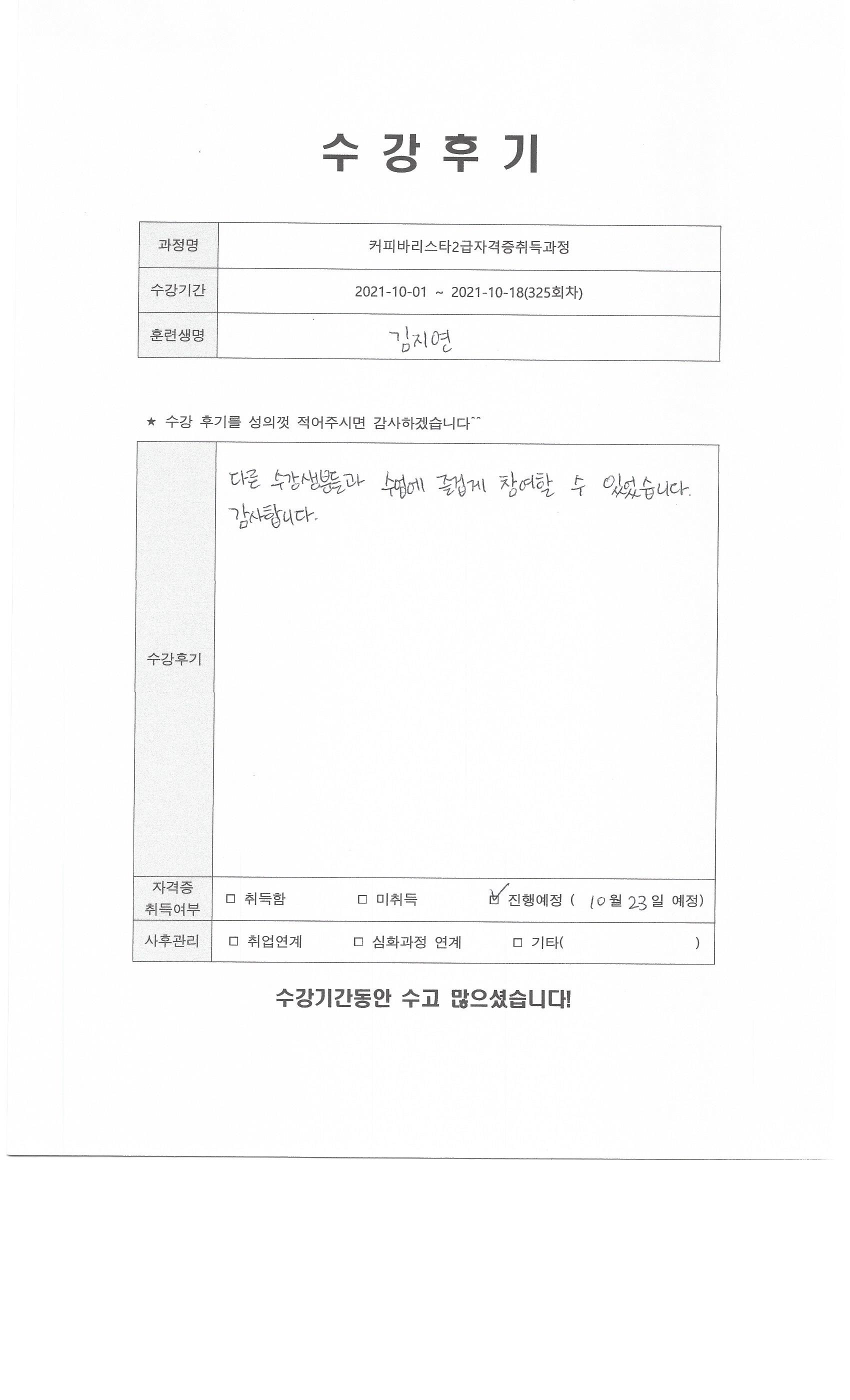 커피바리스타2급자격증취득과정 (325회차) 수강평