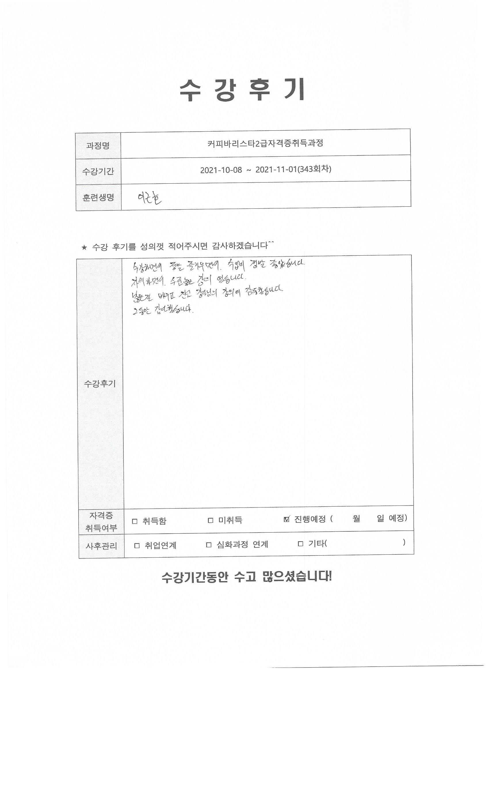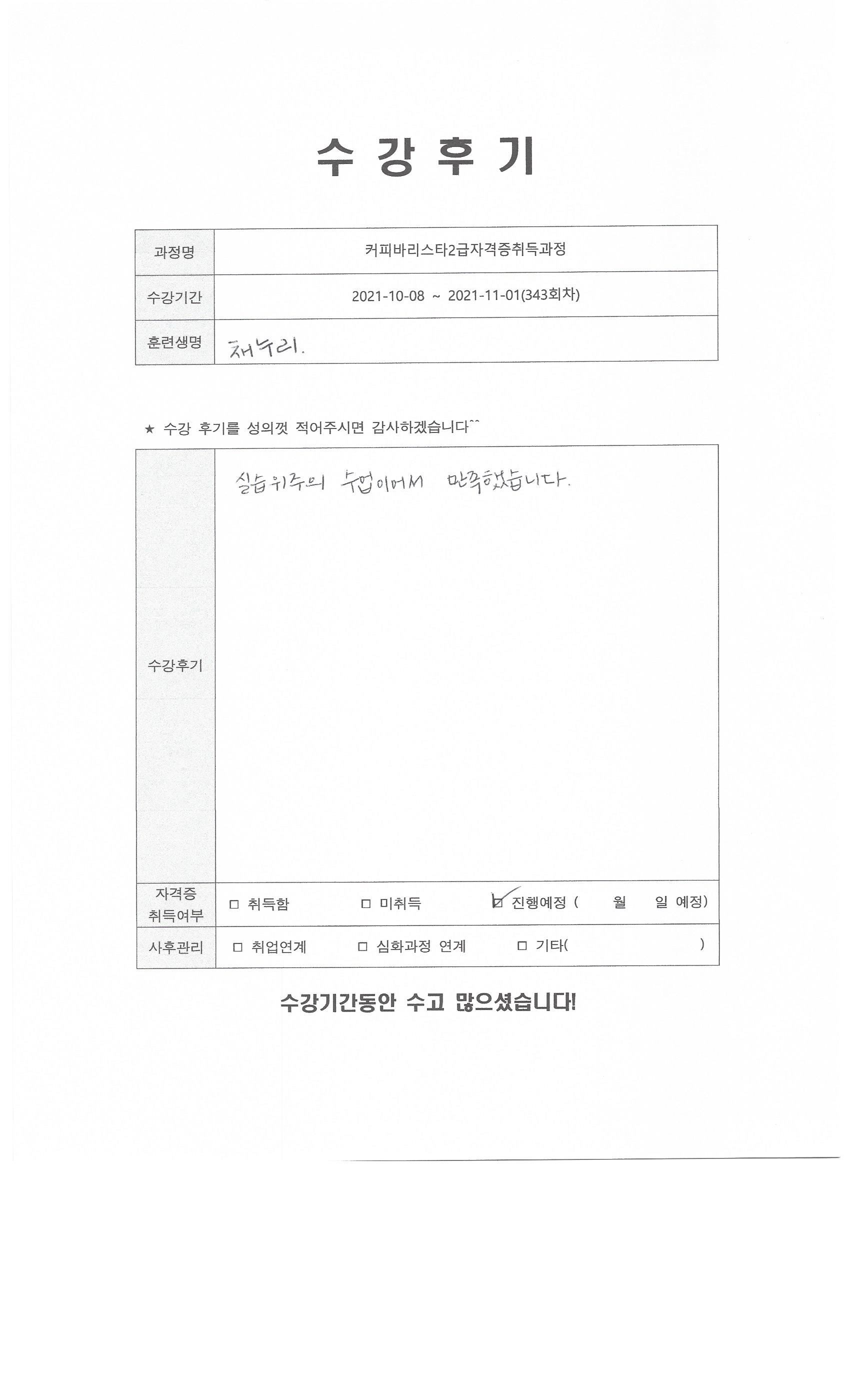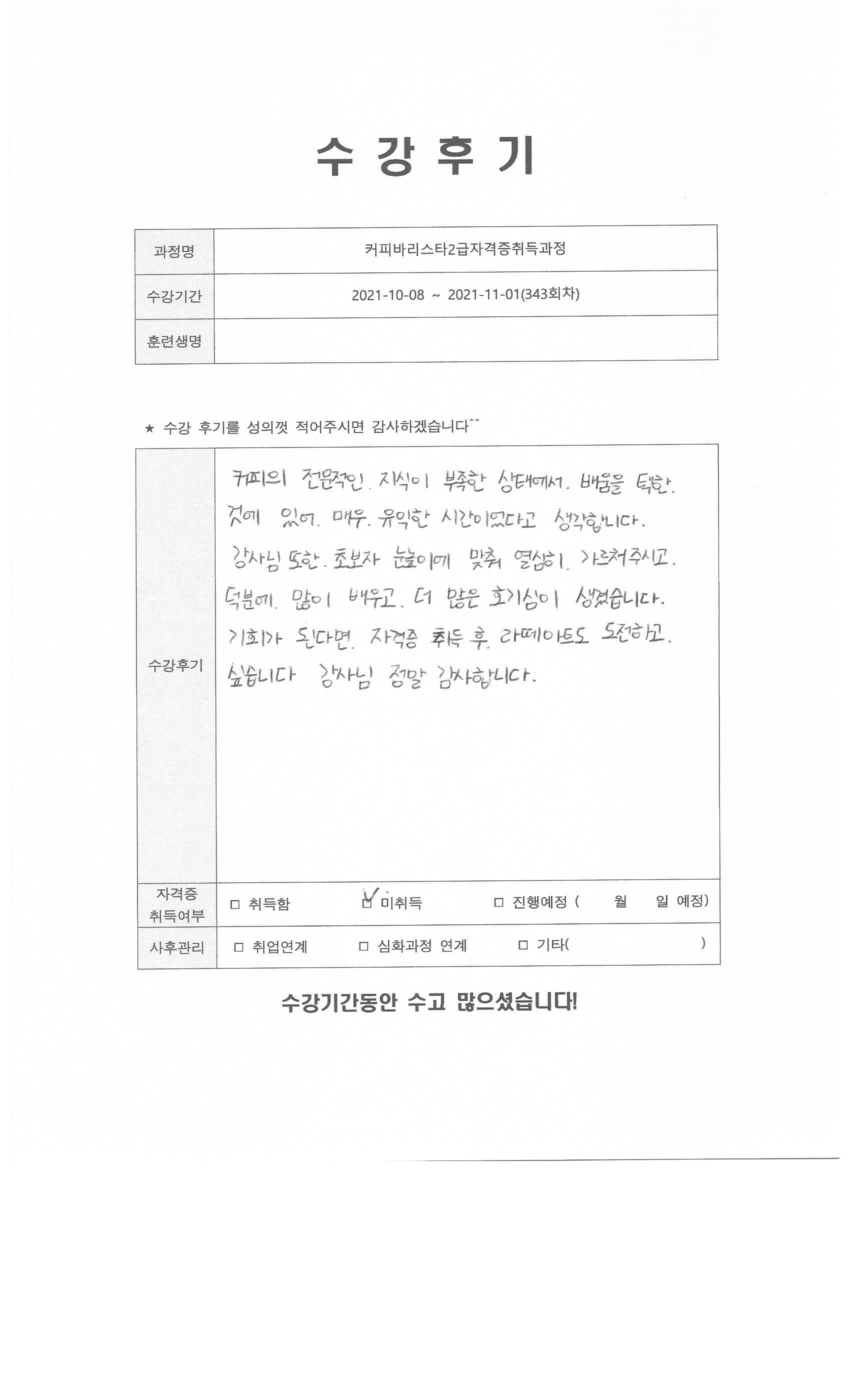 커피바리스타2급자격증취득과정 (343회차) 수강평