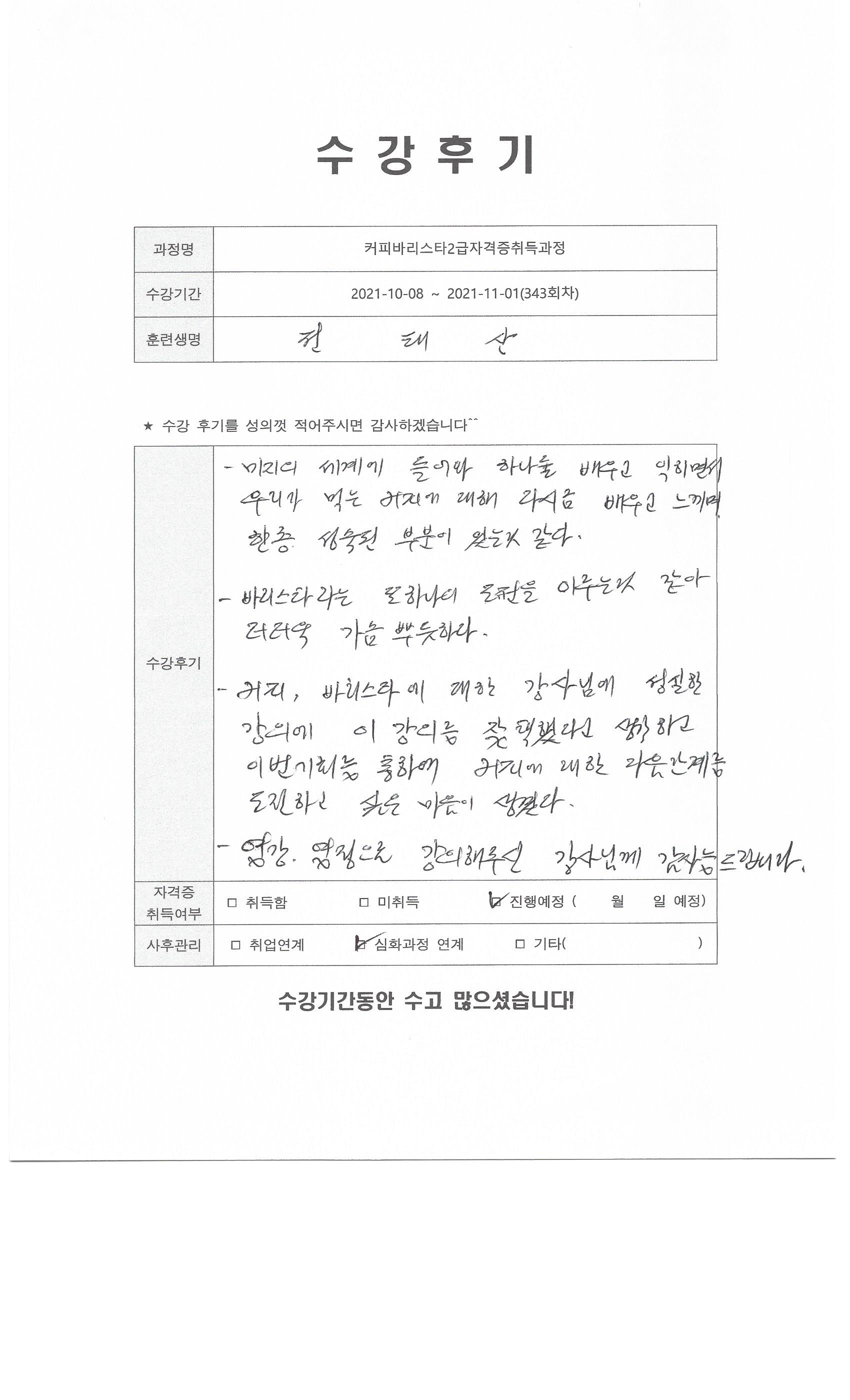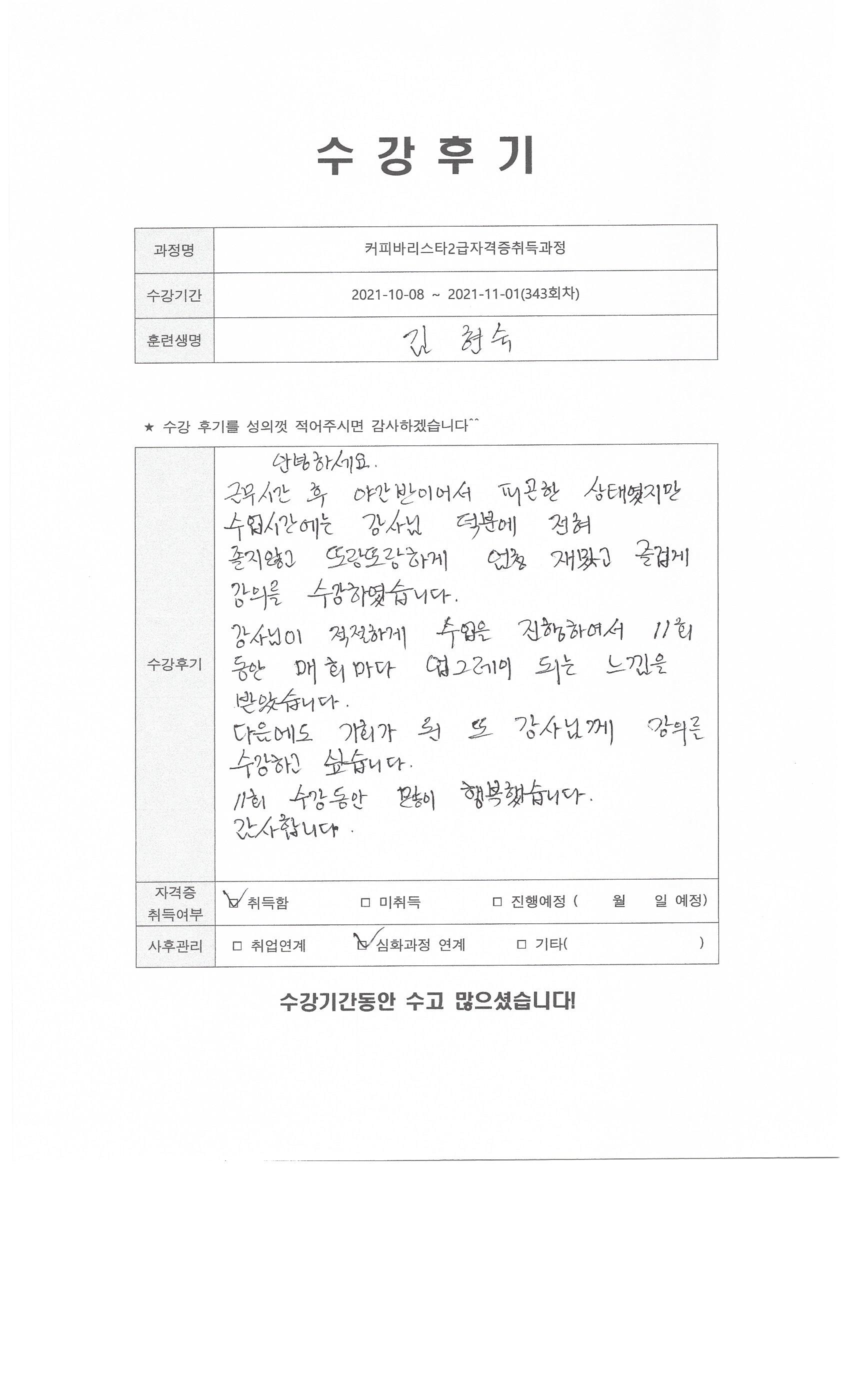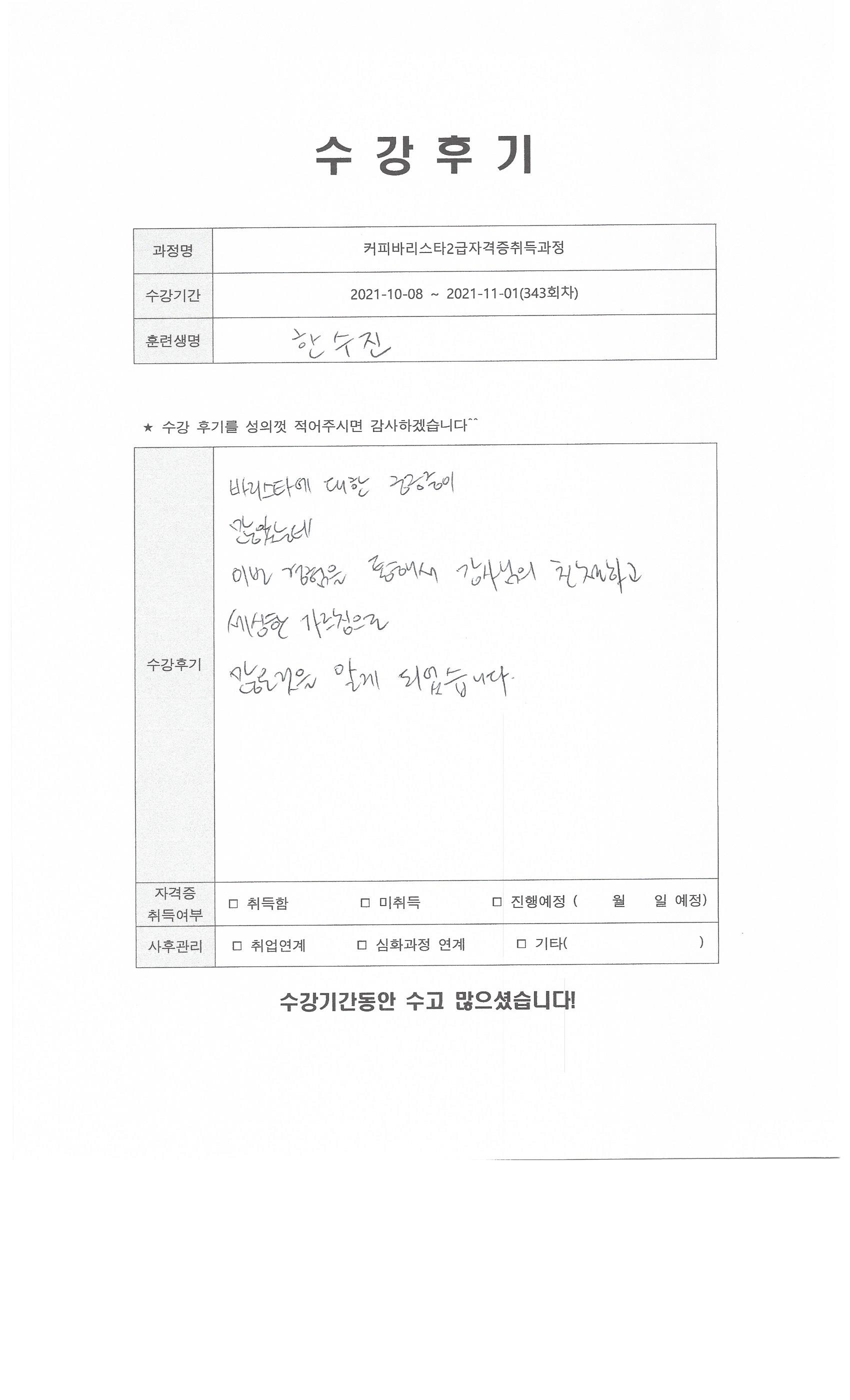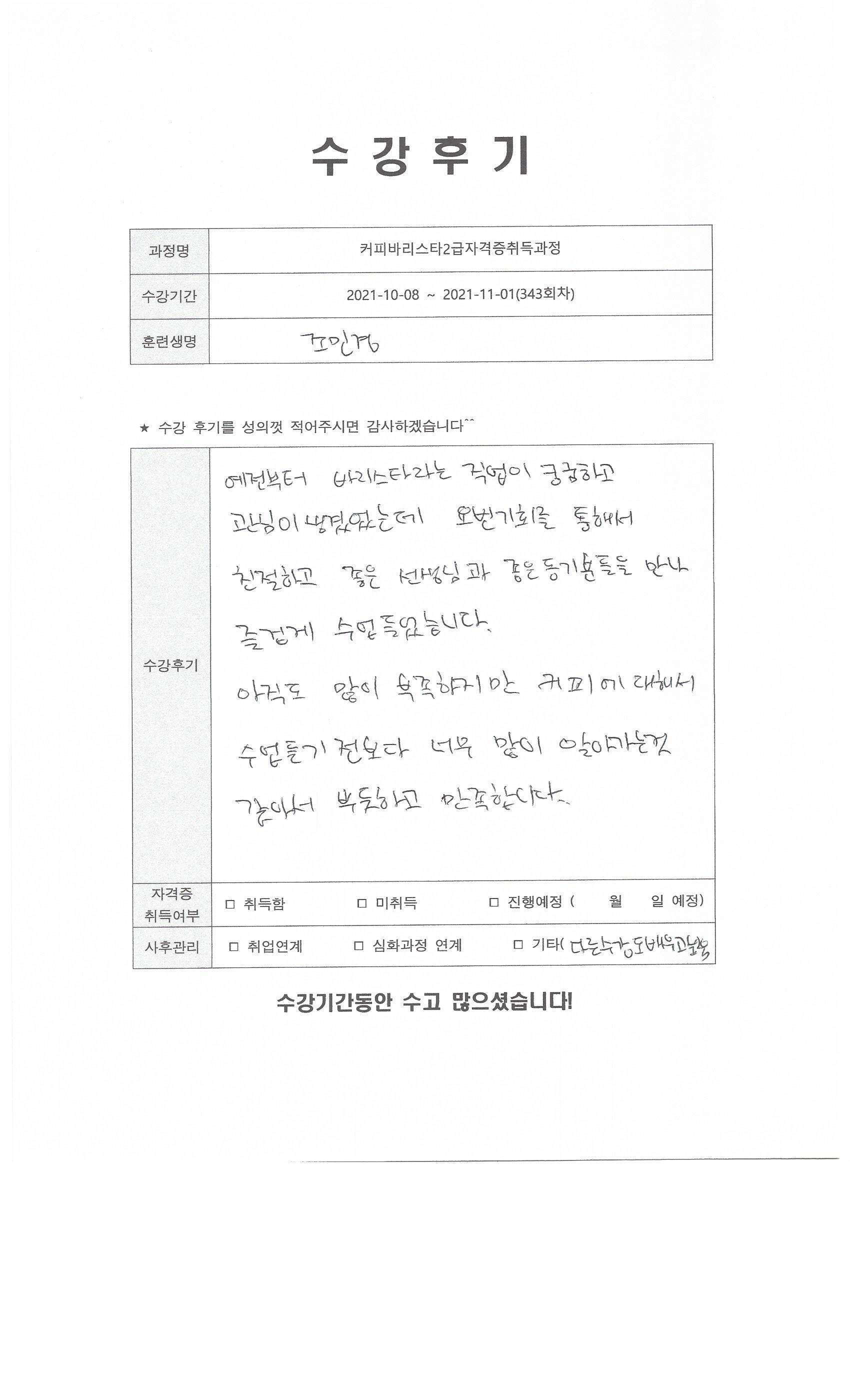 커피바리스타2급자격증취득과정 (343회차) 수강평