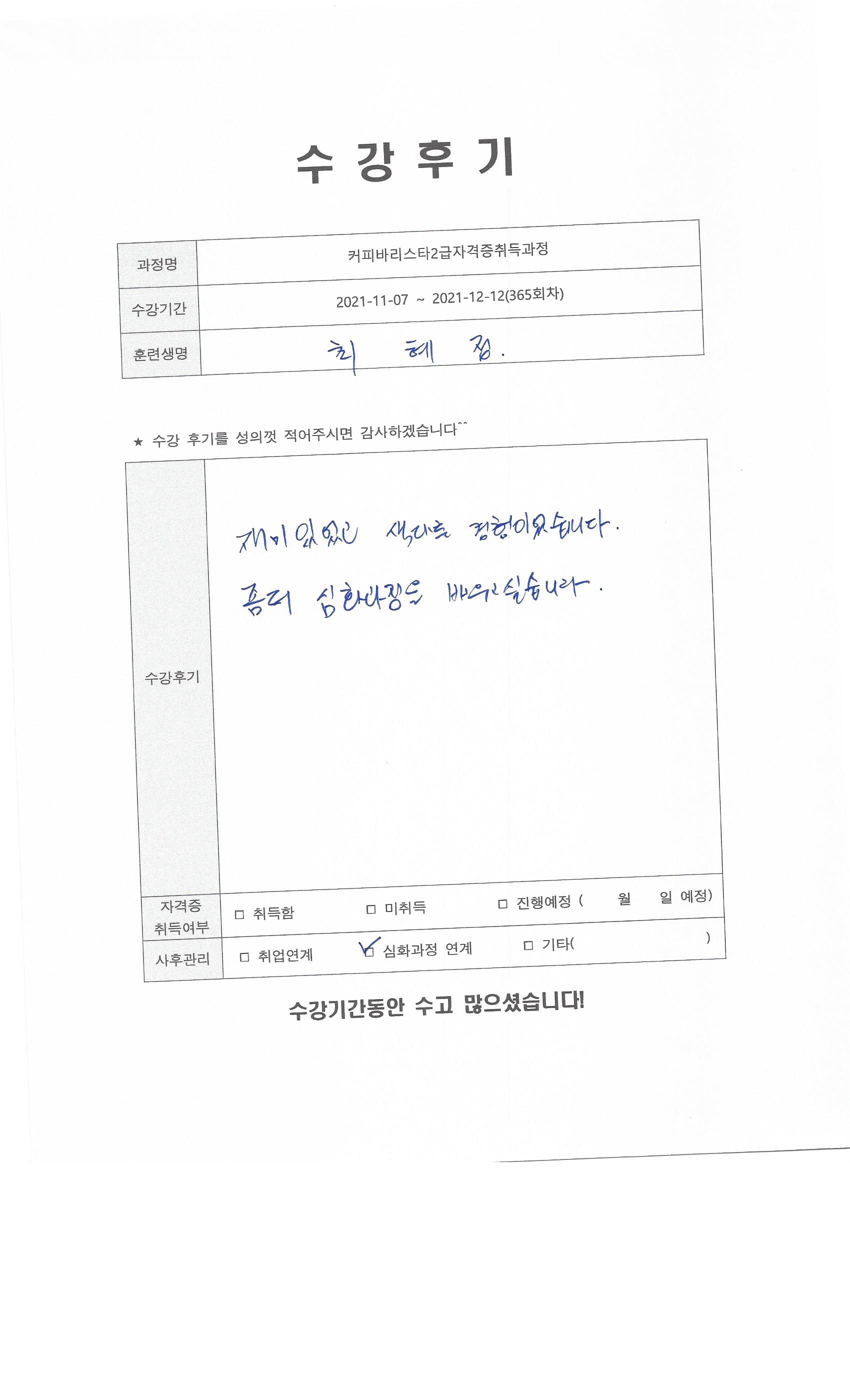 커피바리스타2급자격증취득과정 (365회차) 수강평
