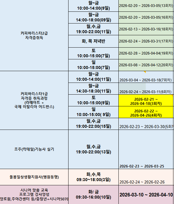 부천커피요리제빵학원 2~3월 개강일정표 안내
